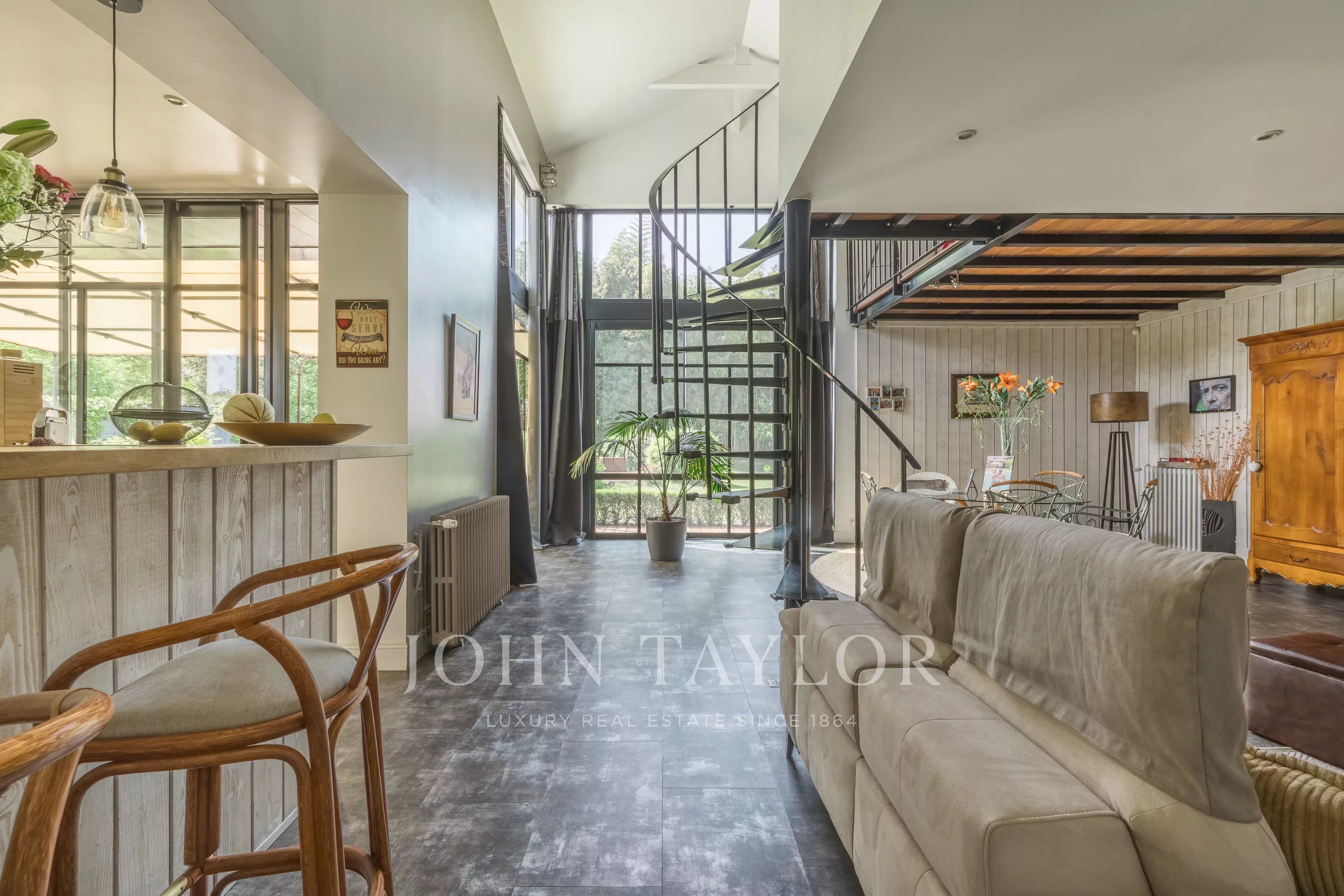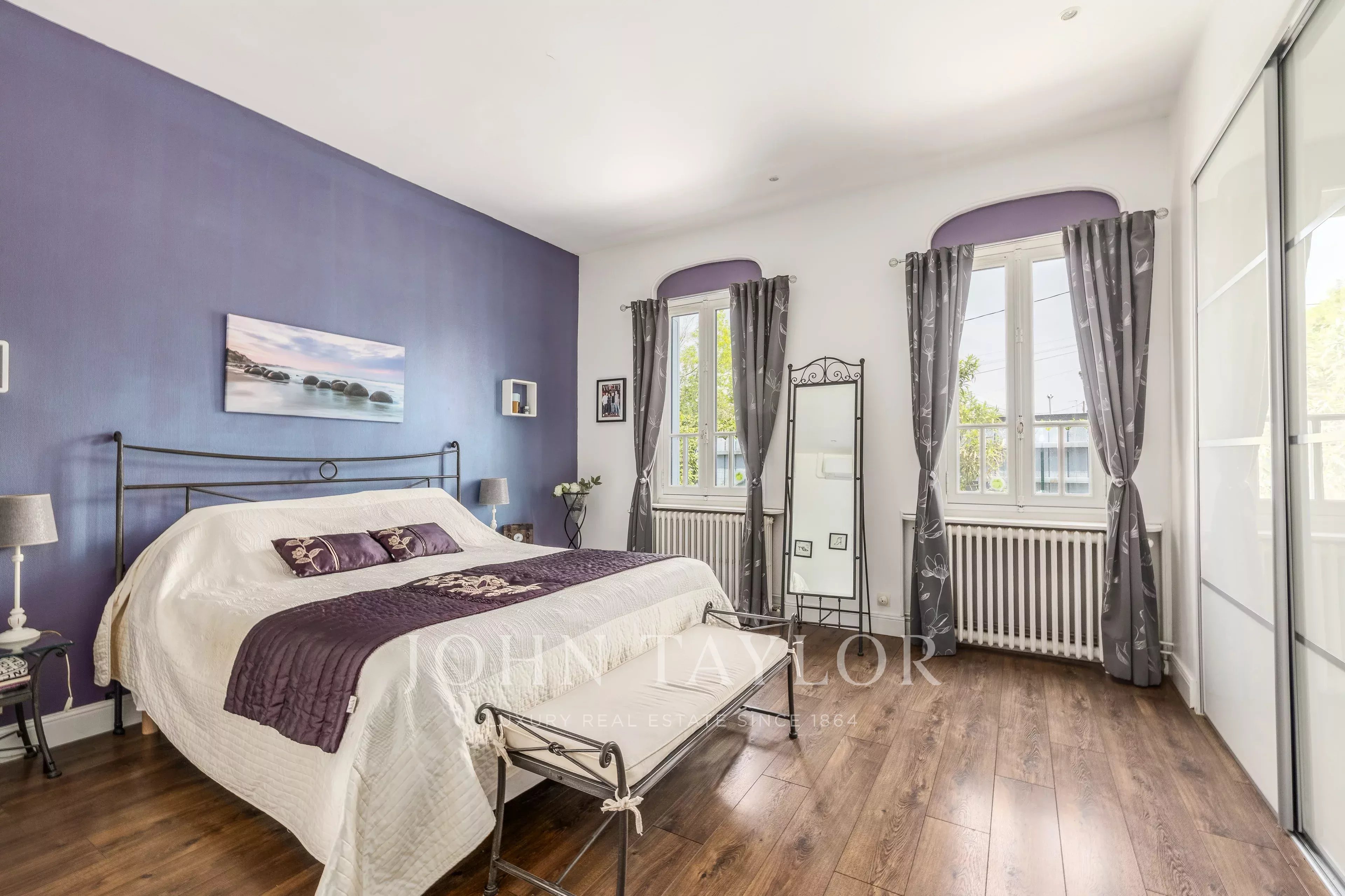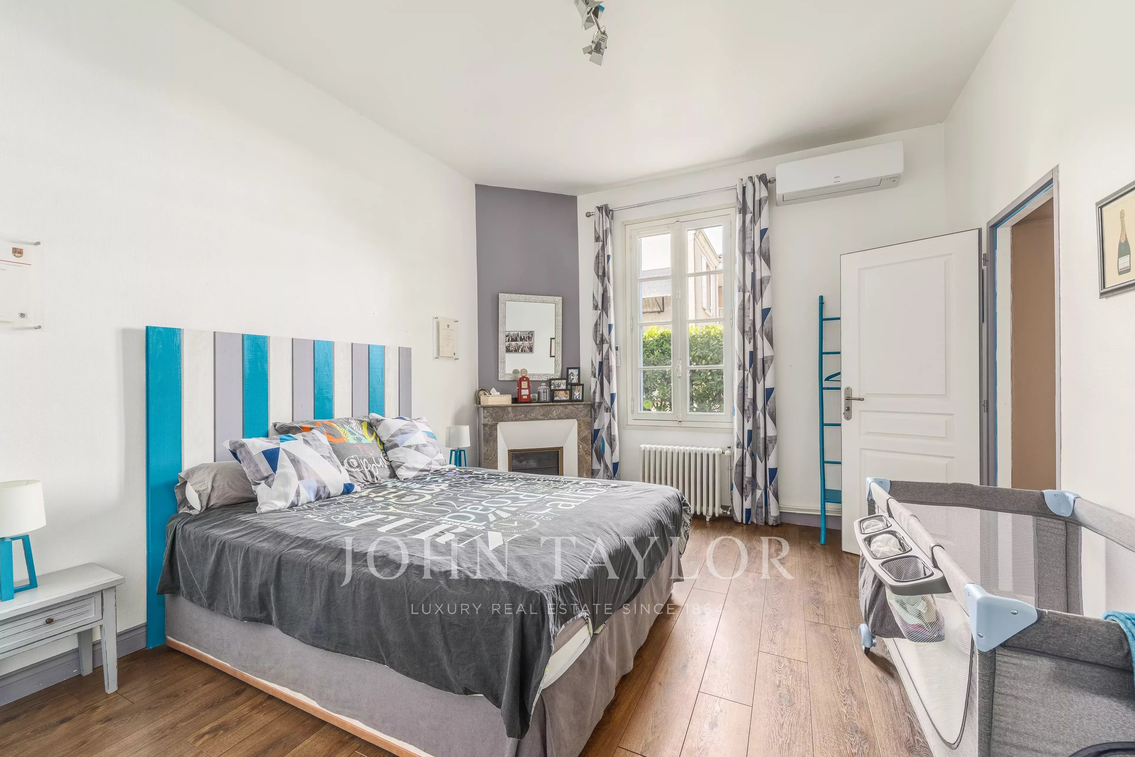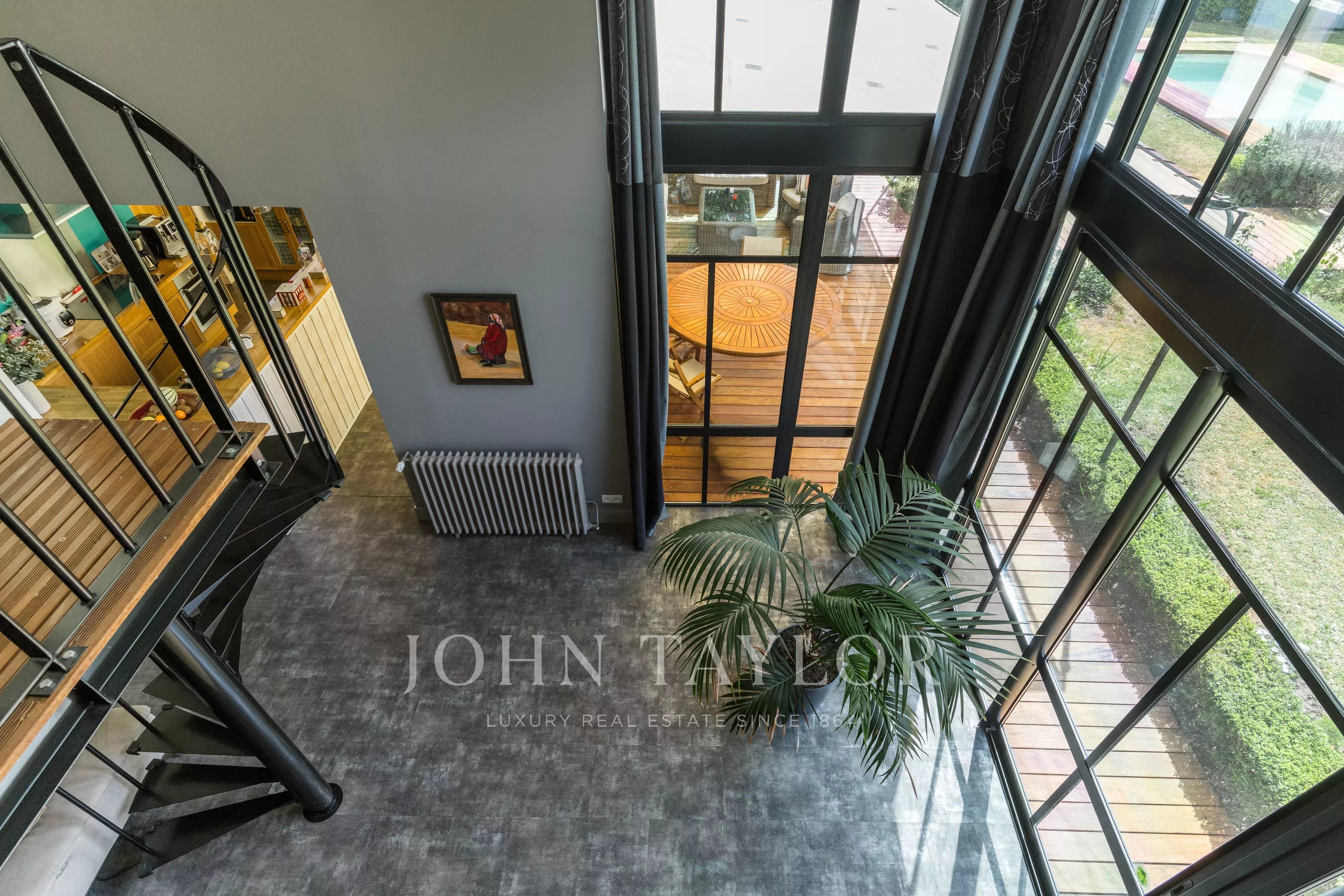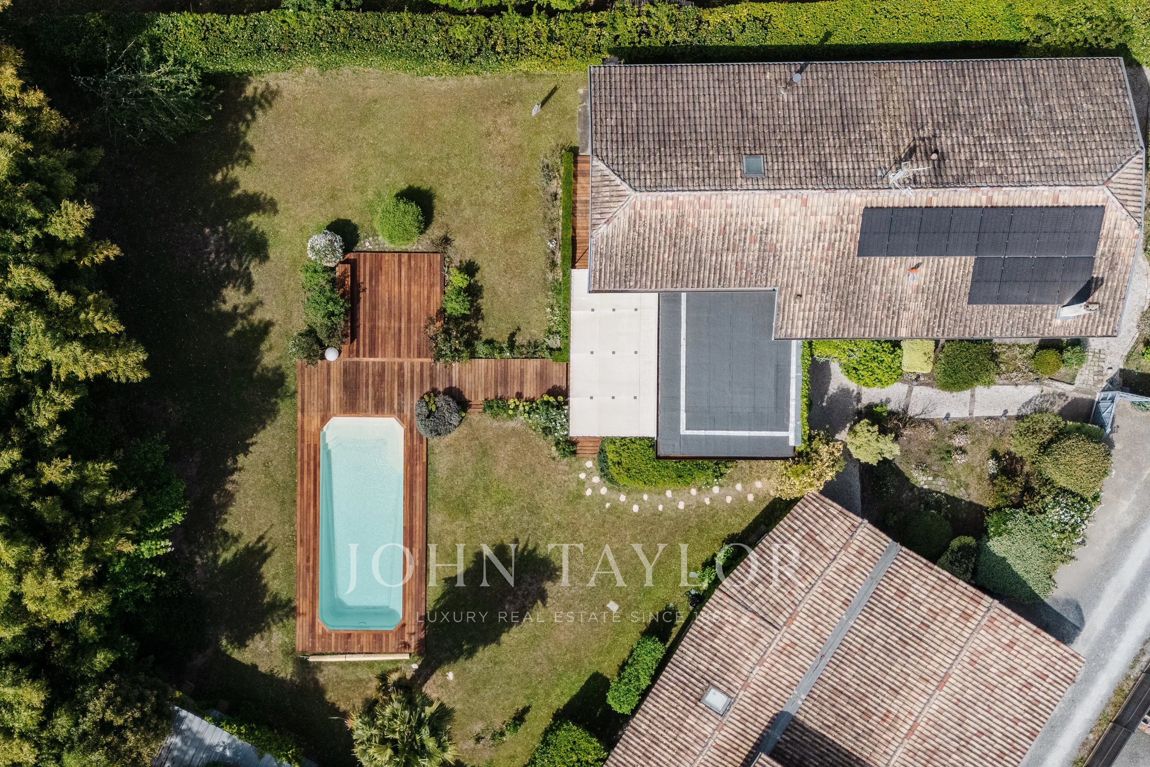Cette ancienne maison de vigneron de style arcachonnais développe, entre la maison principale et ses dépendances, 238 m² habitables au cœur d’un beau terrain arboré de 1900 m² avec piscine. Rénovée avec soin, elle allie le charme de l’ancien à un confort moderne.