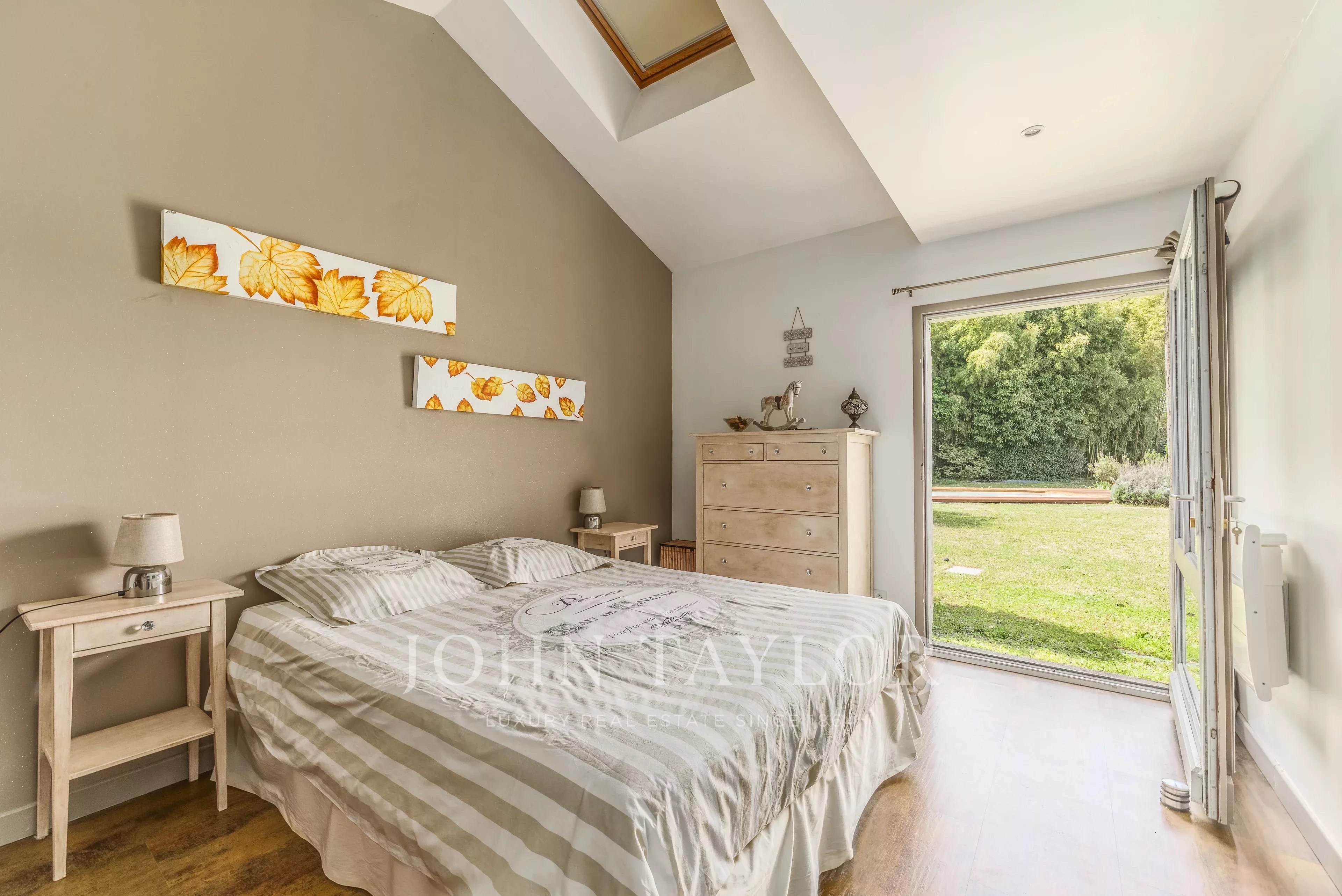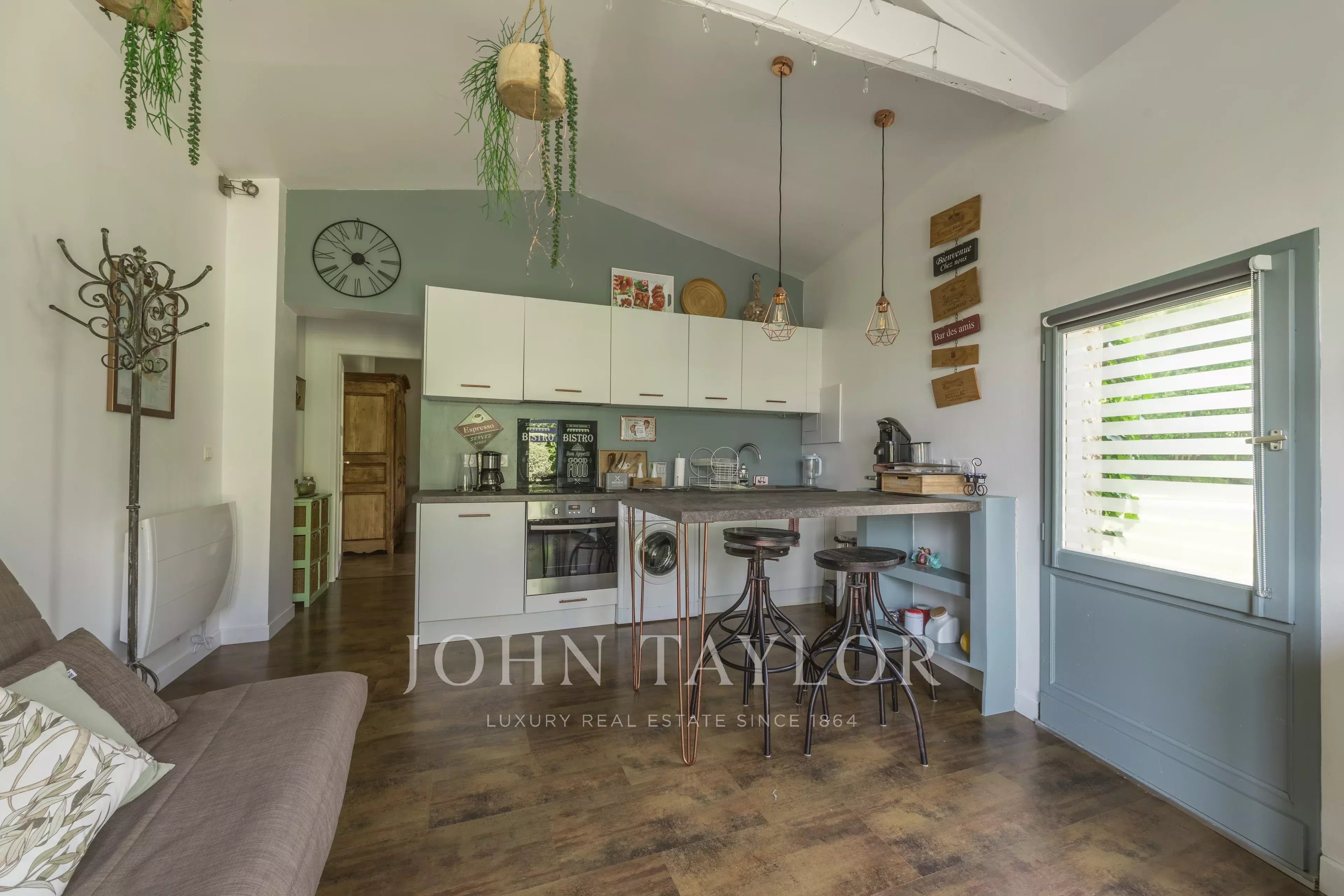 À l’extérieur, une piscine chauffée au sel de 9x4 mètres, avec volet automatique, s’intègre parfaitement dans un environnement calme et verdoyant. Un appartement indépendant de 35 m² avec cuisine, salle d’eau et chambre complète l’ensemble, ainsi qu’un bureau avec une pièce attenante, idéal pour une activité professionnelle.