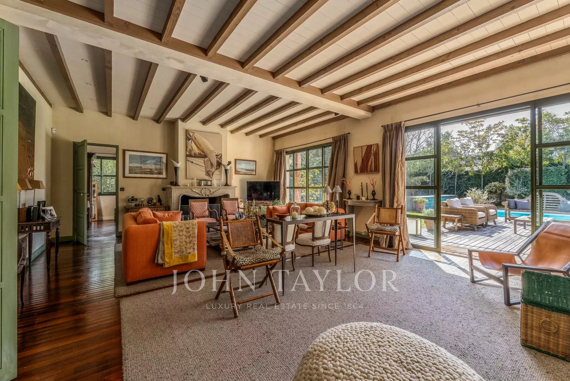 Le rez-de-chaussée s’ouvre sur une entrée spacieuse desservant un bureau, un vaste double séjour avec cheminée, une salle à manger et une grande cuisine dinatoire avec cheminée. L’ensemble profite d’un accès direct à la terrasse et à la piscine, créant une belle continuité entre intérieur et extérieur.
