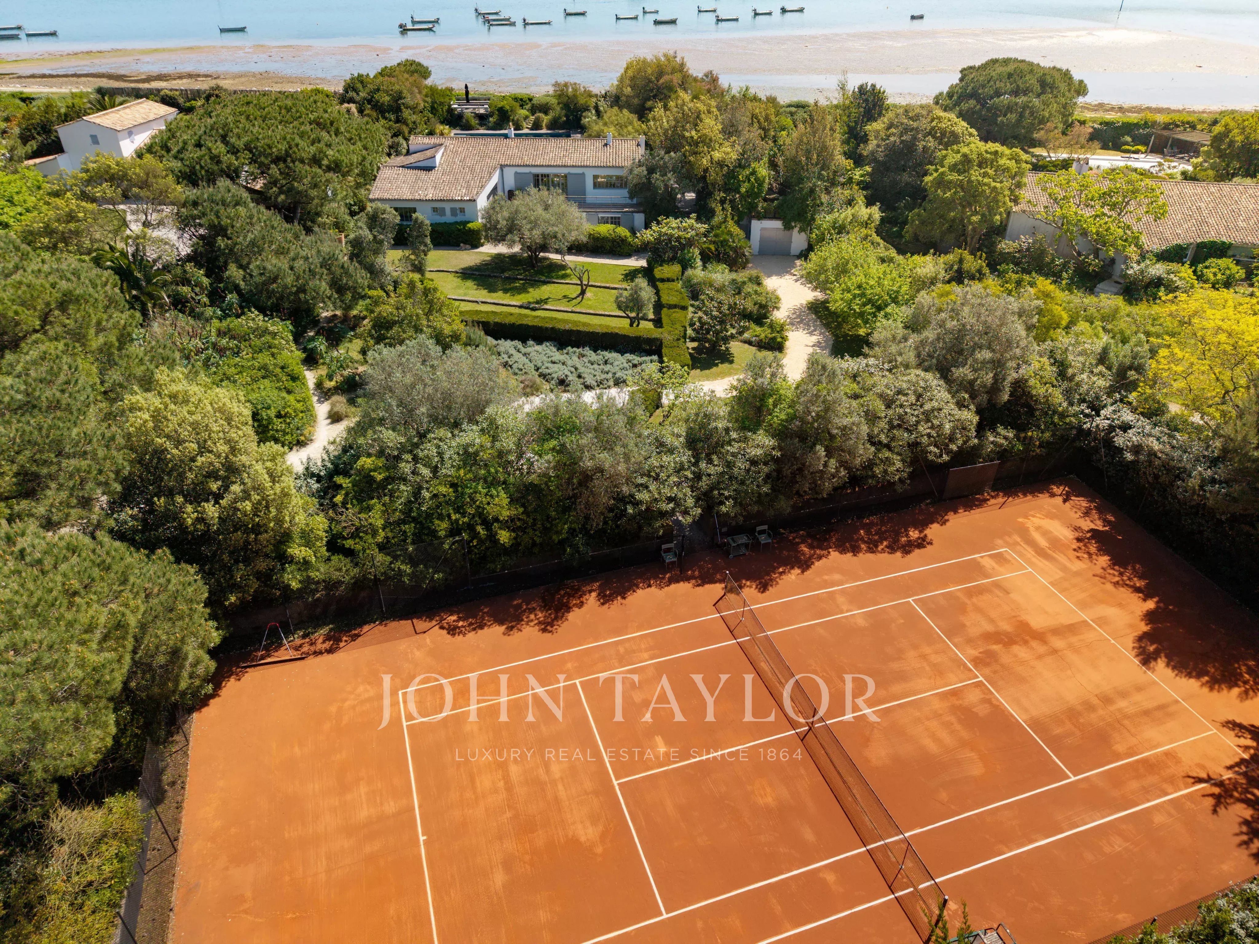 À l’extérieur, le domaine révèle des équipements rares sur l’île de Ré : une piscine d’environ 100 m², véritable bassin de nage, un court de tennis en terre battue équipé d’une membrane absorbante permettant un séchage optimal, ainsi qu’un parc paysager remarquable aux essences variées et matures, créant une ambiance élégante et naturelle. L’accès direct à la plage et la quiétude environnante confèrent à cette propriété un caractère exceptionnel, recherché par une clientèle exigeante en quête d’intimité, d’espace et d’un art de vivre unique face à l’océan.