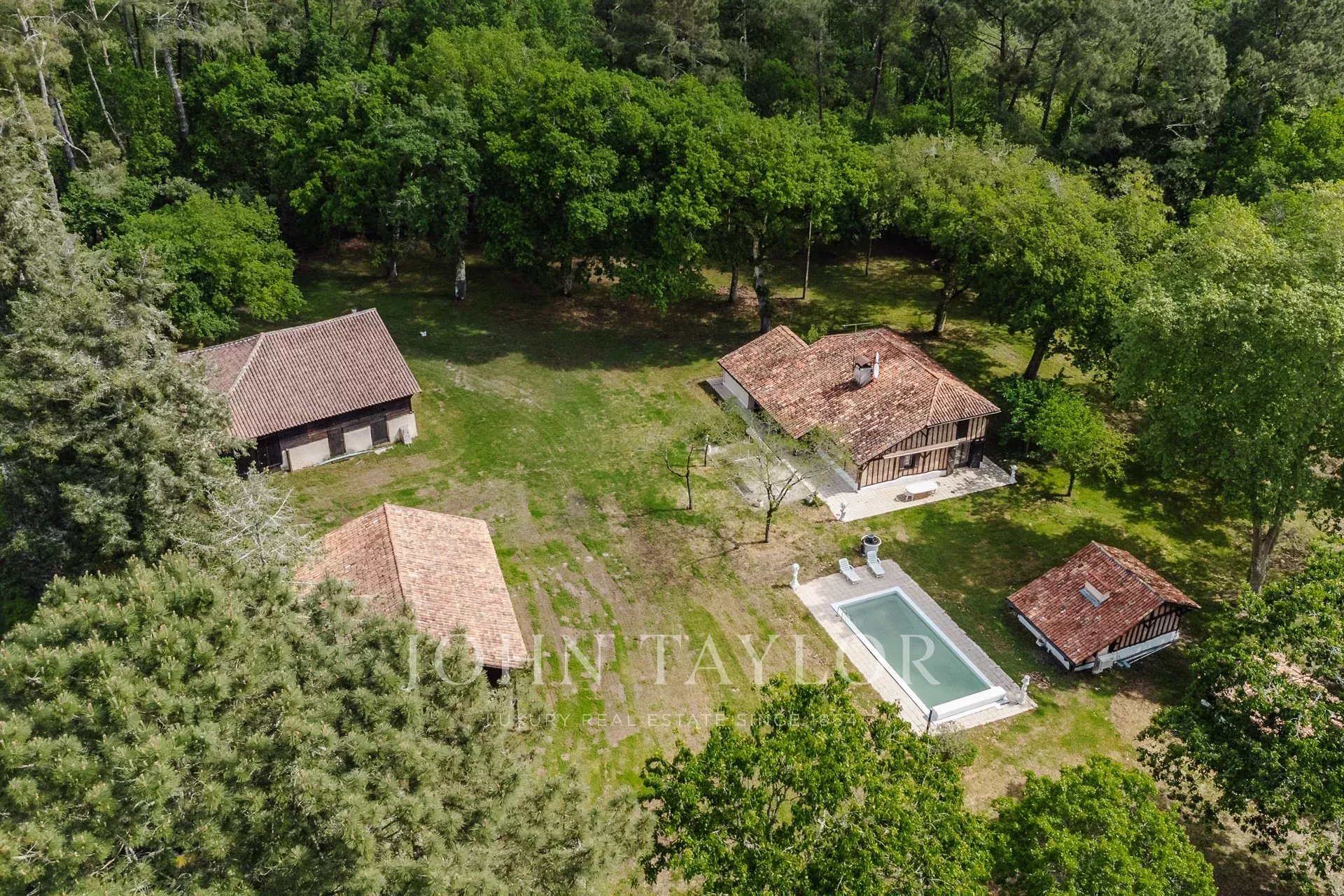 Sur plus de 3,5 hectares de terrain boisé longé par un ruisseau, elle se compose d’un ancien airial typique des Landes, avec une maison principale de plus de 200 m², deux vastes granges de 140 m² et 180 m², un four à pain classé de 22 m² ainsi qu’une dépendance de 16 m².