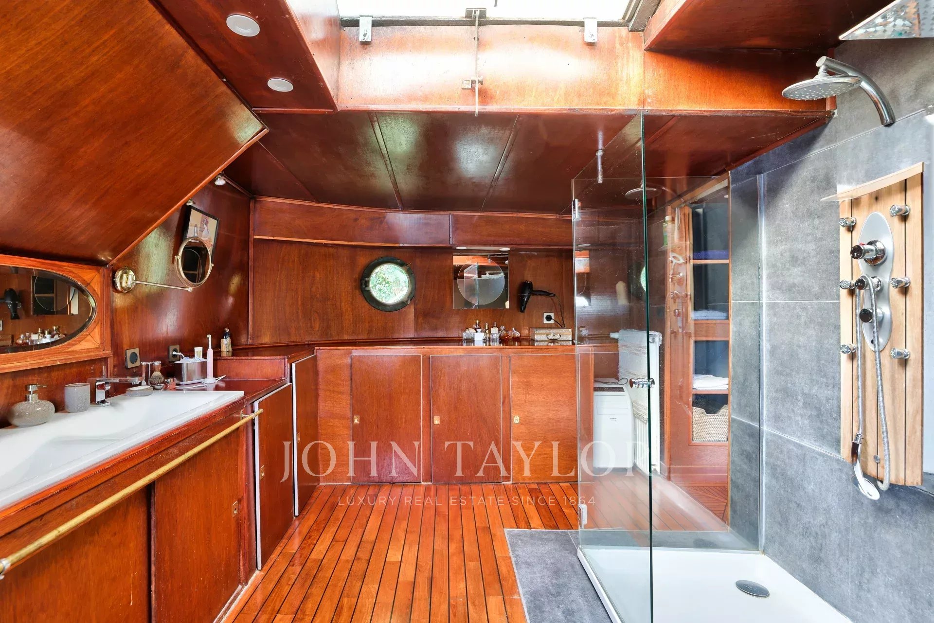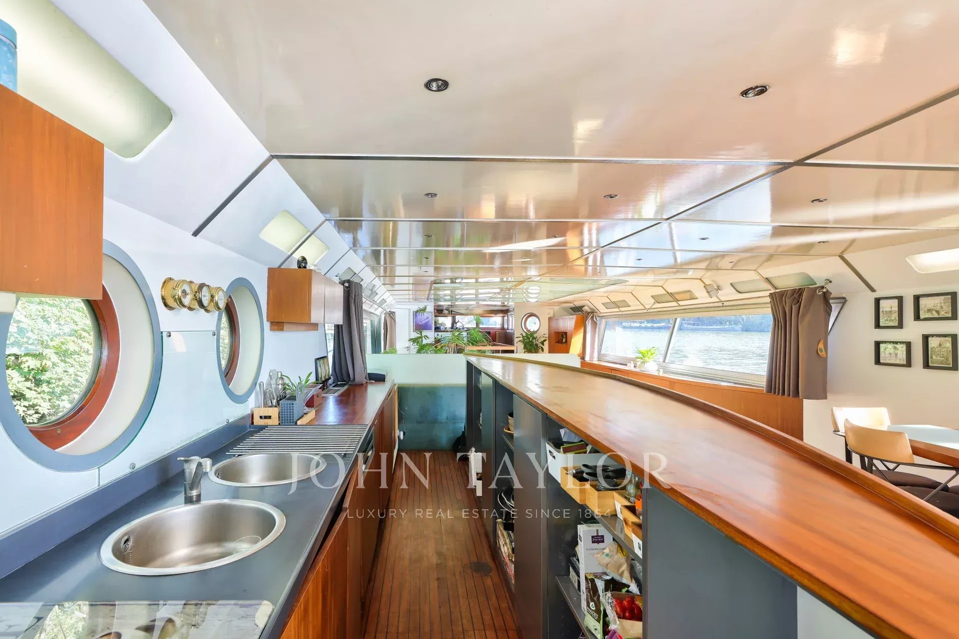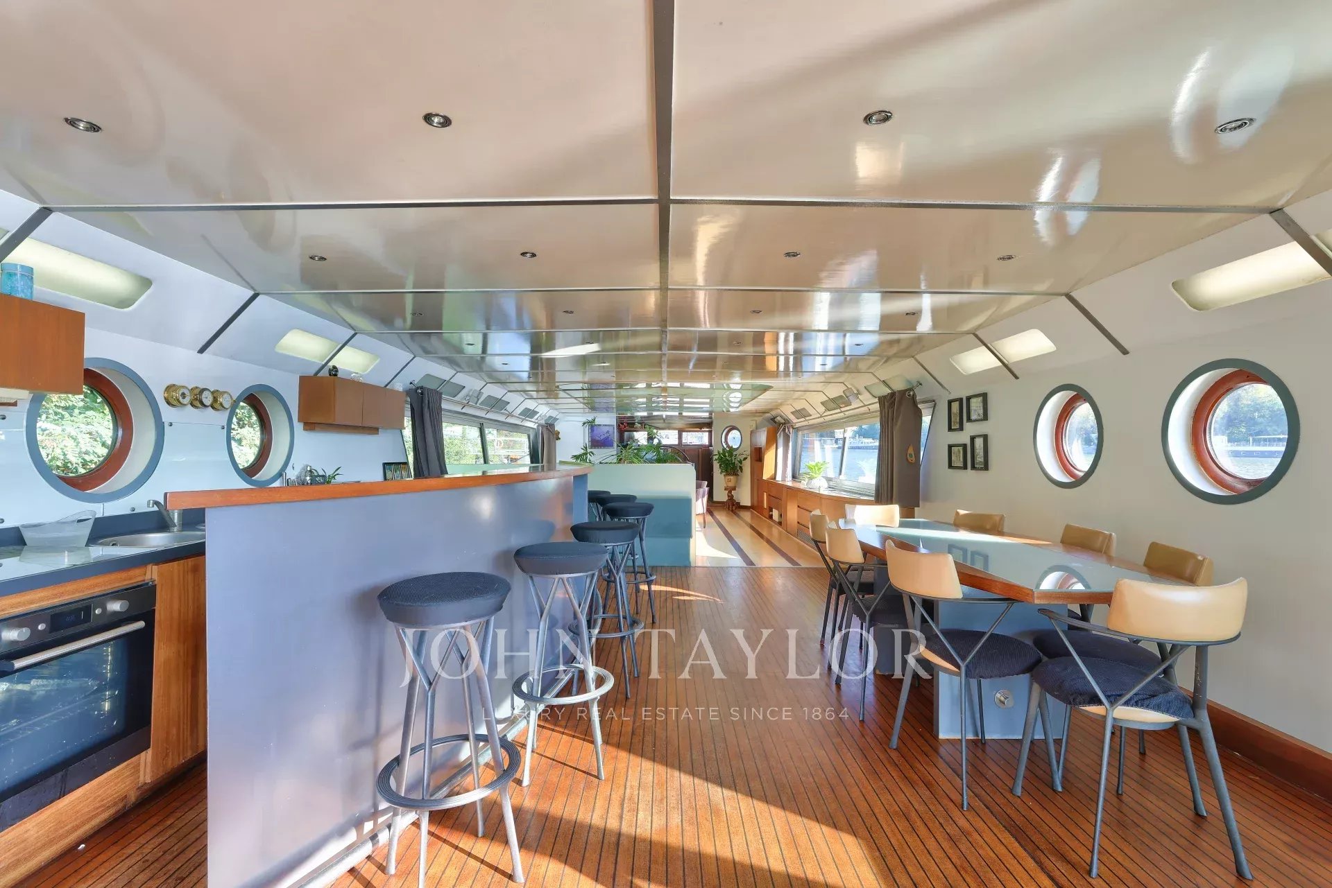 Amarrée dans un environnement paisible à proximité immédiate des commerces, du marché et des transports, cette péniche d’environ 196 m² habitables répartis sur deux niveaux séduit par ses volumes généreux, sa luminosité et sa grande terrasse de 60 m².