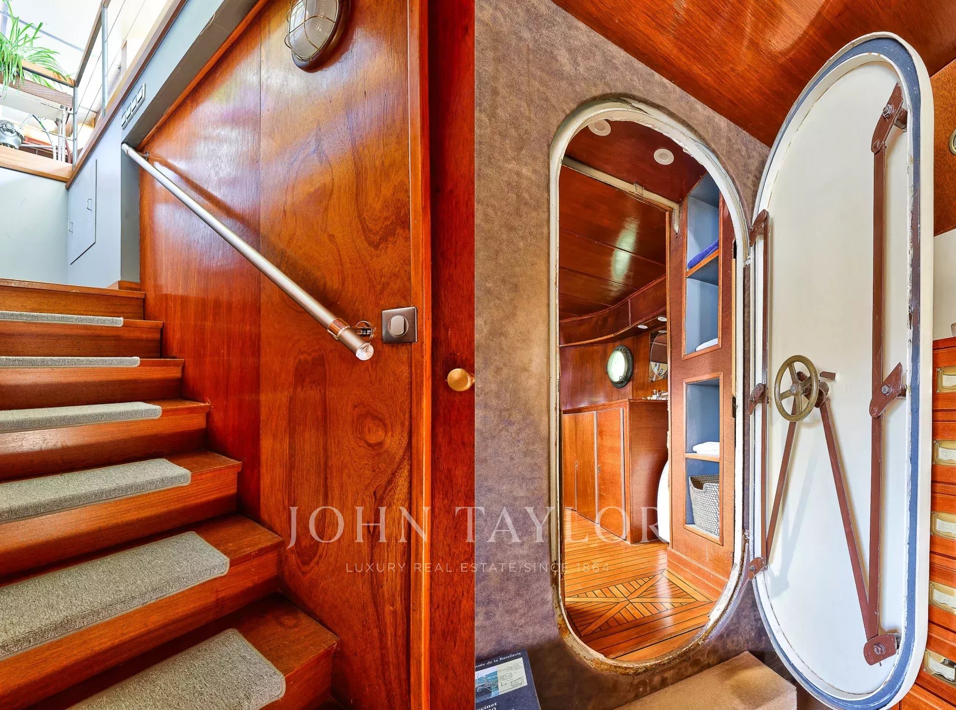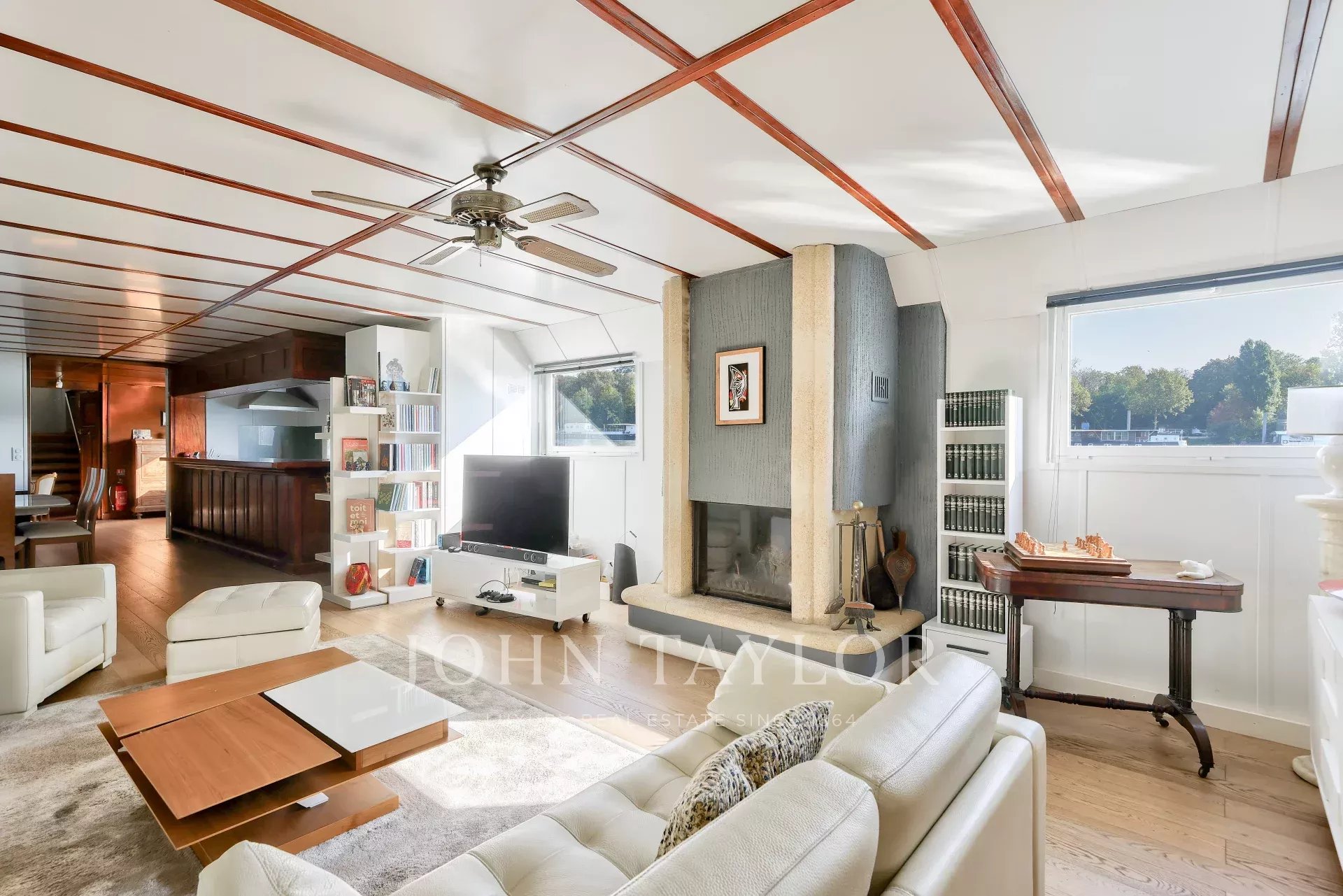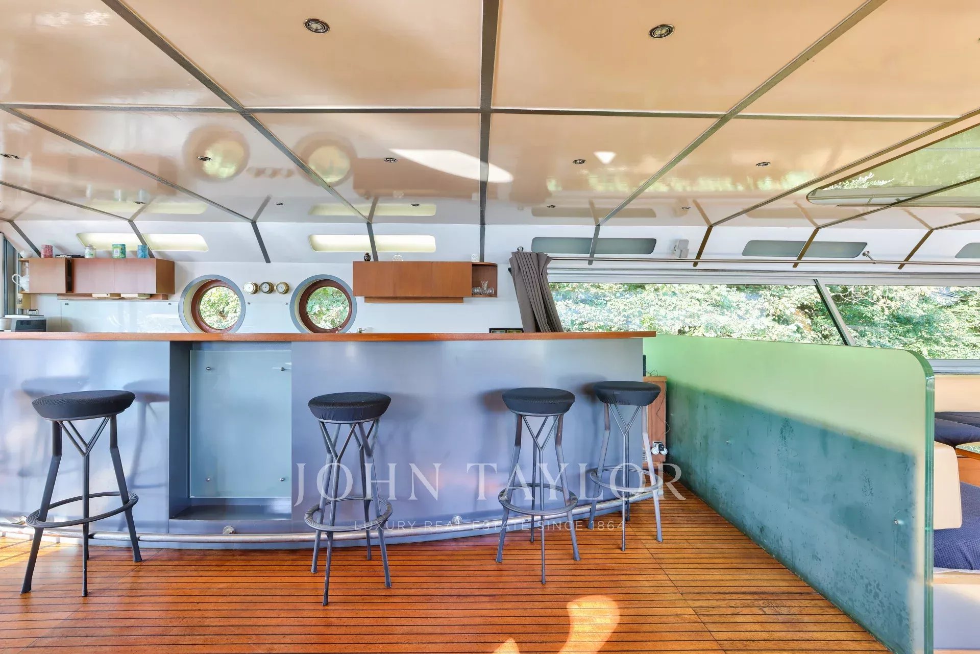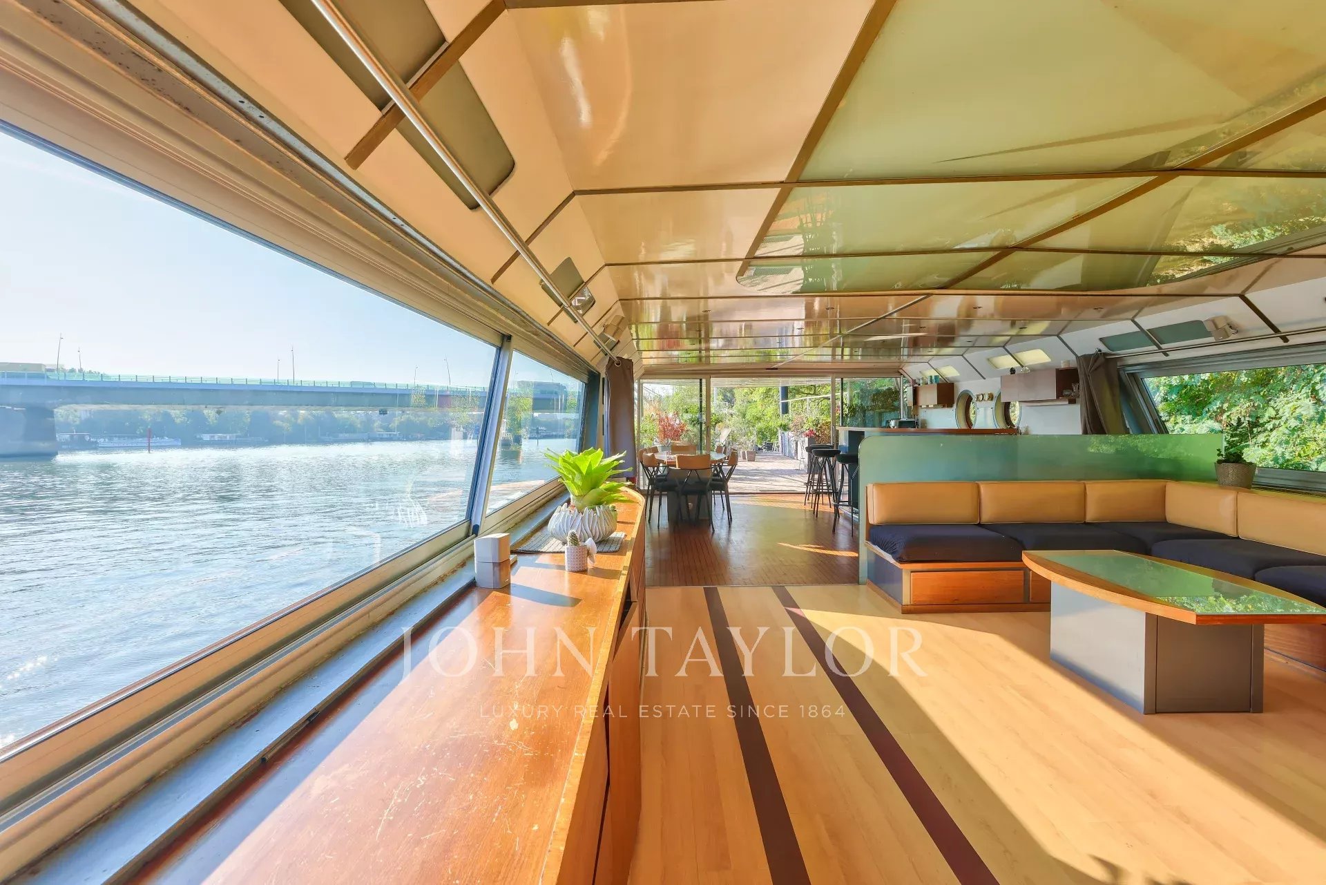 Amarrée dans un environnement paisible à proximité immédiate des commerces, du marché et des transports, cette péniche d’environ 196 m² habitables répartis sur deux niveaux séduit par ses volumes généreux, sa luminosité et sa grande terrasse de 60 m².
