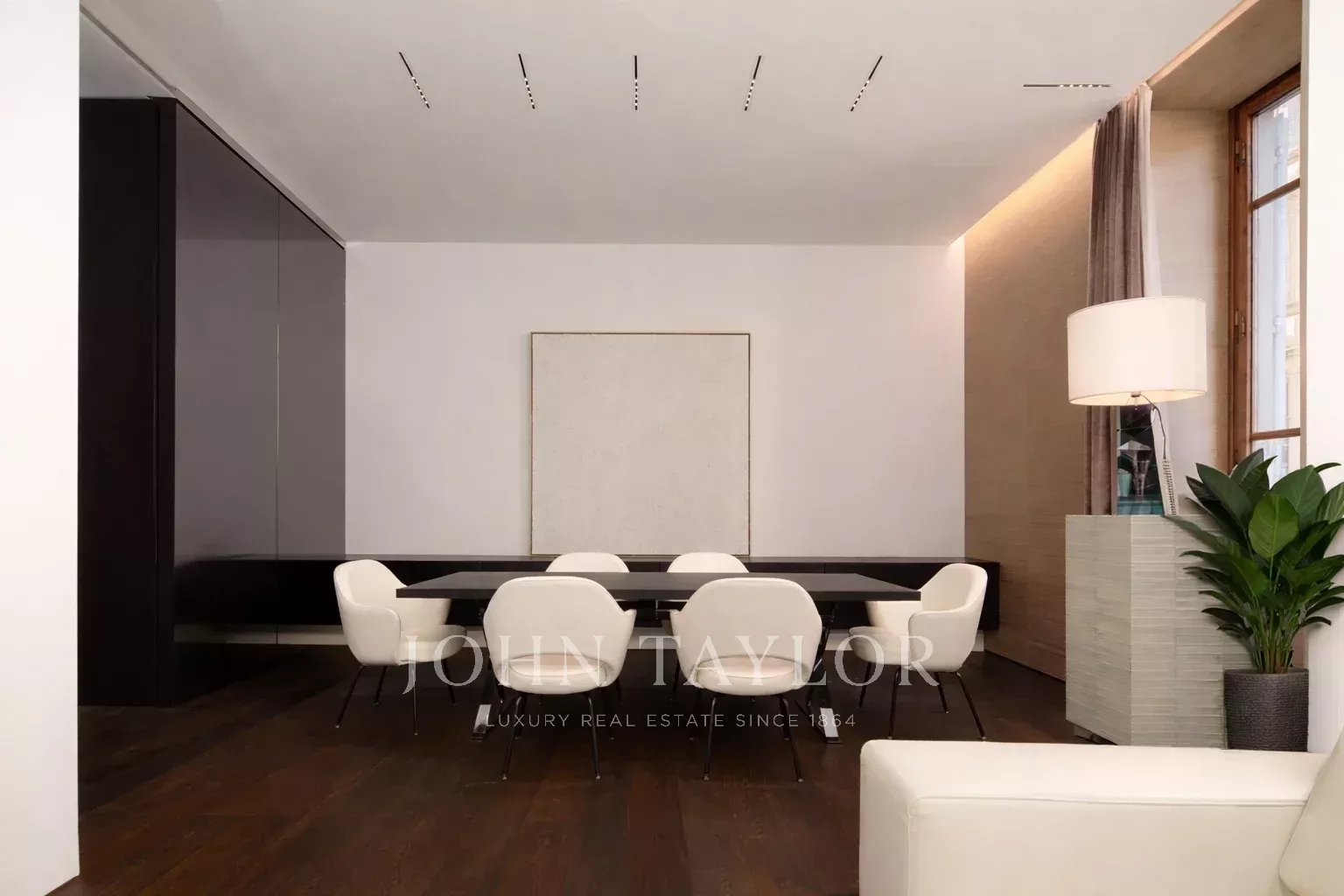 Le vaste salon séduit par ses volumes et sa palette raffinée, où le blanc du mobilier dialogue avec la chaleur du parquet foncé. La lumière naturelle, filtrant à travers de hautes fenêtres, crée une atmosphère à la fois intime et spectaculaire.
