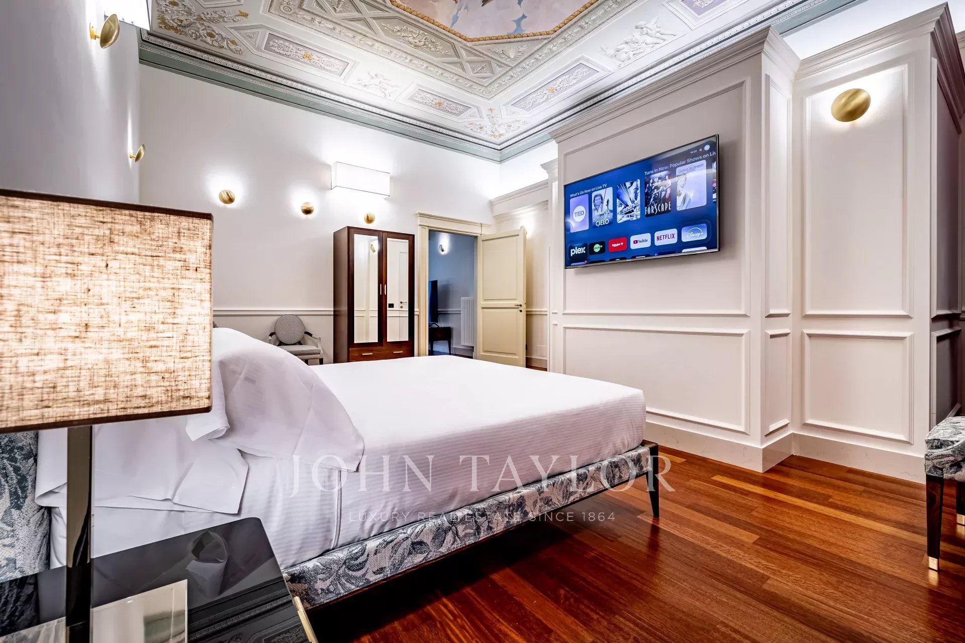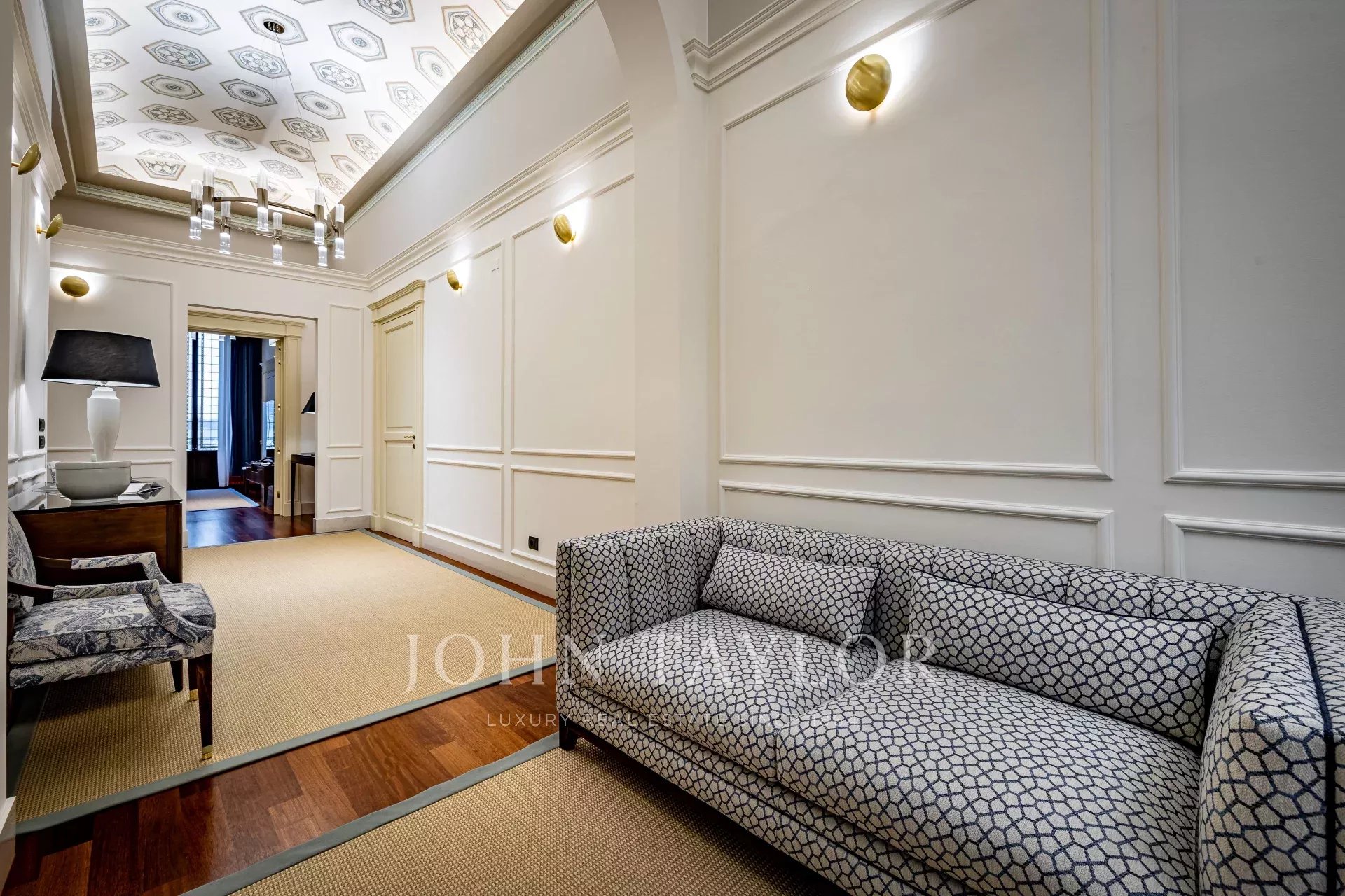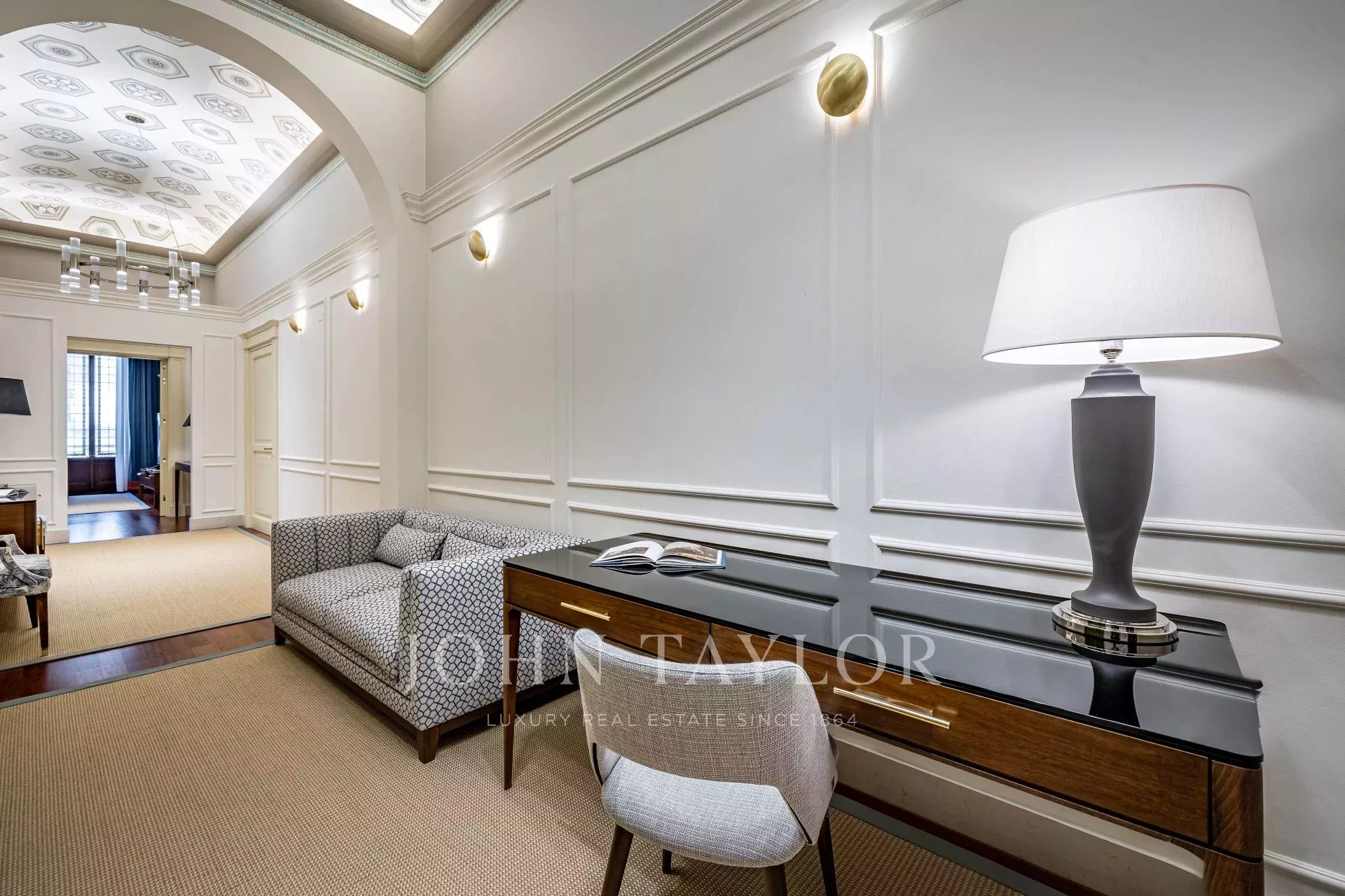 À l'intérieur, l'espace de vie spacieux présente des fresques d'origine et de majestueux plafonds à caissons. La cuisine moderne offre un accès direct au balcon, complété par deux grandes chambres, quatre salles de bains et une buanderie pratique.