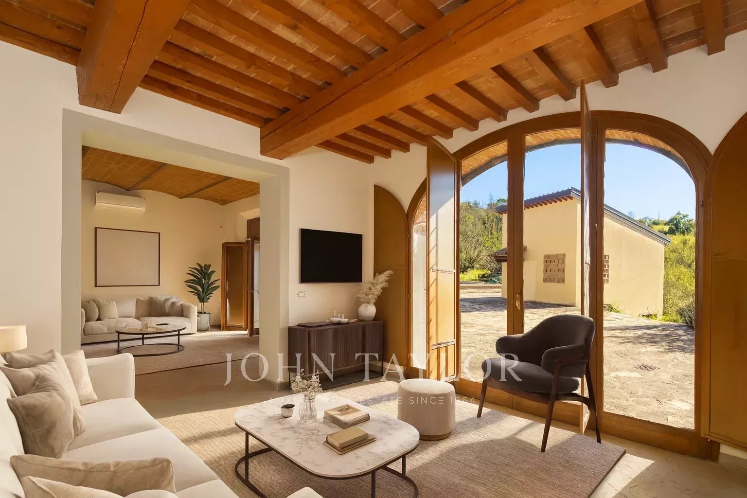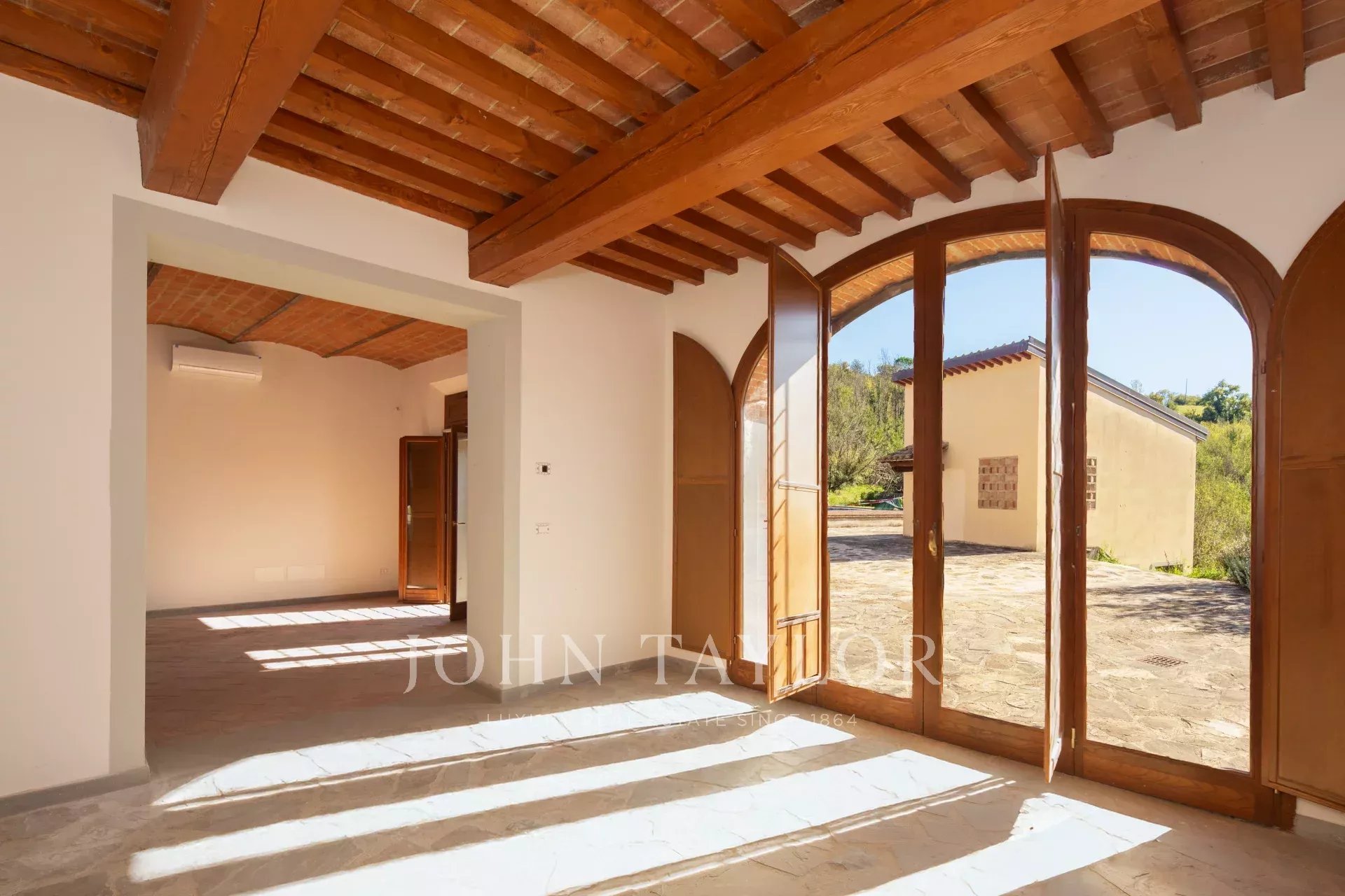 À l'extérieur, la ferme est entourée d'un beau jardin, d'une zone pavée idéale pour la vie estivale en plein air et d'une splendide piscine, parfaite pour les moments de détente et de convivialité.
