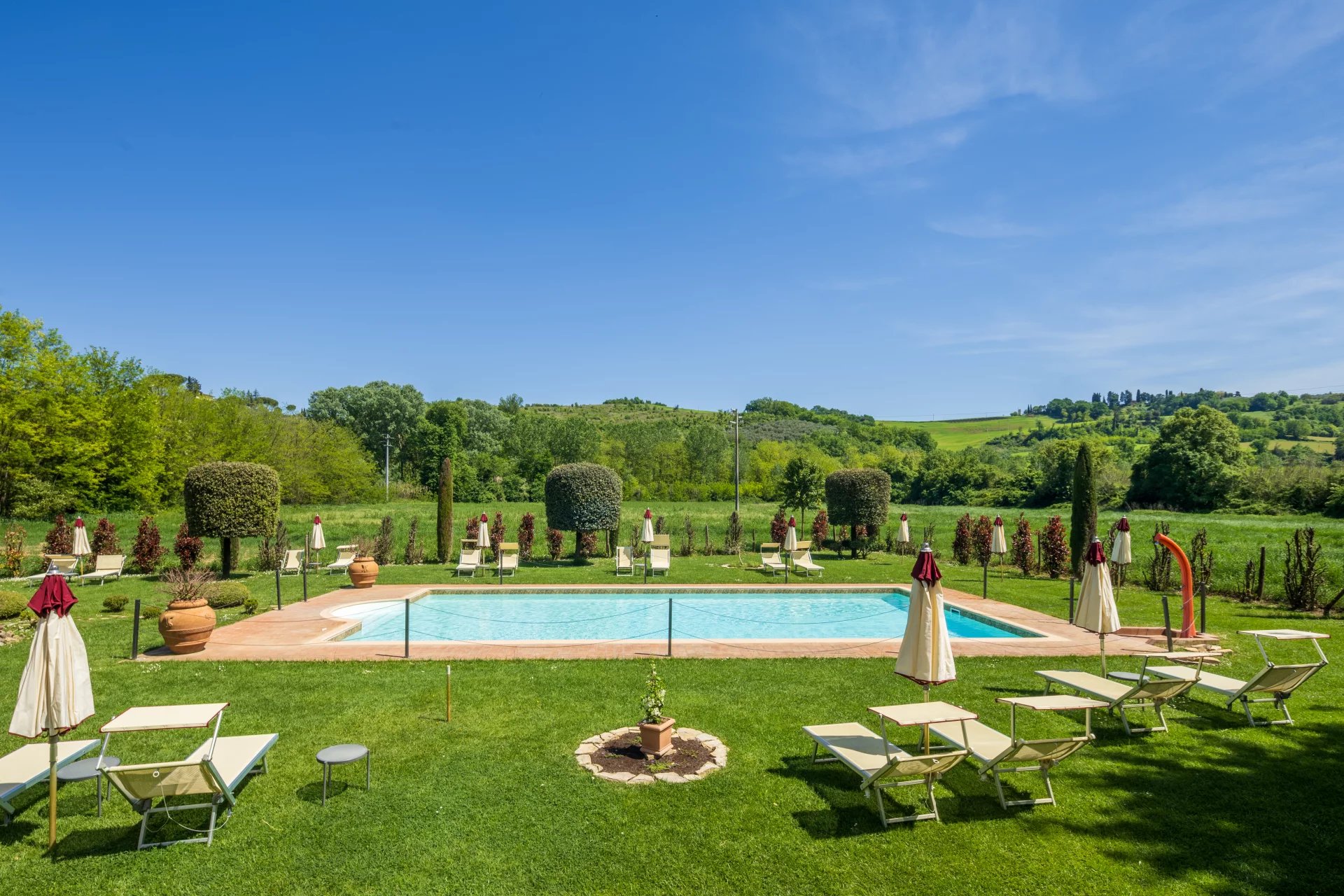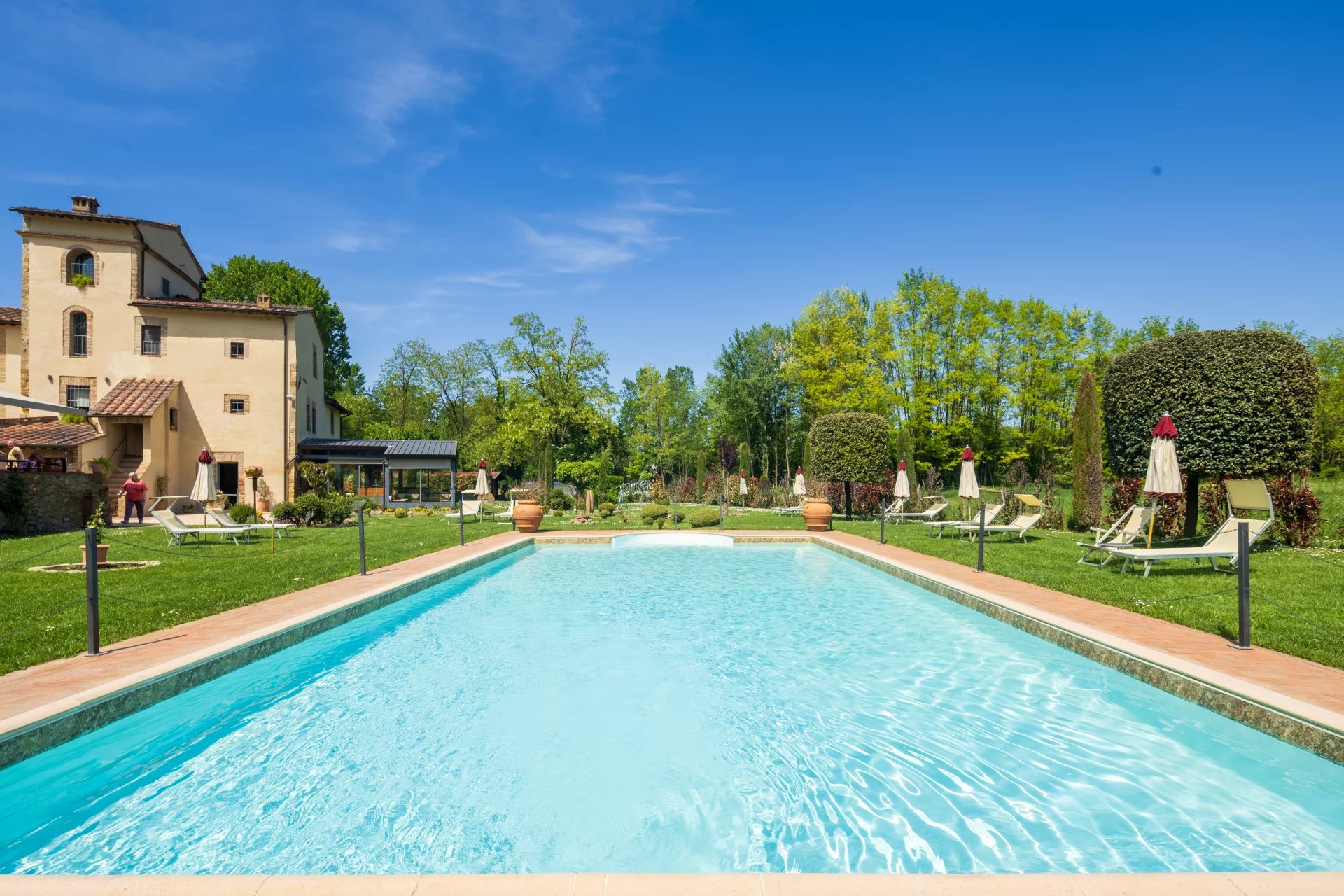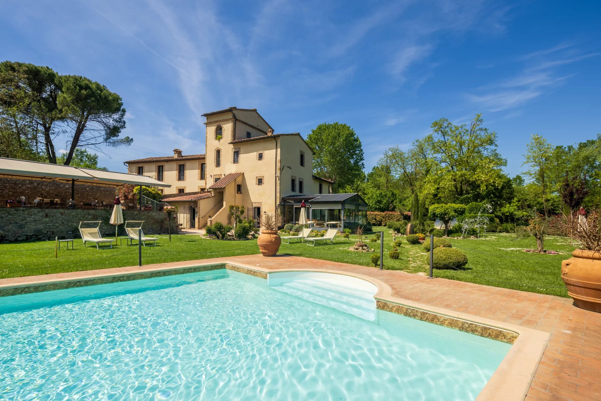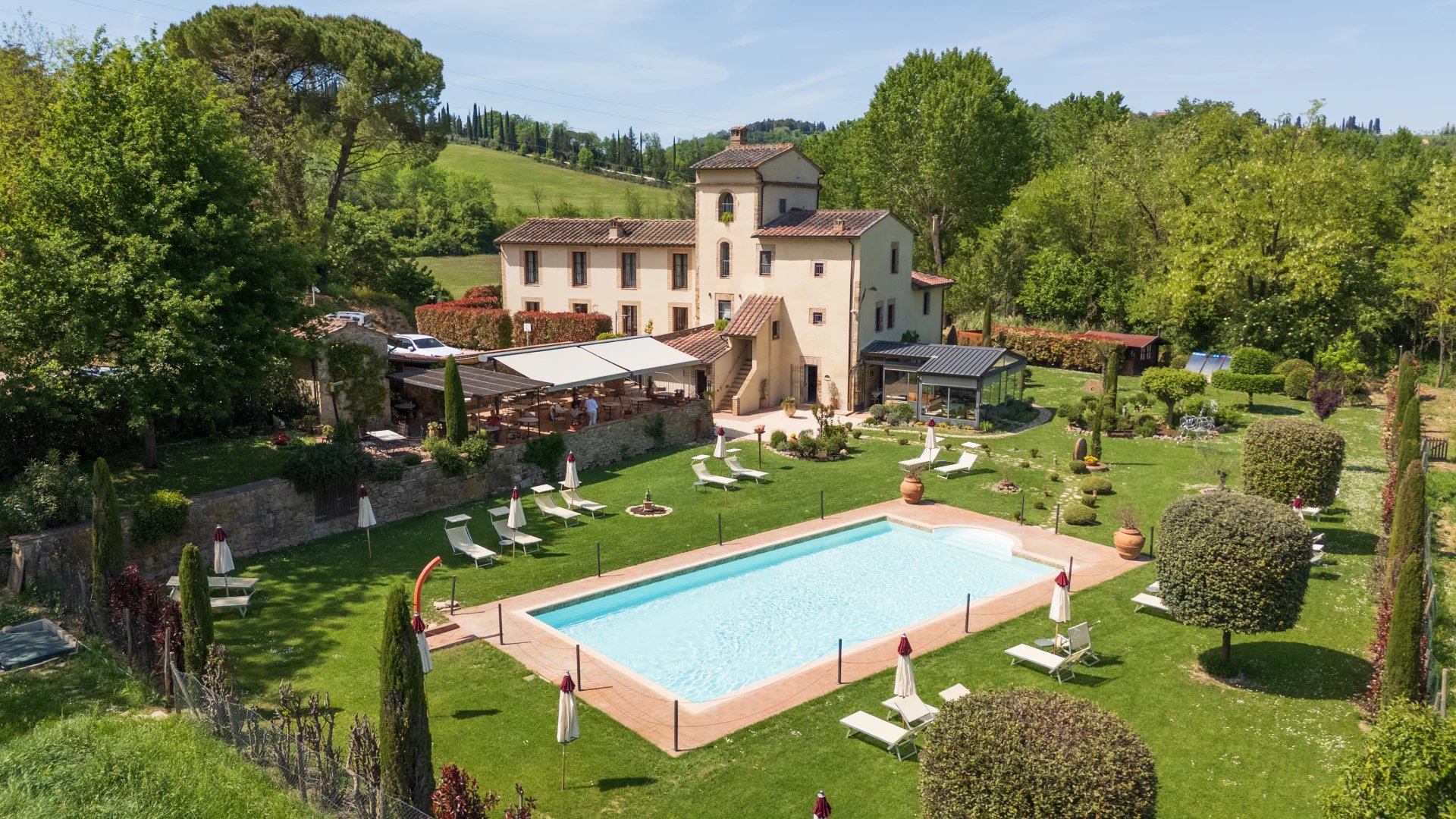 Avec une superficie totale d’environ 600 mètres carrés répartis sur deux niveaux, l’hôtel comprend 16 chambres, chacune unique dans son style et enrichie d’éléments traditionnels tels que des poutres apparentes, des sols en terre cuite et des vues panoramiques sur les collines toscanes. L’atmosphère est celle d’une résidence de charme, avec des intérieurs élégants conçus pour offrir un confort maximal. À l’extérieur, une grande piscine de 14x7 mètres est entourée de jardins soignés, d'une grande terrasse couverte et de 4,6 hectares de terrain agricole qui entourent la propriété.