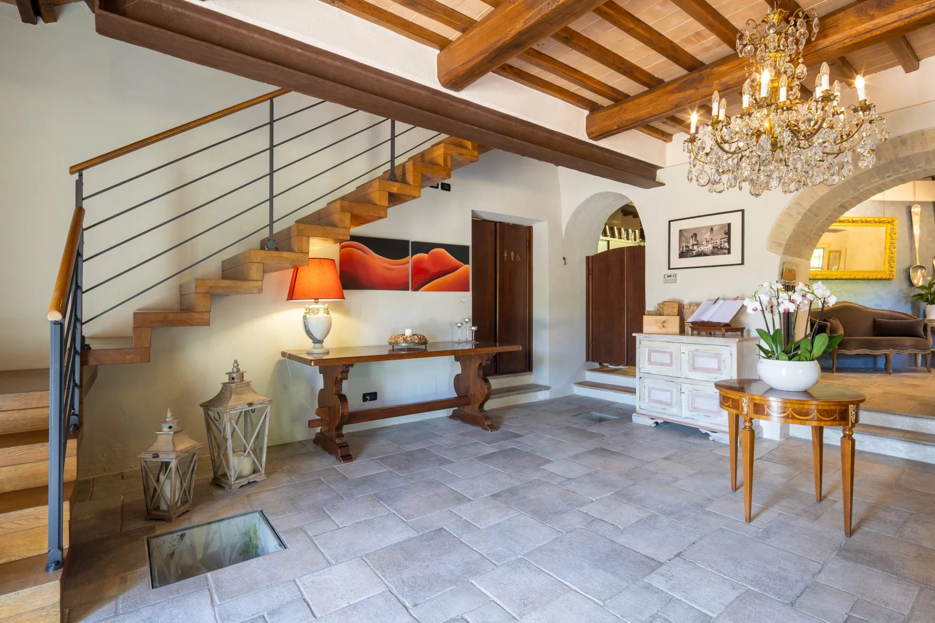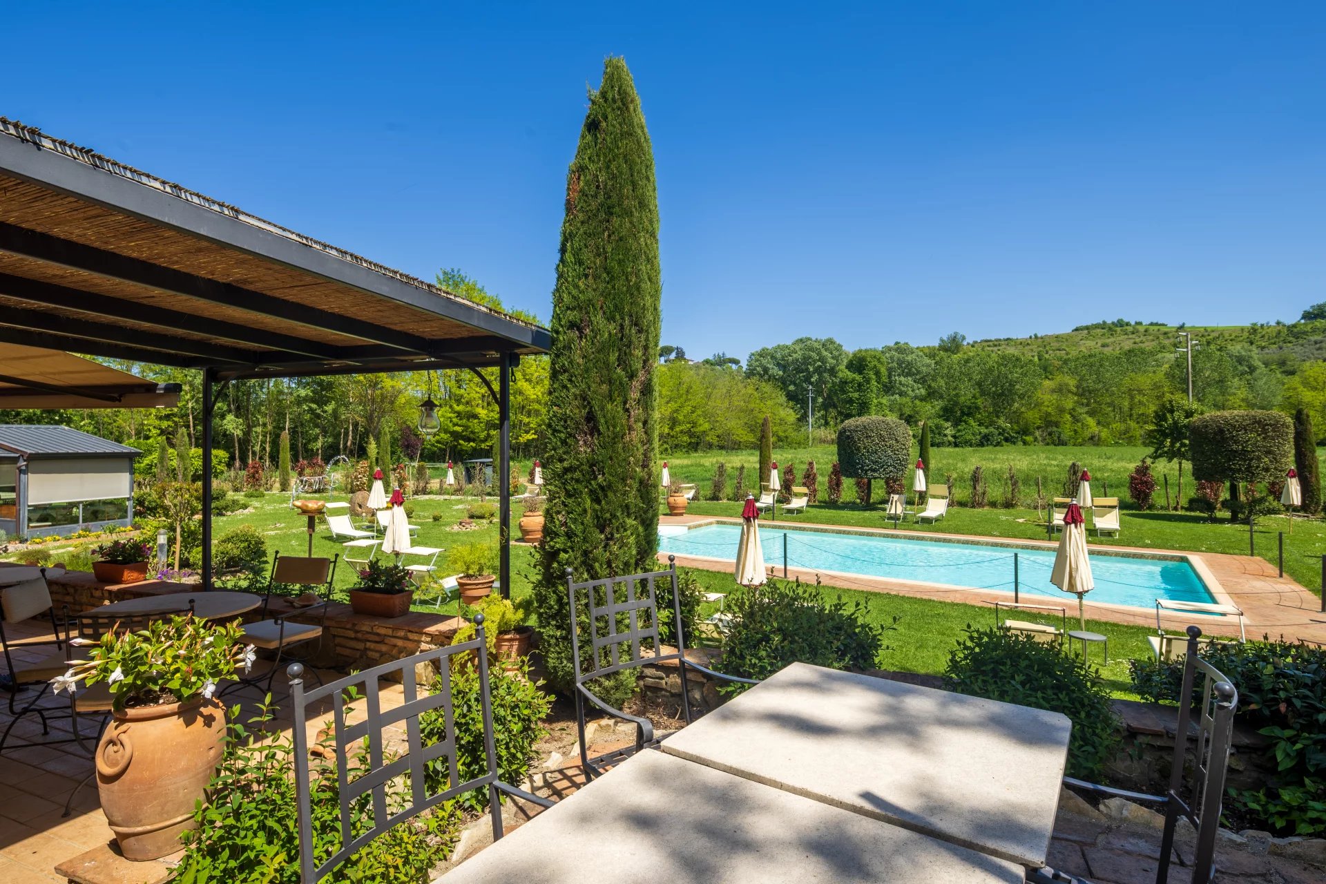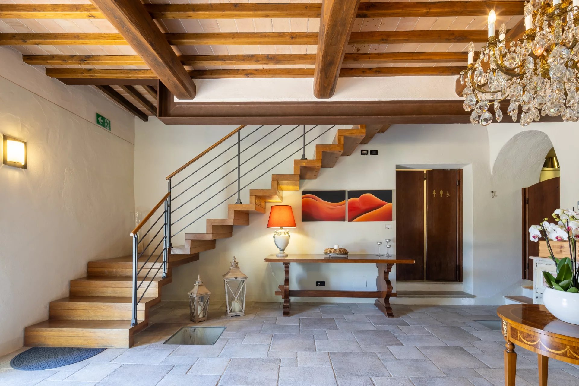 Avec une superficie totale d’environ 600 mètres carrés répartis sur deux niveaux, l’hôtel comprend 16 chambres, chacune unique dans son style et enrichie d’éléments traditionnels tels que des poutres apparentes, des sols en terre cuite et des vues panoramiques sur les collines toscanes. L’atmosphère est celle d’une résidence de charme, avec des intérieurs élégants conçus pour offrir un confort maximal. À l’extérieur, une grande piscine de 14x7 mètres est entourée de jardins soignés, d'une grande terrasse couverte et de 4,6 hectares de terrain agricole qui entourent la propriété.