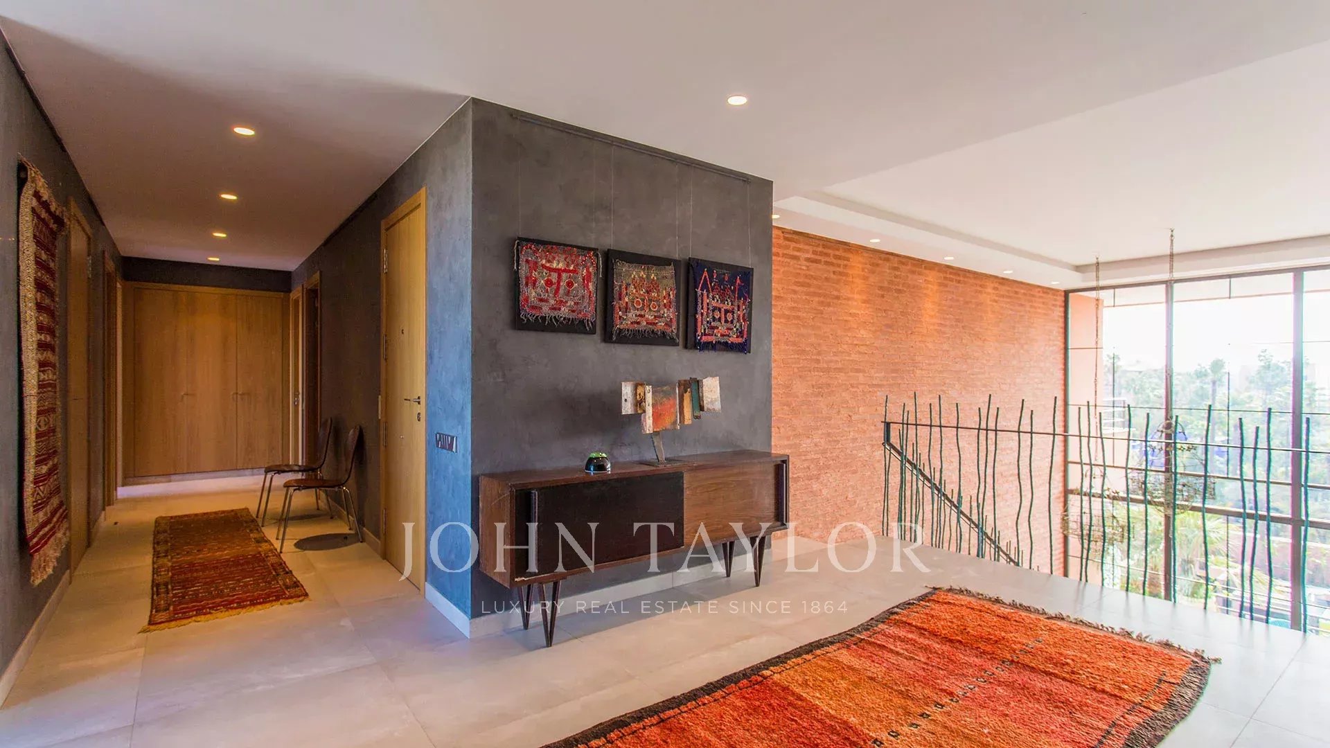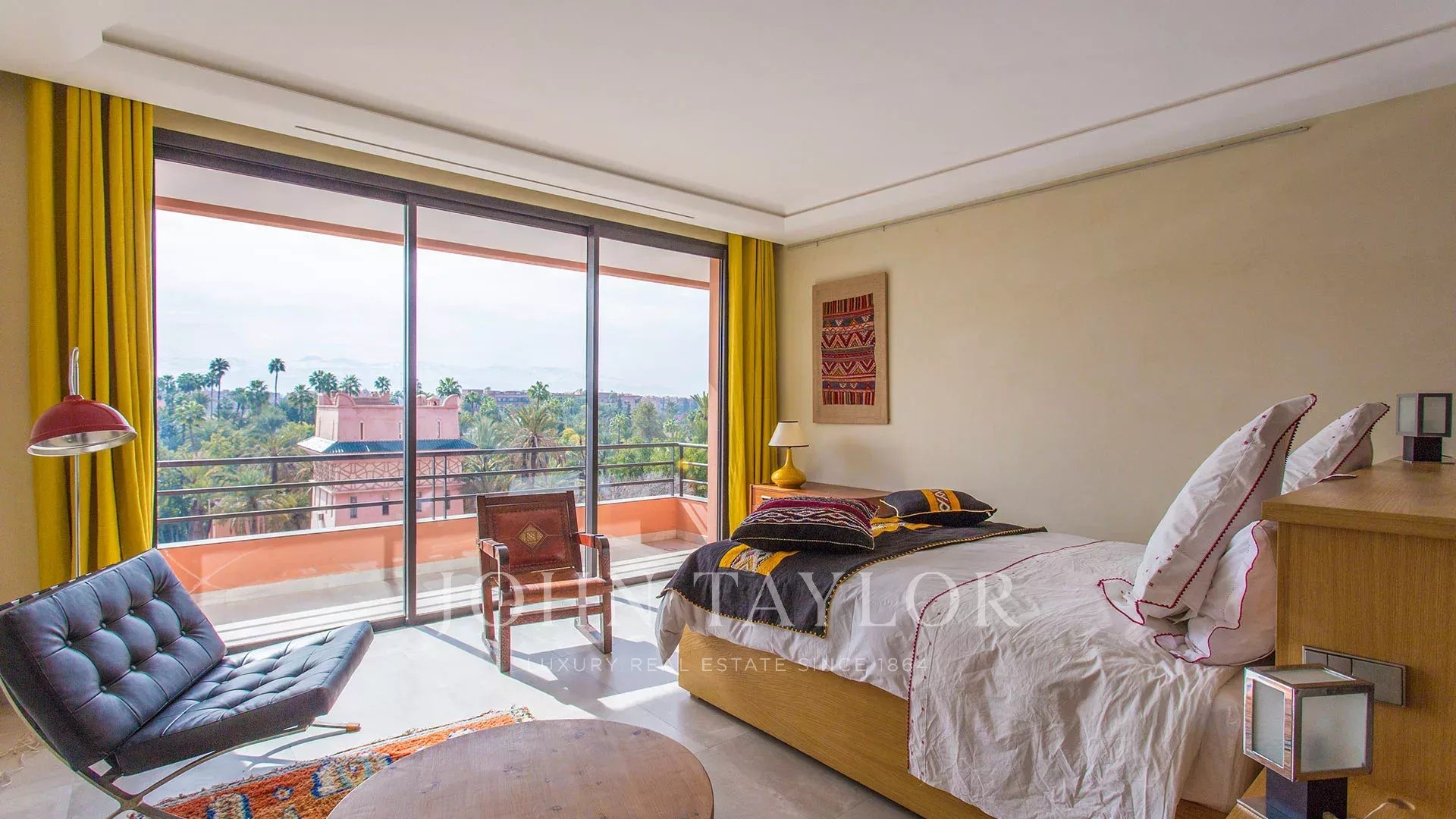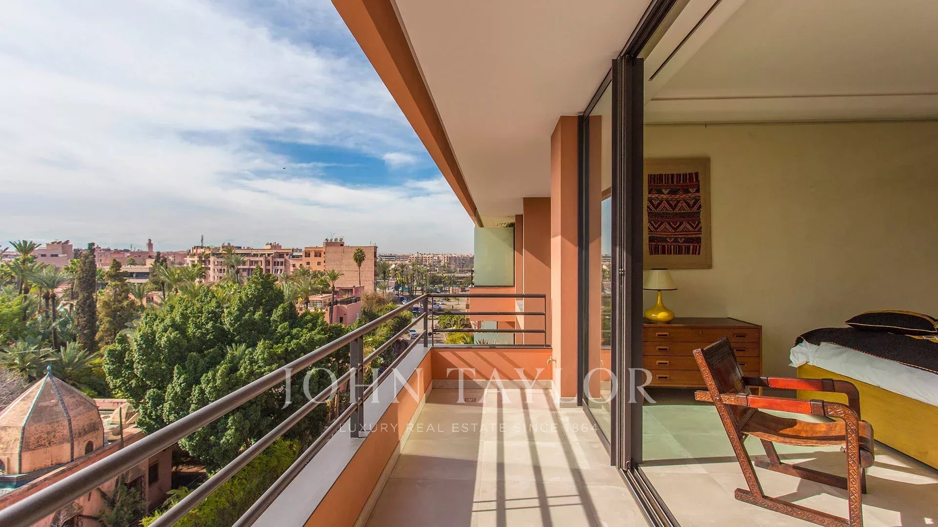 Aux 4ème et 5ème étages d’un immeuble de grand standing avec accès privé par ascenseur à chacun des étages, l’appartement offre de la plupart des pièces une vue superbe sur le Jardin Majorelle et la chaîne de l’Atlas.