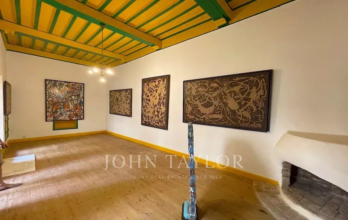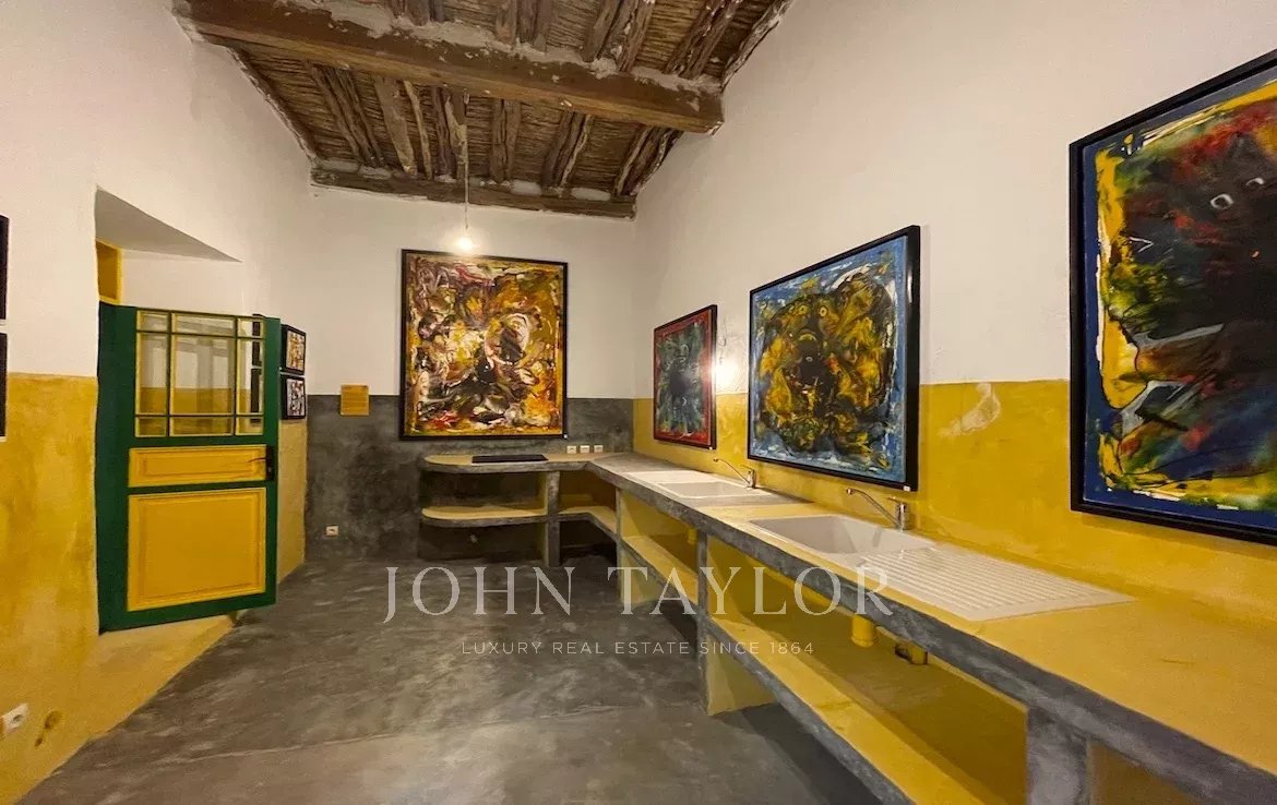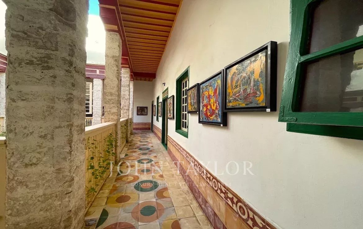 D’une surface au sol de 300 m2, il comprend au rez-de-chaussée autour d’un patio d’environ 40 m2 agrémenté d’une coursive aux doubles arches en pierre taillée : un bureau et plusieurs grandes pièces sur 3 côtés.