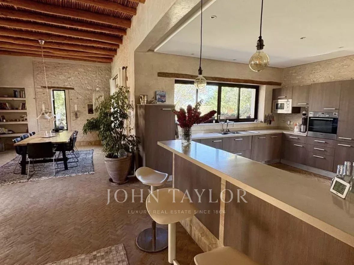 La maison comprend au rez-de-chaussée: un vaste et lumineux salon avec cheminée ouvrant sur la piscine, un bel espace repas, une cuisine équipée moderne, des toilettes invités ainsi qu'une première chambre avec salle de bain. Le premier étage accueille 2 chambres avec salles de bain.
