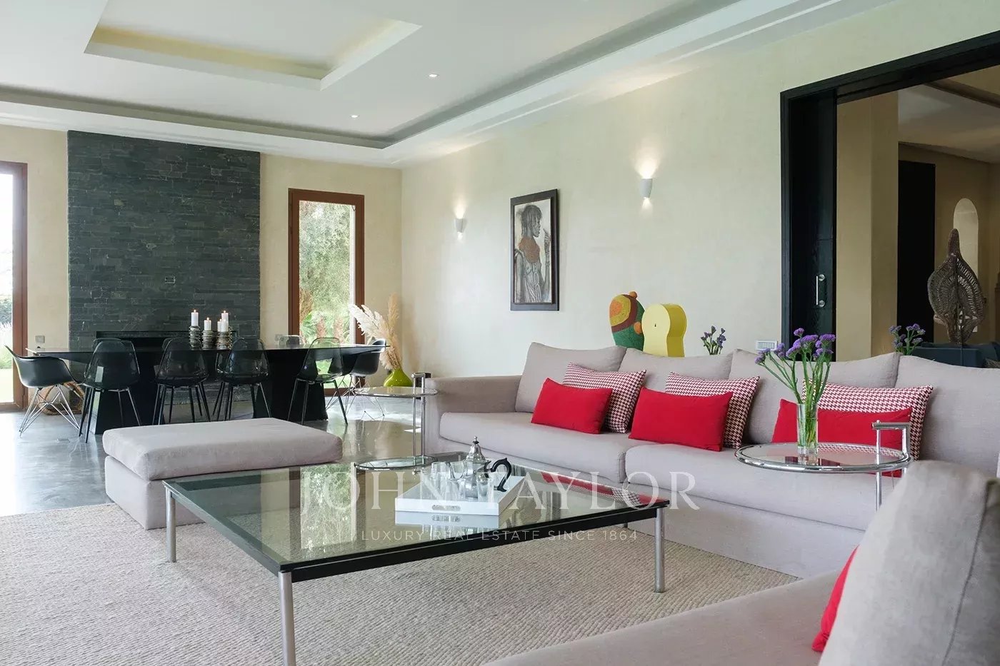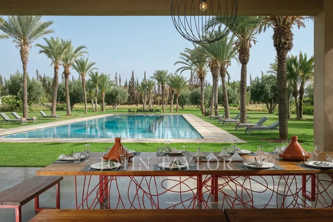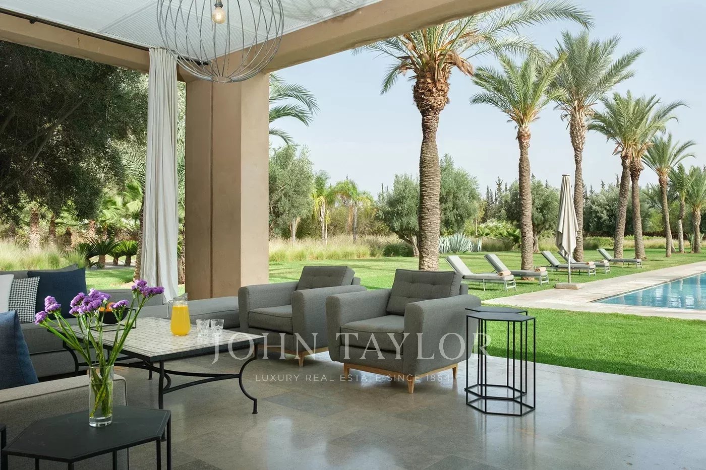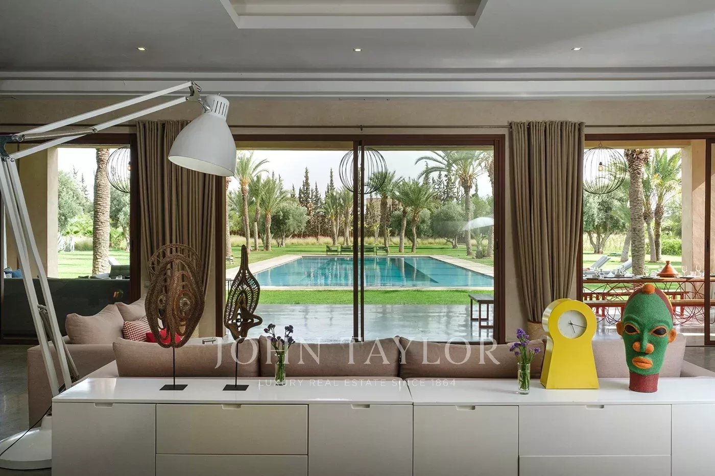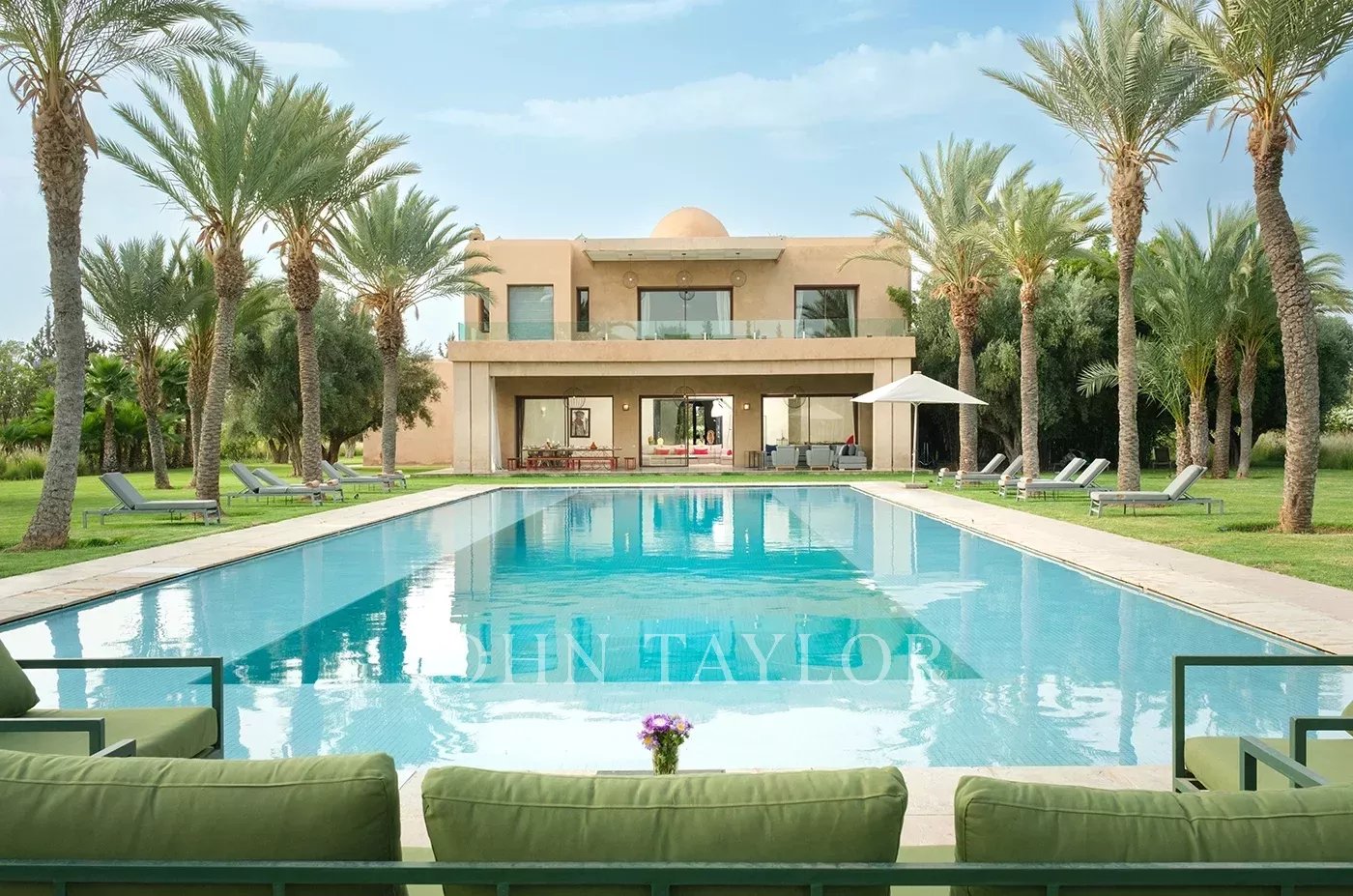 Cette luxueuse villa contemporaine est située au cœur d'un vaste domaine à moins de 5 minutes des 3 plus beaux golfs de Marrakech et à moins de 15 minutes du centre-ville.