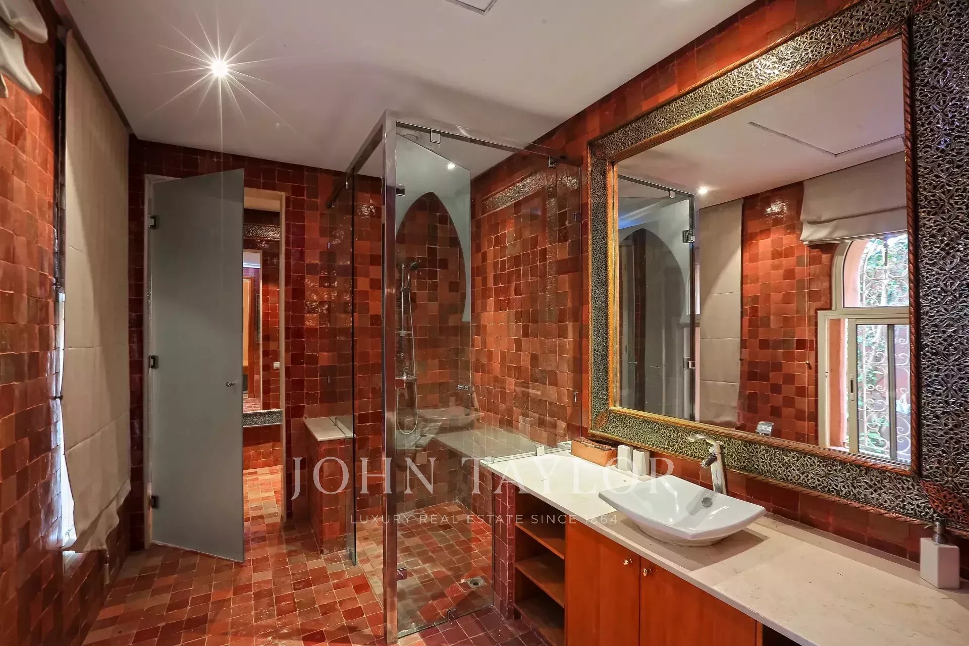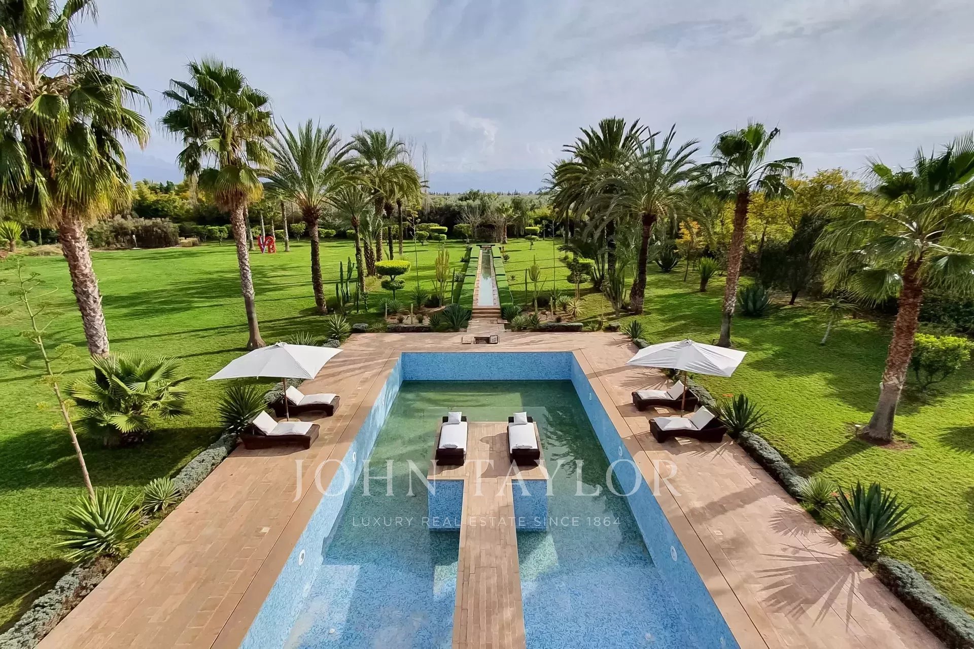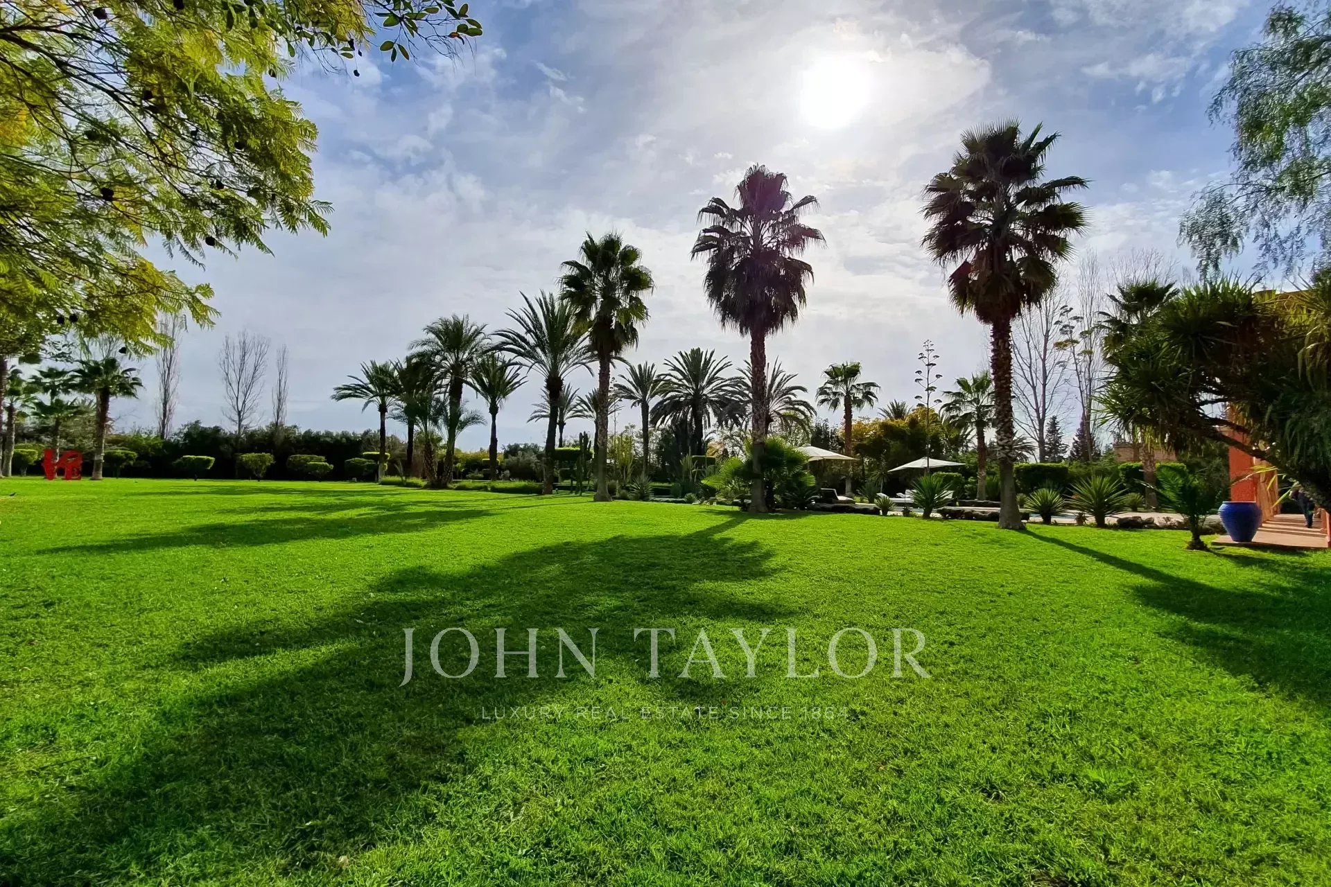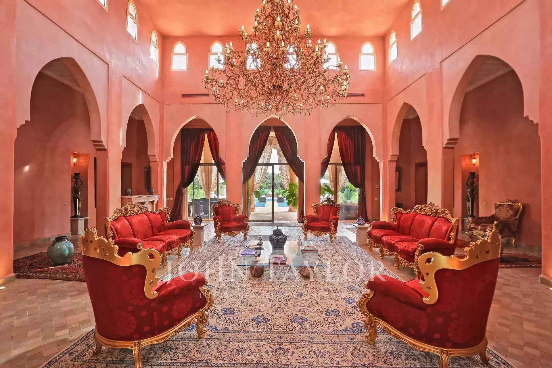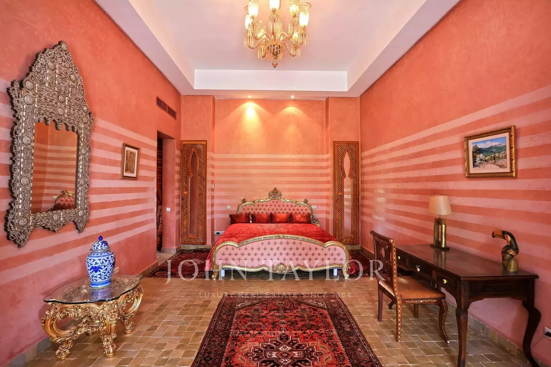 A 20 mn du golf d'Amelkis et du golf Royal, cette propriété de plain-pied d'environ 600m² est organisée autour d'un magnifique patio dans l'esprit d'un RIAD traditionnel. Elle comprend de vastes espaces de réception offrant des volumes remarquables et de grandes hauteurs sous plafond, 4 suites spacieuses avec terrasse privée, 1 cuisine parfaitement équipée, 1 salle de sport, 1 logement de gardien..