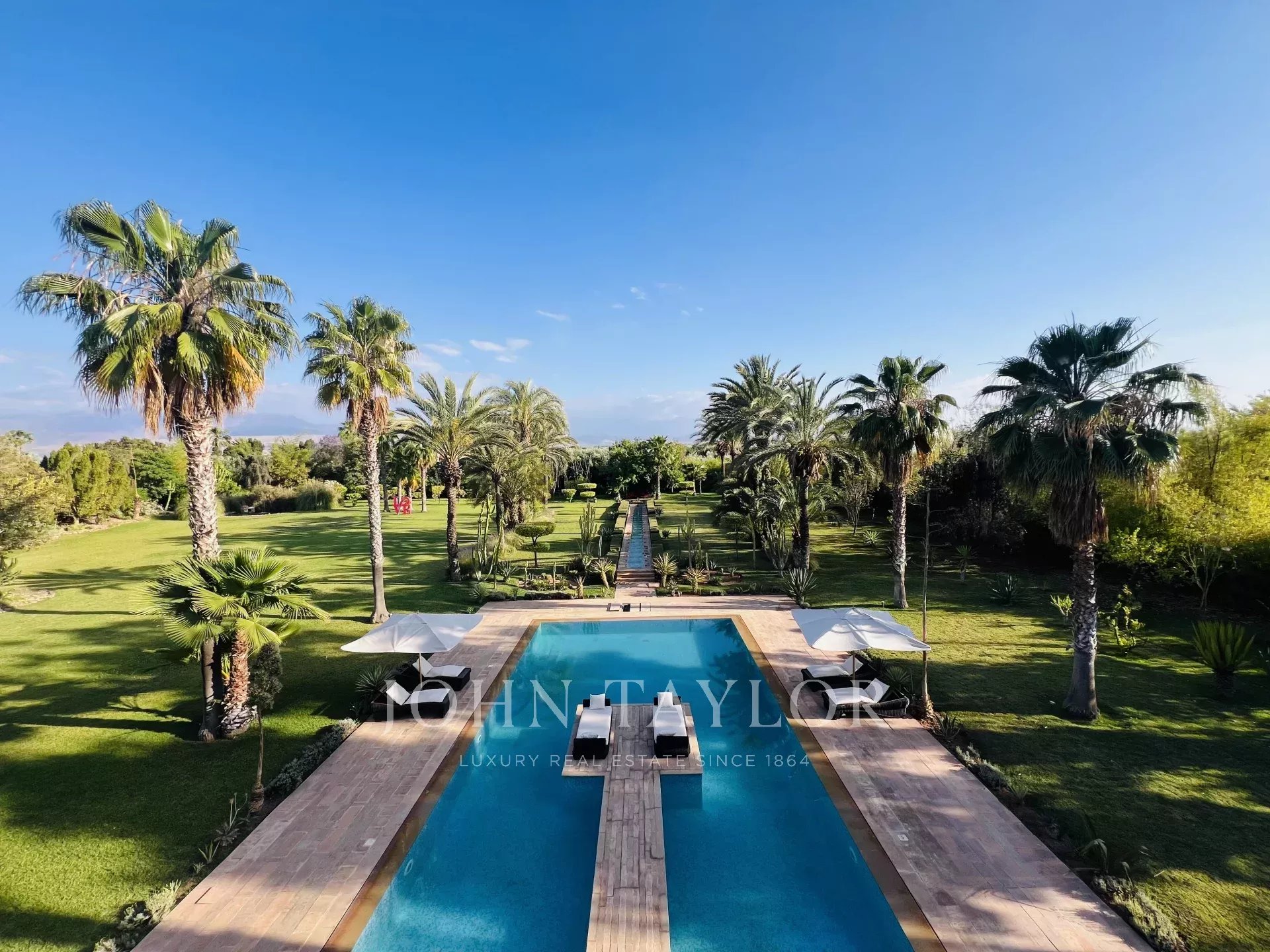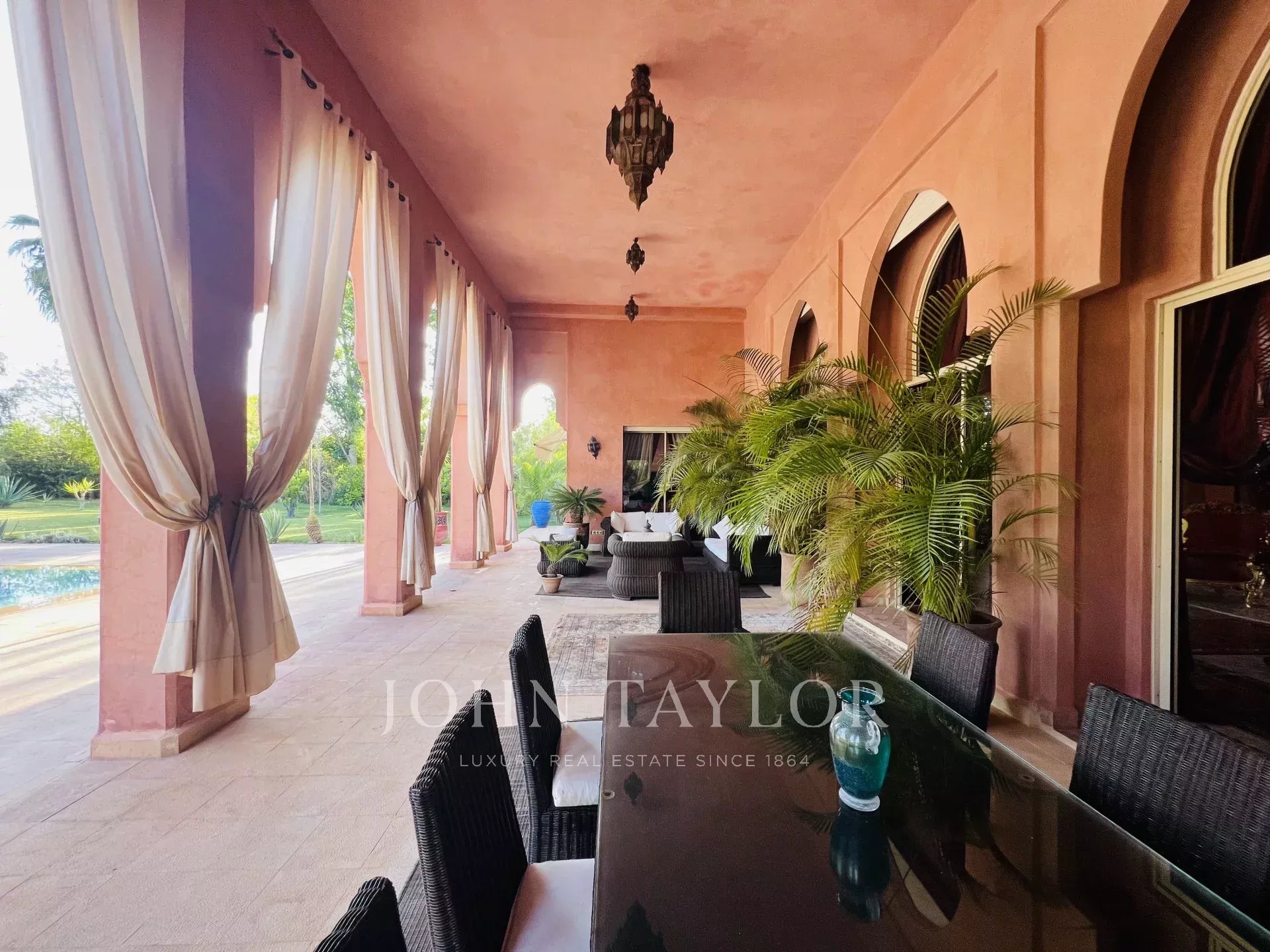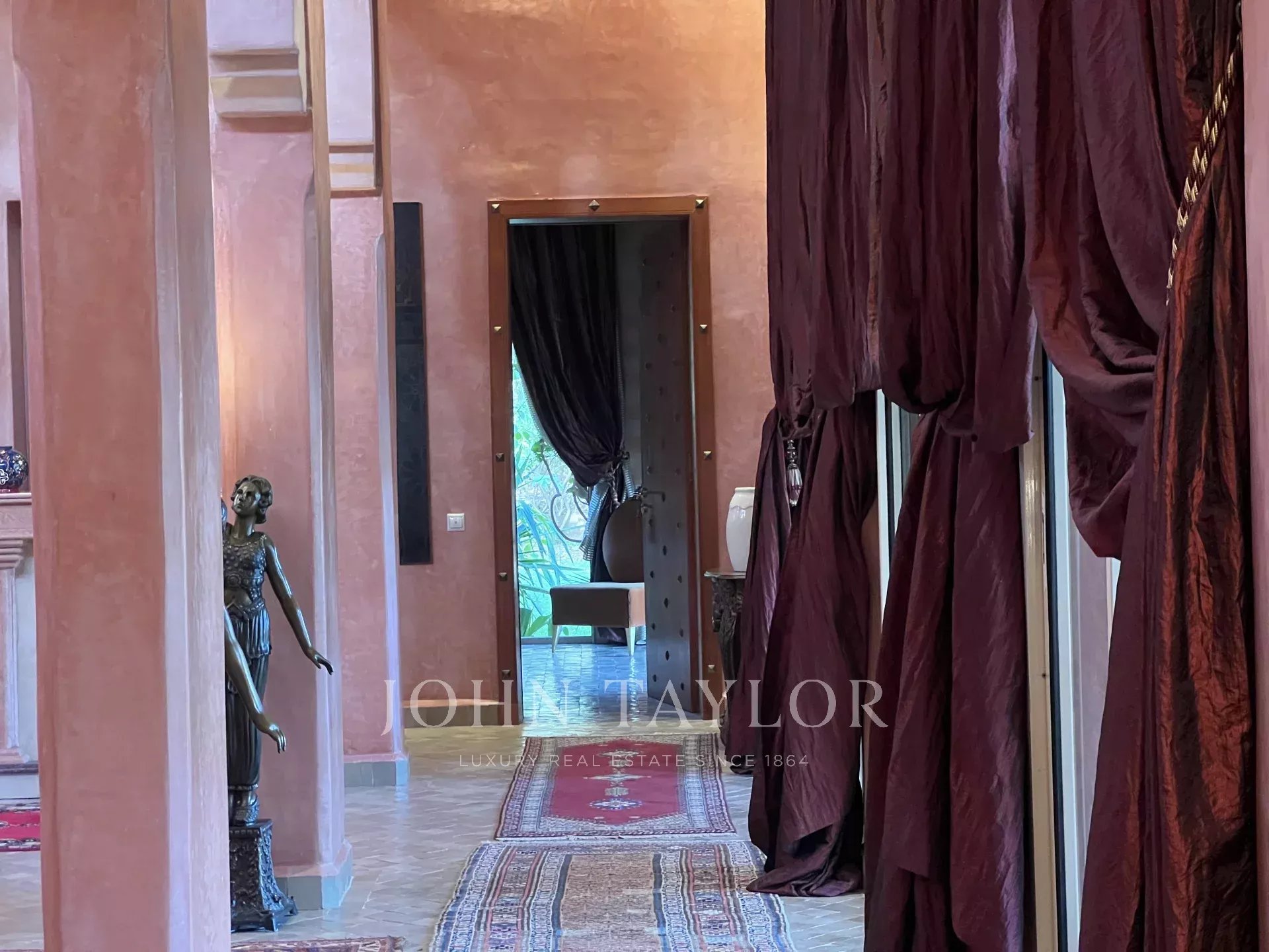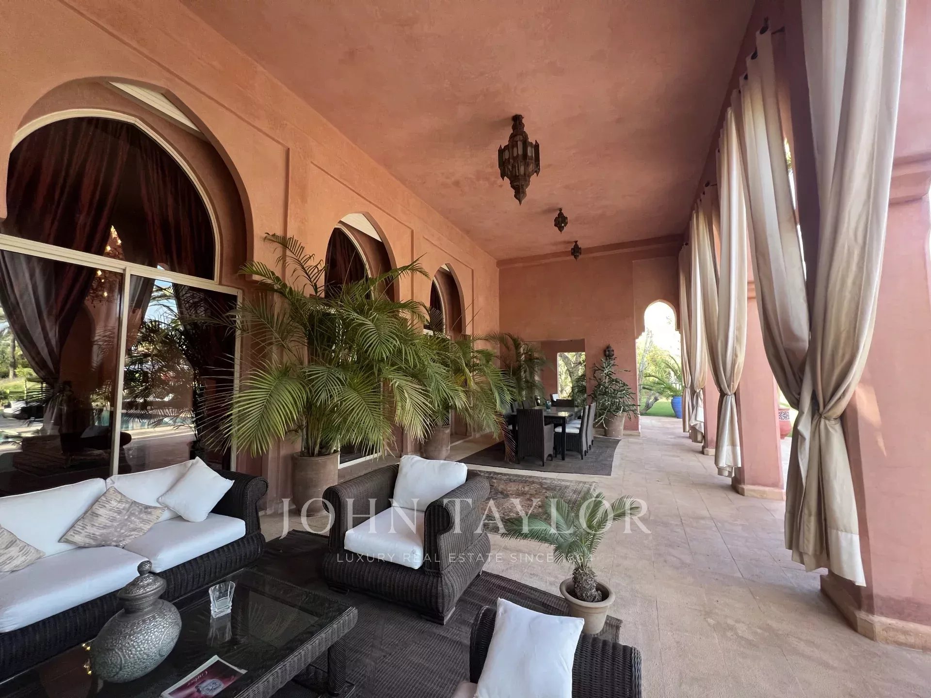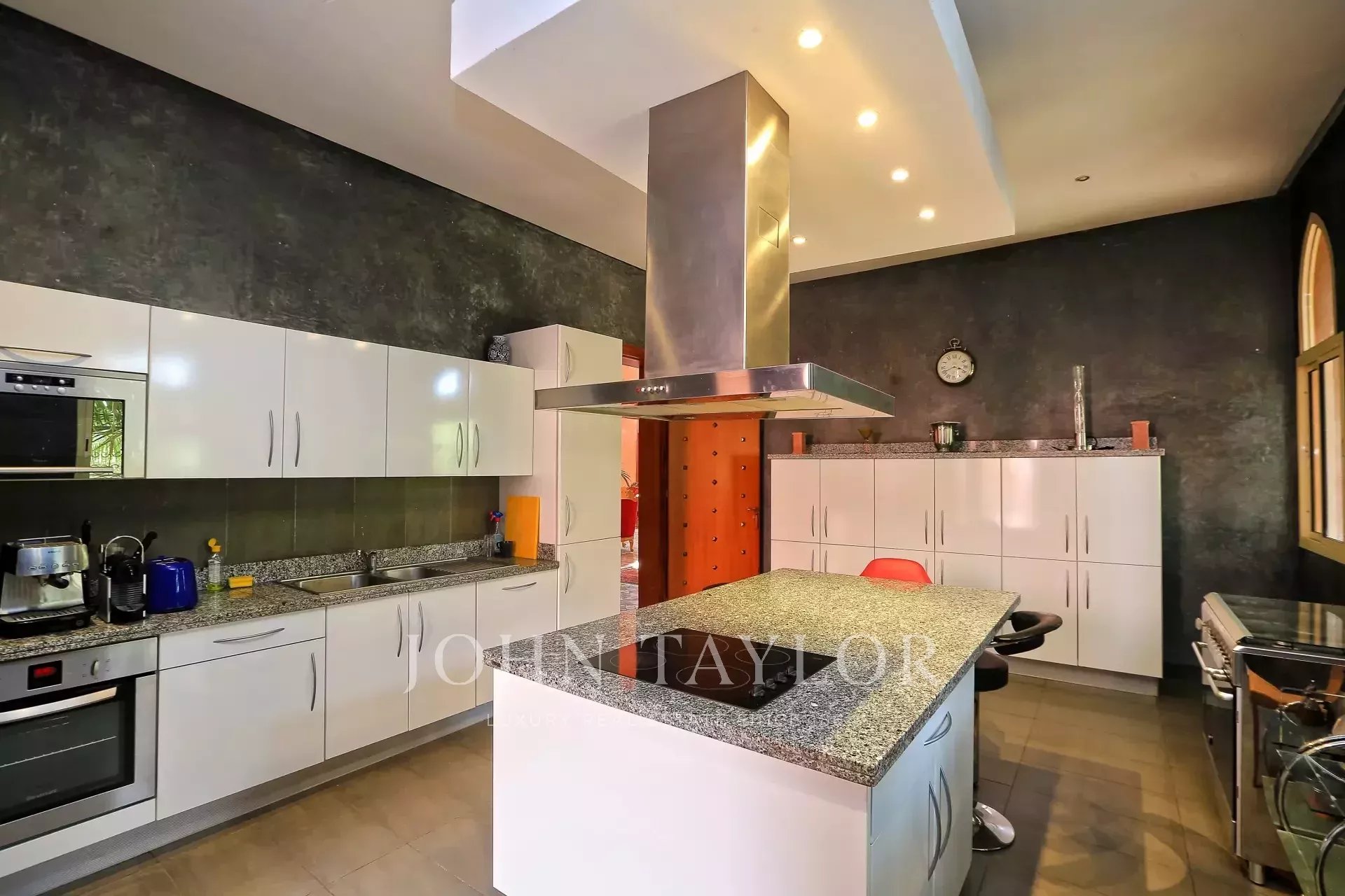 A 20 mn du golf d'Amelkis et du golf Royal, cette propriété de plain-pied d'environ 600m² est organisée autour d'un magnifique patio dans l'esprit d'un RIAD traditionnel. Elle comprend de vastes espaces de réception offrant des volumes remarquables et de grandes hauteurs sous plafond, 4 suites spacieuses avec terrasse privée, 1 cuisine parfaitement équipée, 1 salle de sport, 1 logement de gardien..