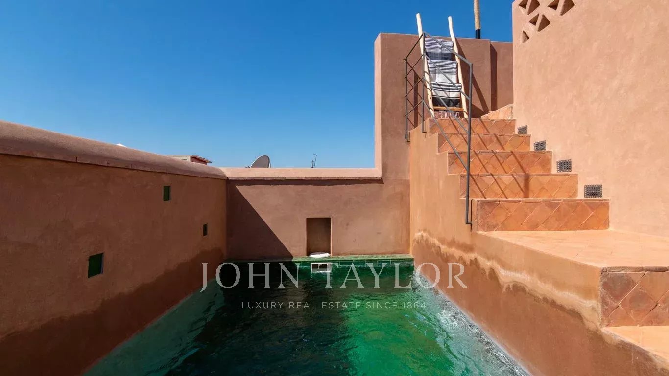 Au dernier niveau, la terrasse héberge un solarium, un espace repas abrité, un bassin (4mx3m) et une sur-terrasse avec superbe vue panoramique sur la Medina environnante et la chaîne de l'Atlas.