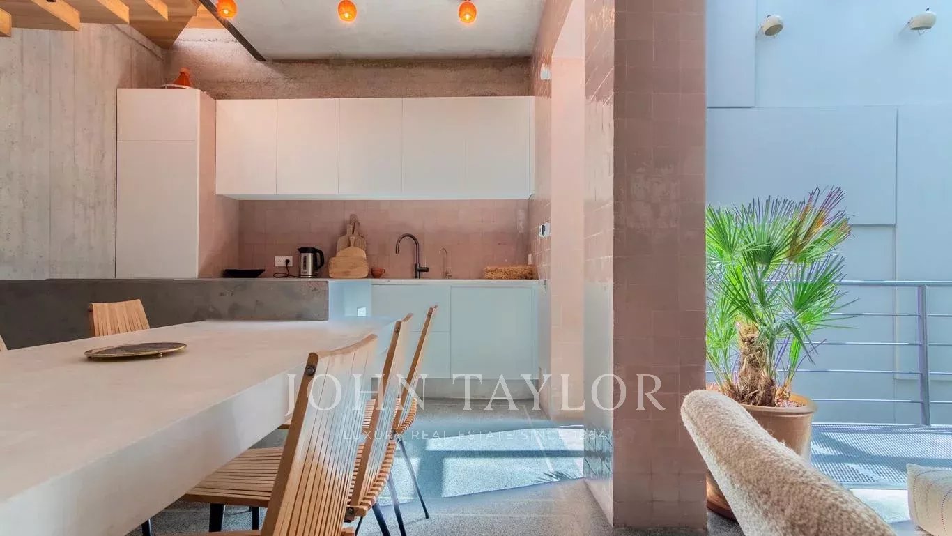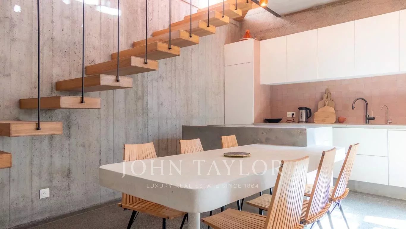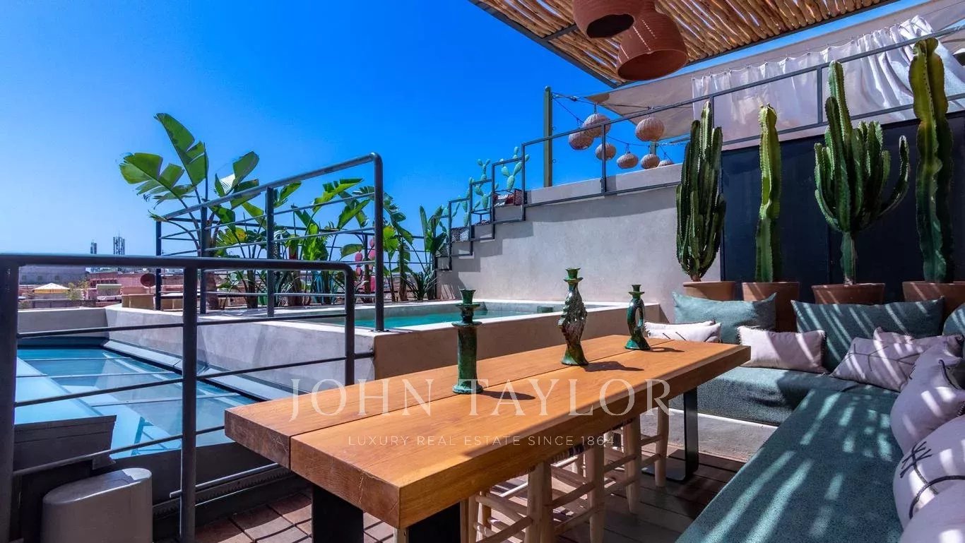 Au dernier niveau, la terrasse accueille un espace repas abrité, une piscine chauffée et un solarium avec vue sur la Medina environnante.