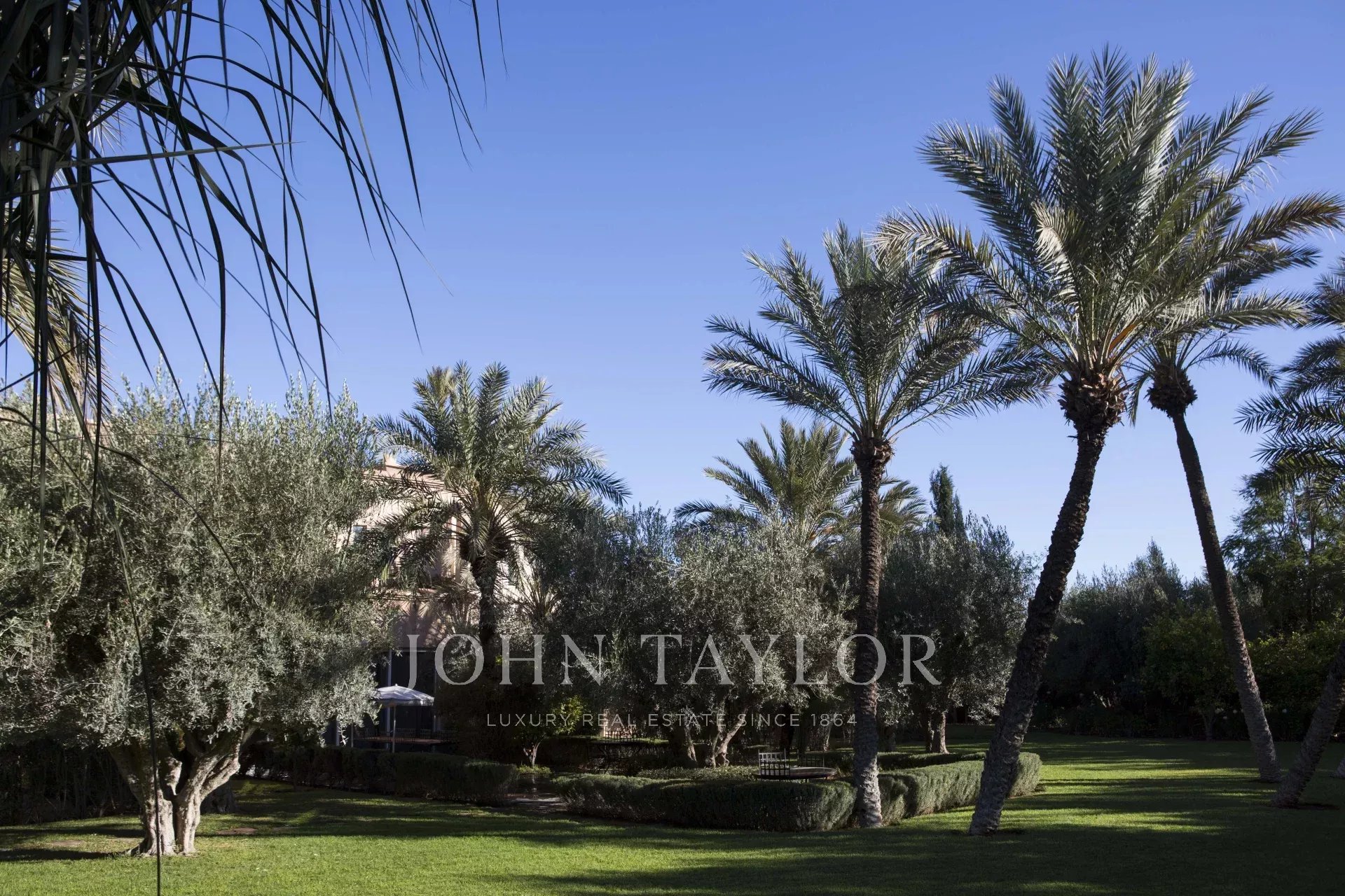 Le superbe parc arboré d'un hectare héberge la demeure à l'architecture arabo-andalouse épurée, une piscine suspendue, un parking et une maison de gardien.