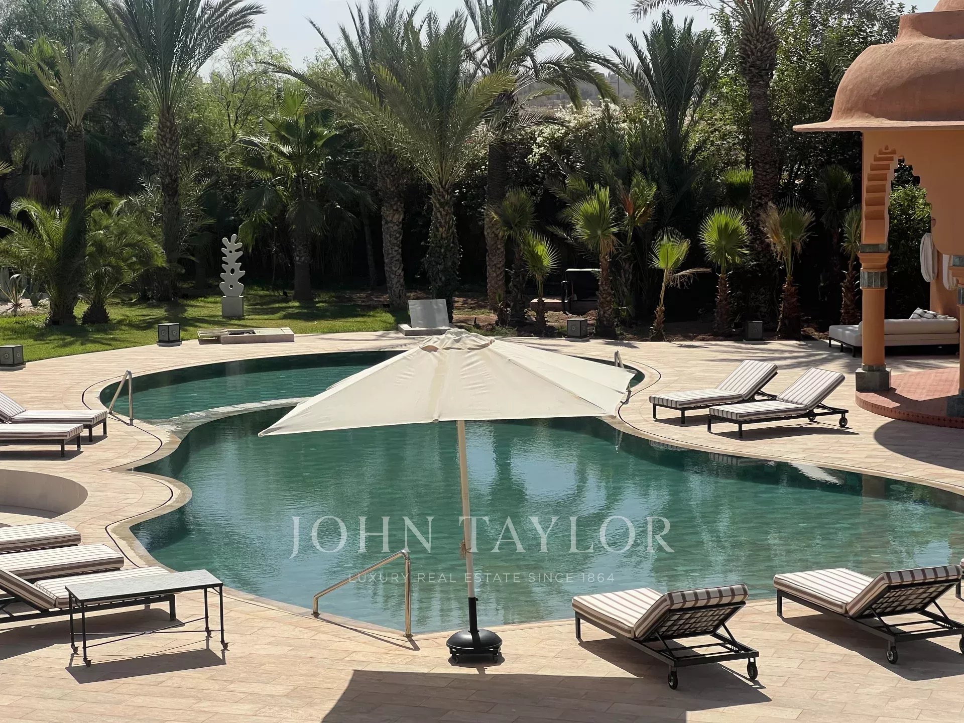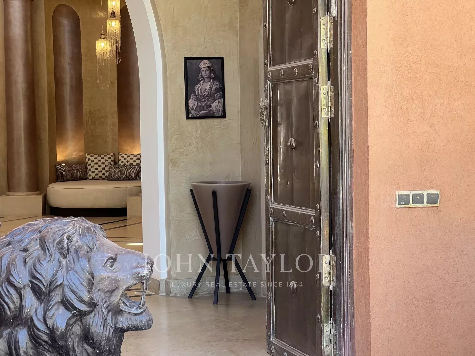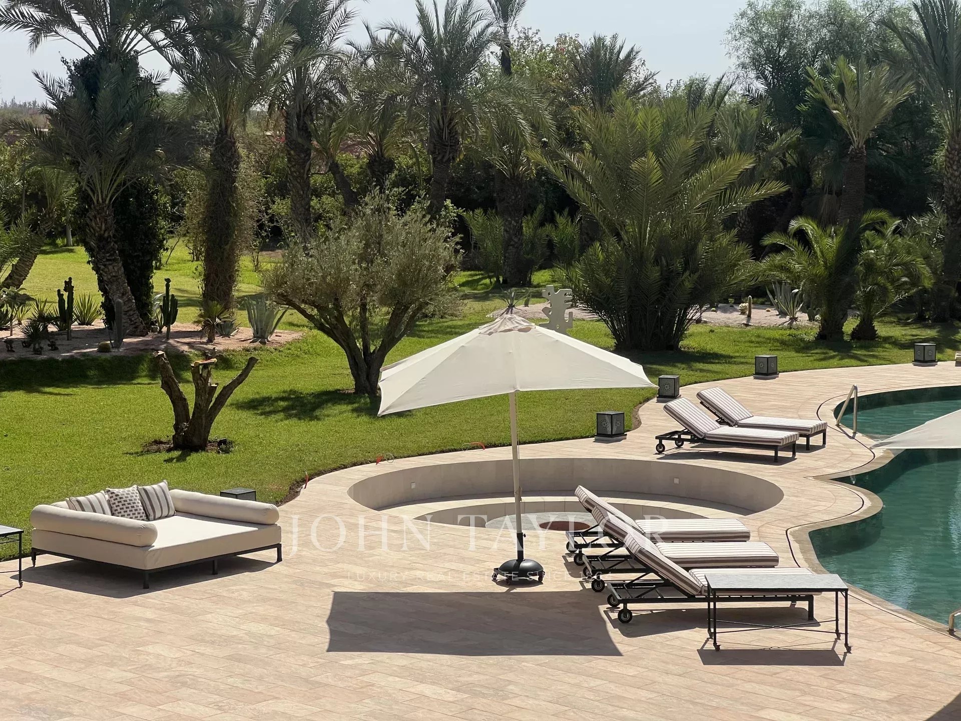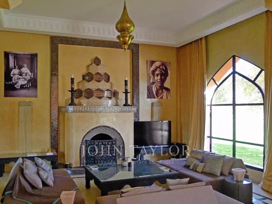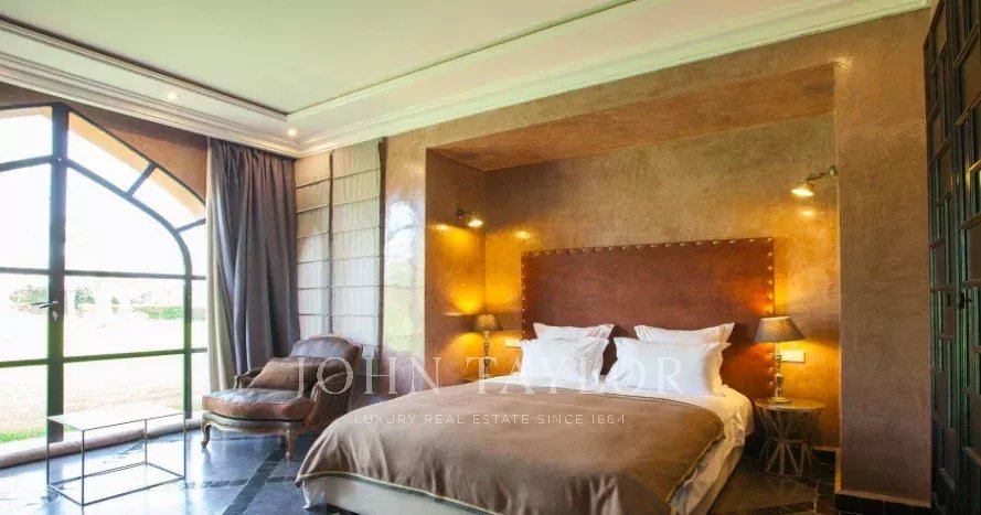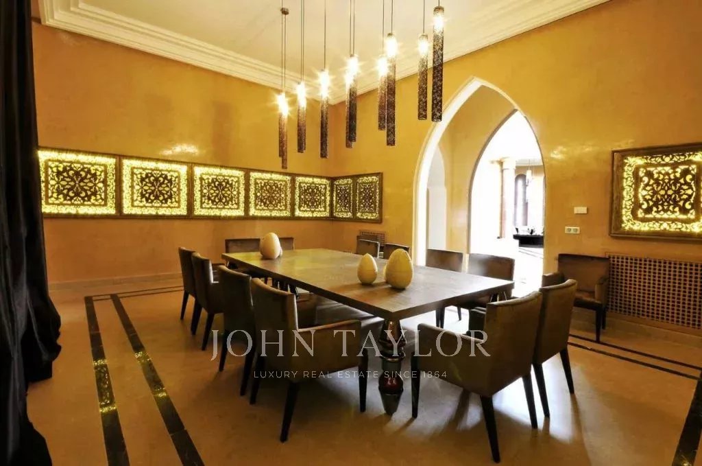 Cette propriété de prestige très lumineuse s’étend sur un splendide parc paysagé de 1 ha dans un secteur recherché de la Palmeraie à 20 mn du centre-ville de Marrakech.