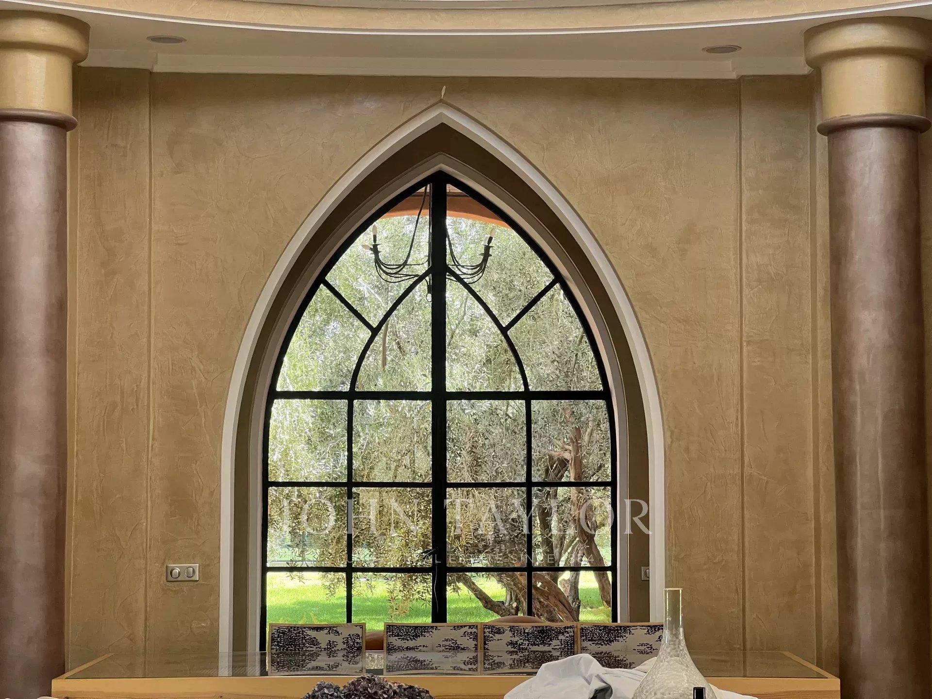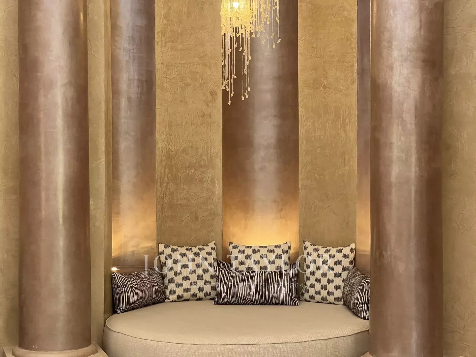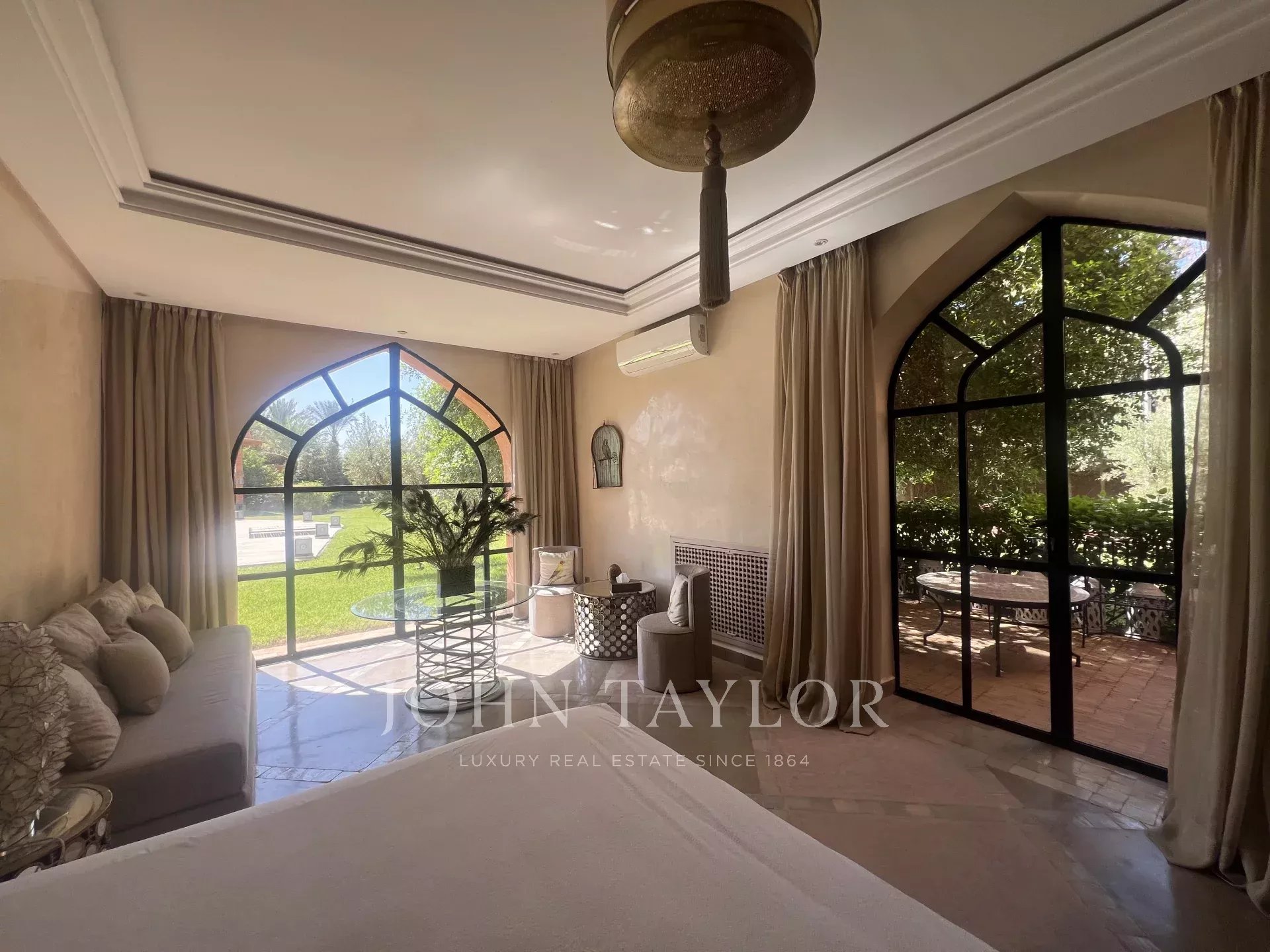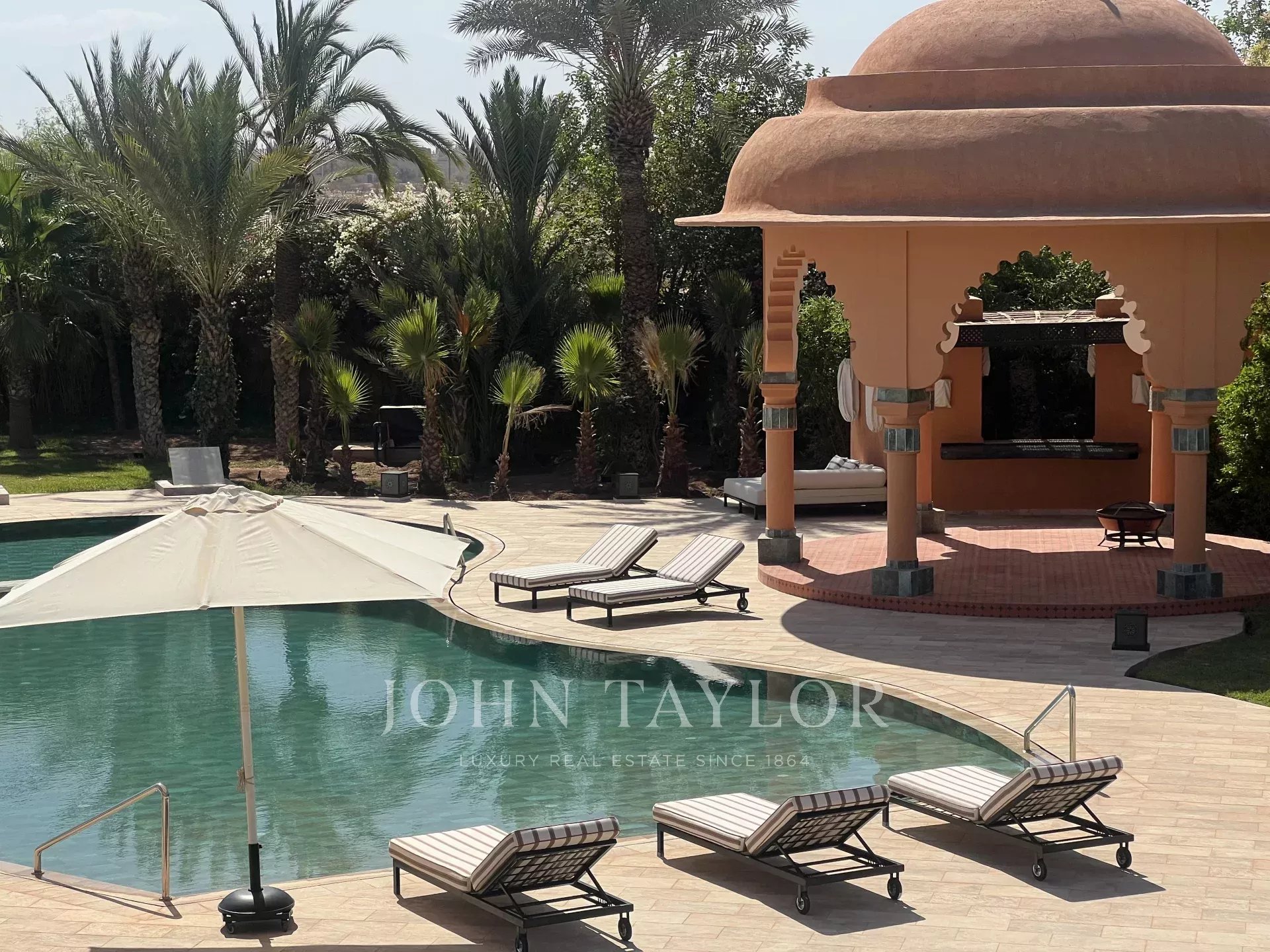 Cette propriété de prestige très lumineuse s’étend sur un splendide parc paysagé de 1 ha dans un secteur recherché de la Palmeraie à 20 mn du centre-ville de Marrakech.