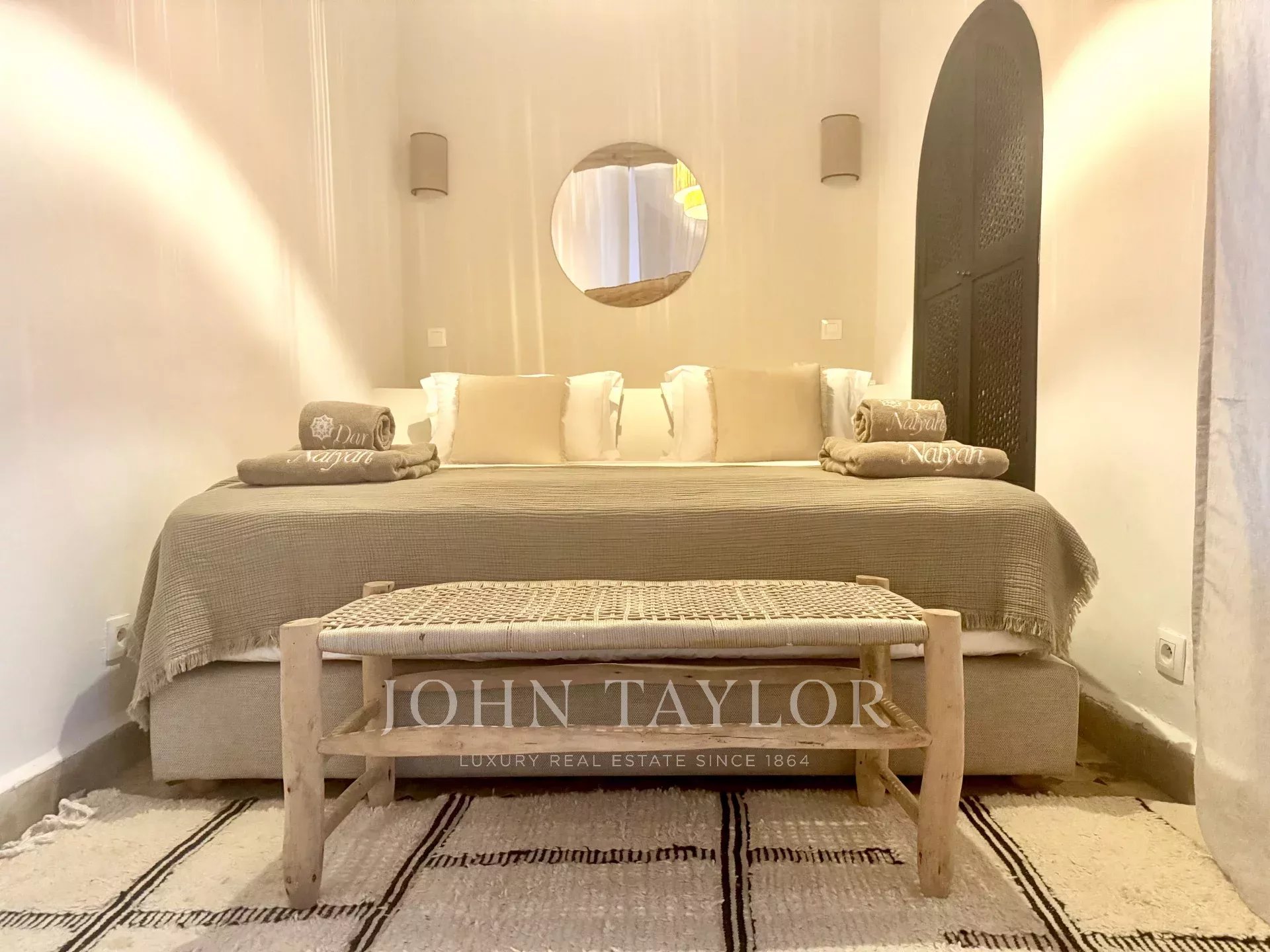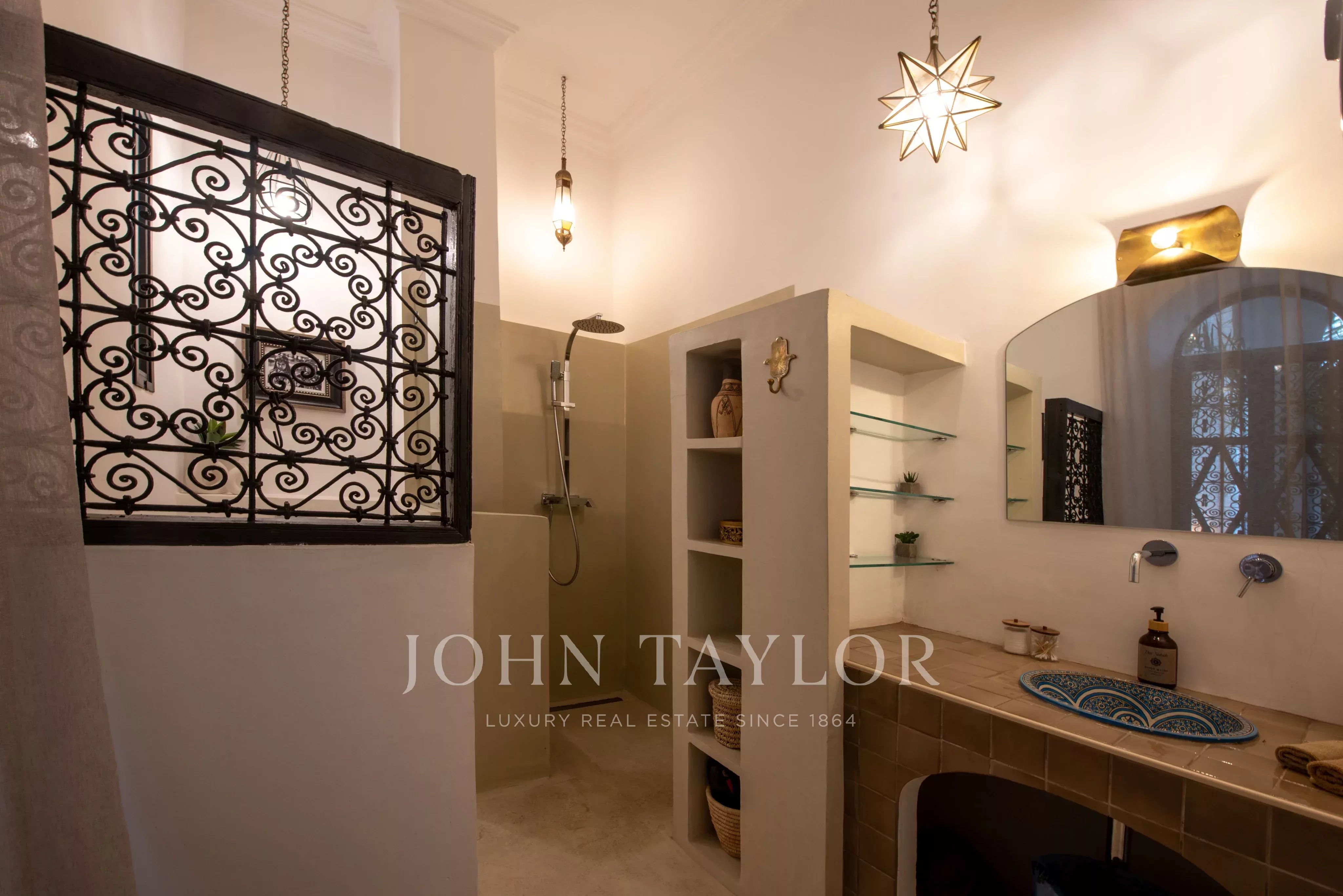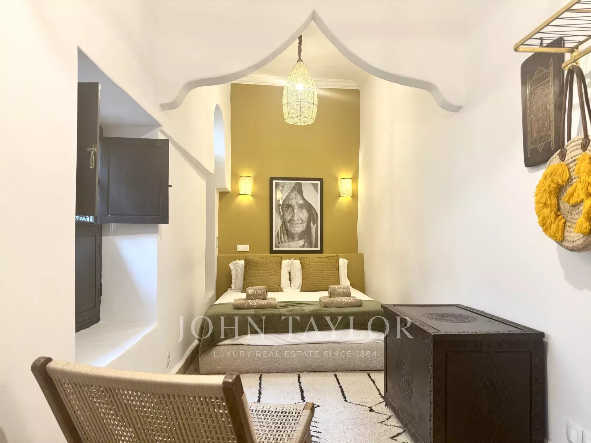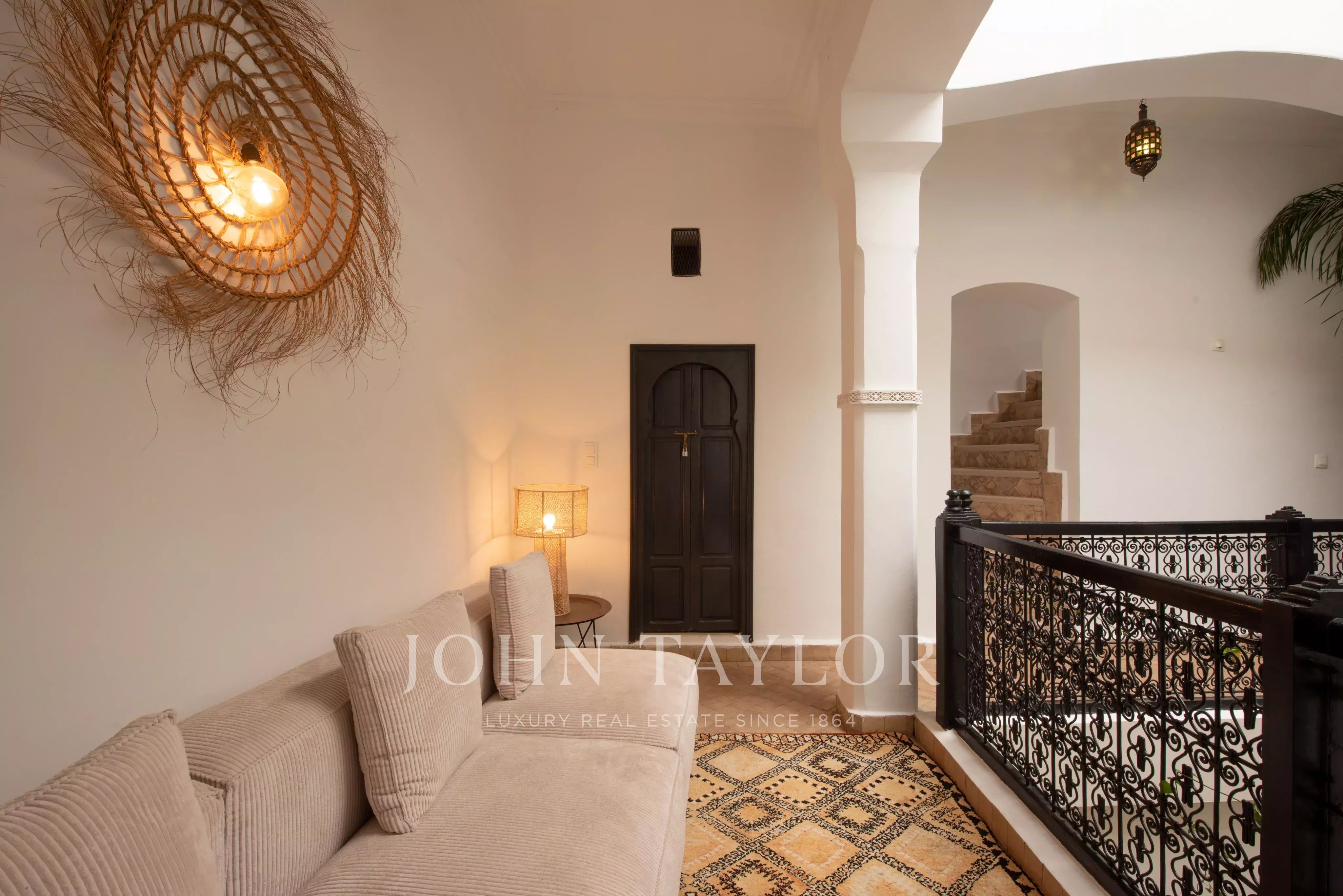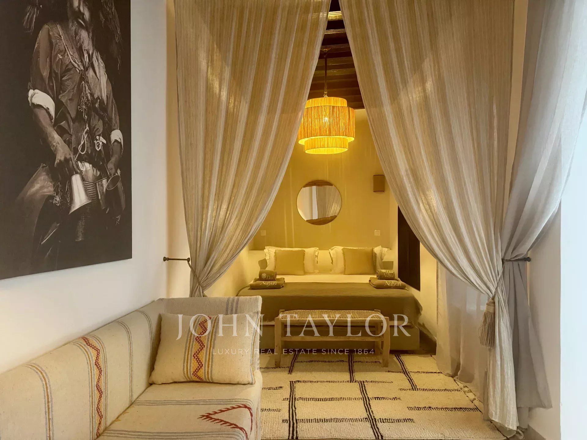 D'une surface au sol de 105m2, le Riad comprend autour d'un charmant patio avec bassin de rafraîchissement, salon d'été et toit électrique: une petite entrée, une belle pièce associant cuisine équipée et salle à manger, des toilettes invités ainsi qu'une vaste suite avec cheminée et salle de bain adjacente. Le premier étage accueille 2 vastes chambres avec salles de bain connectées par une jolie galerie ainsi qu'une buanderie.