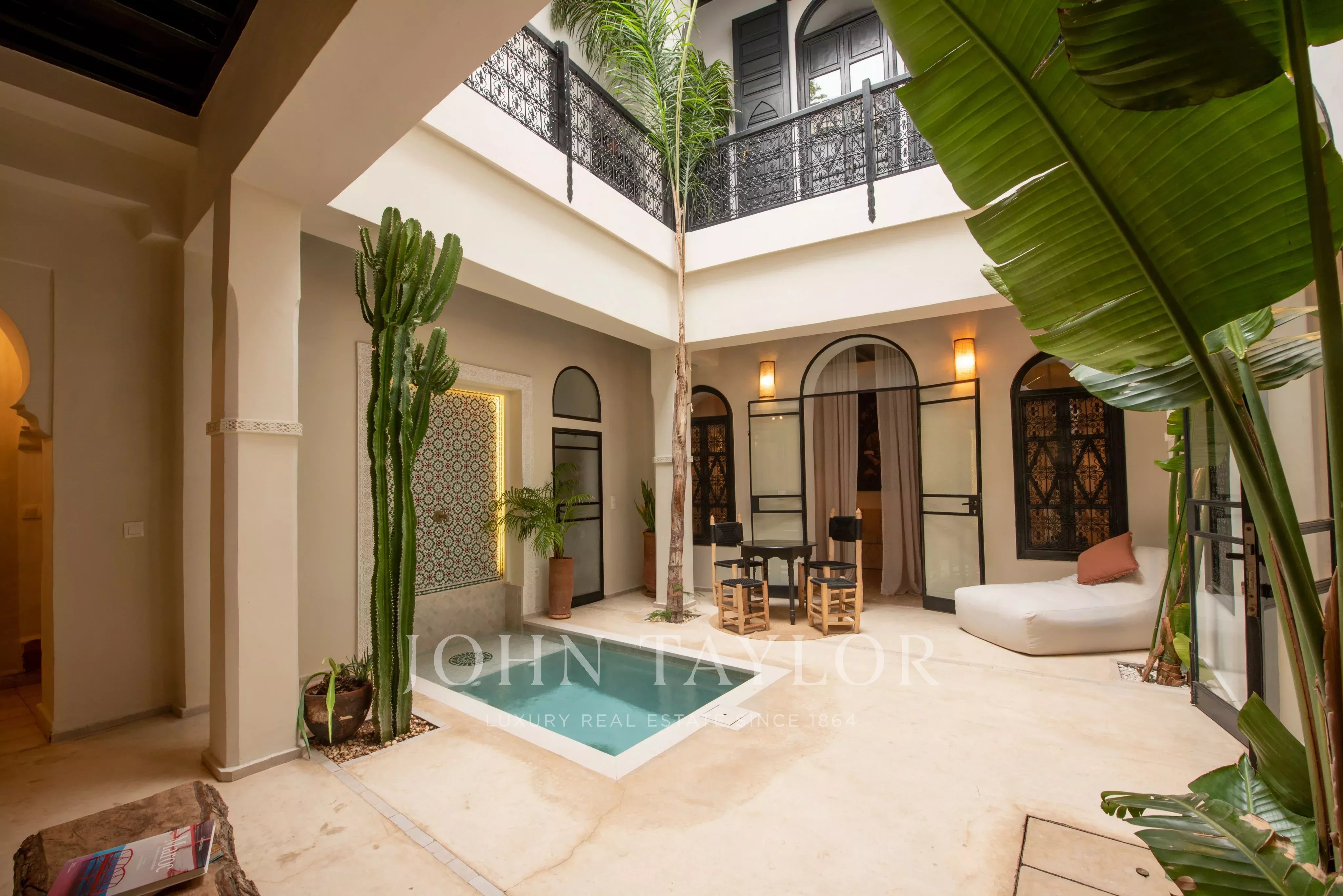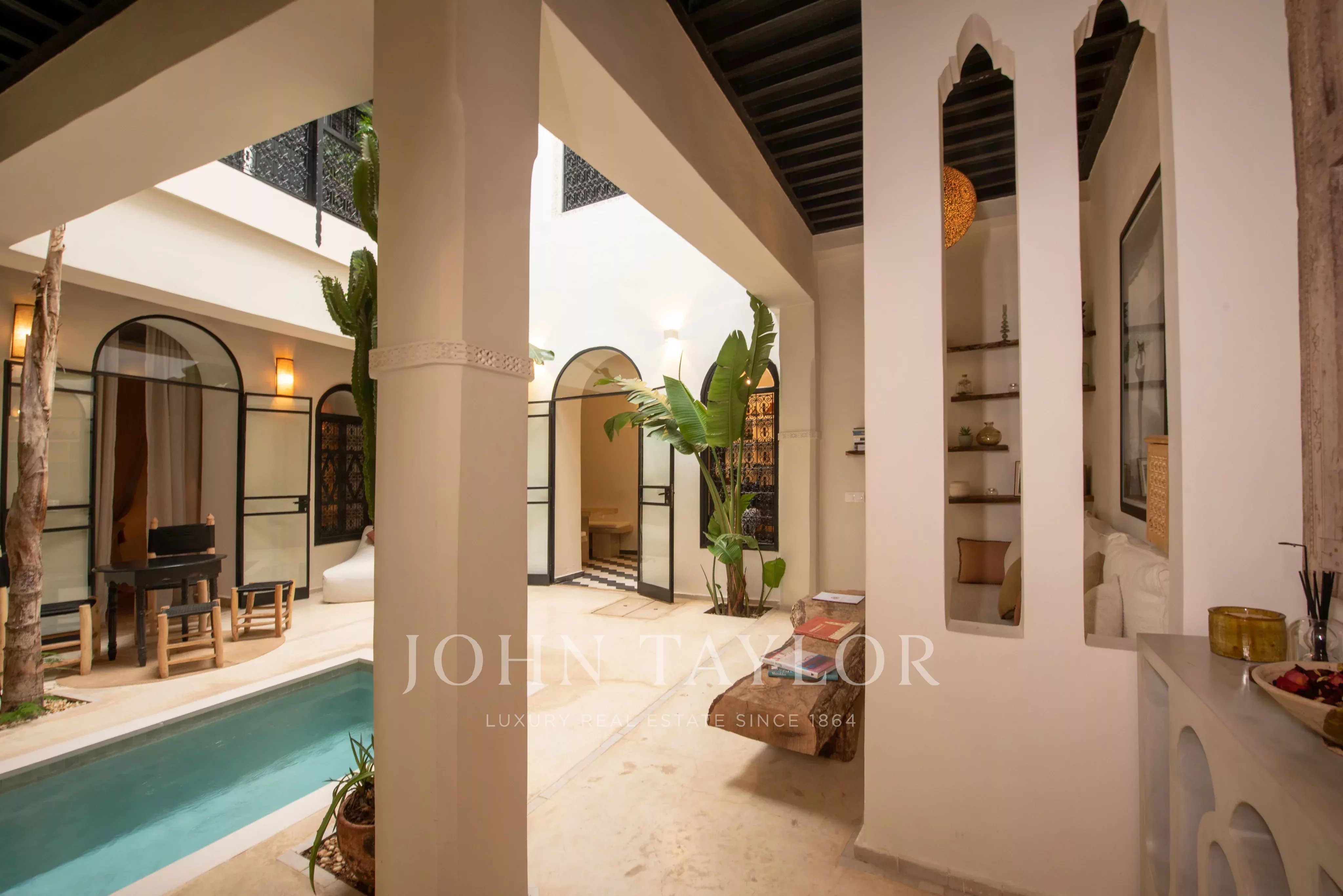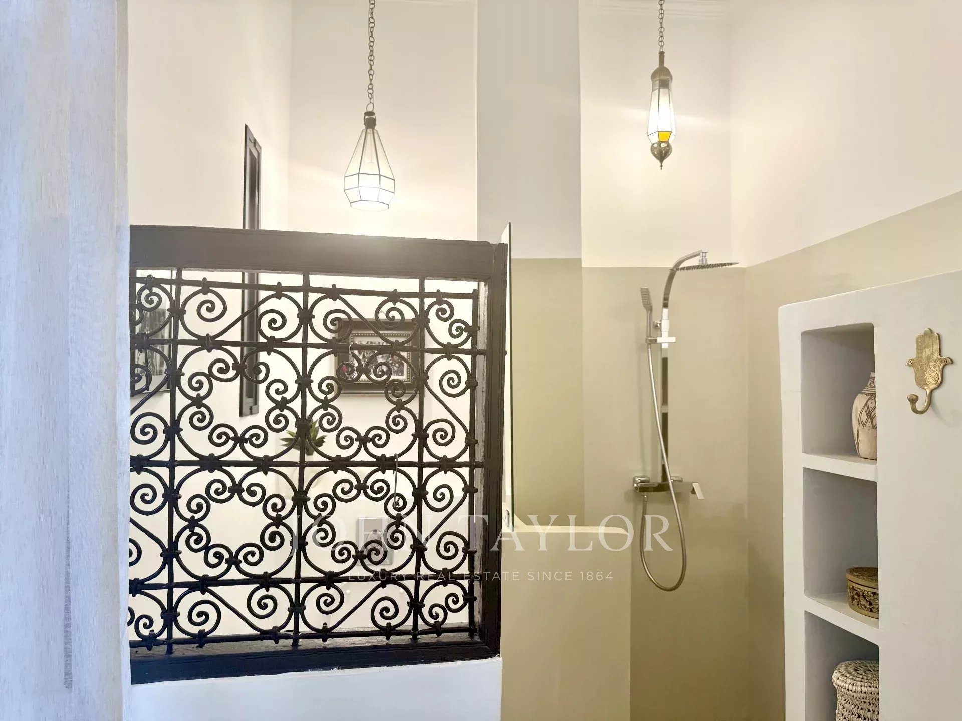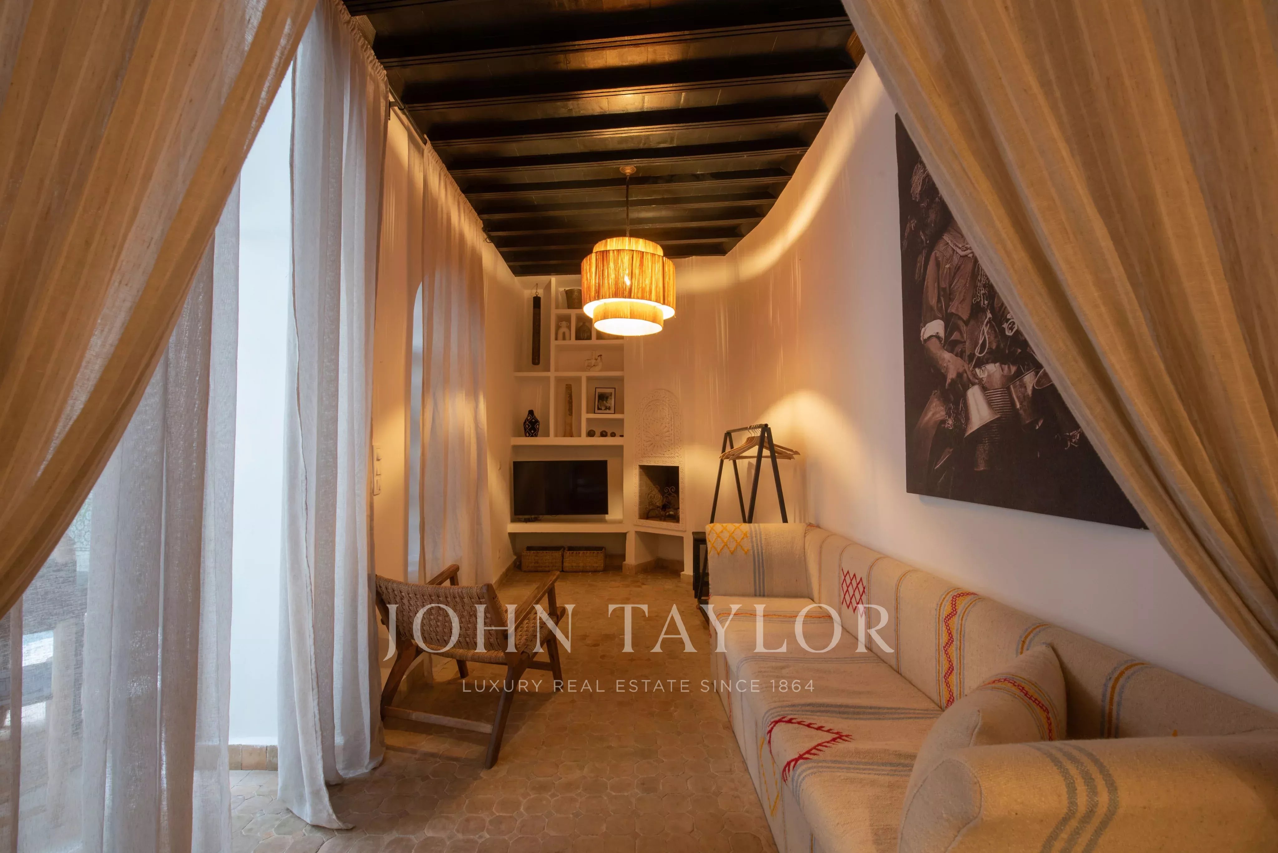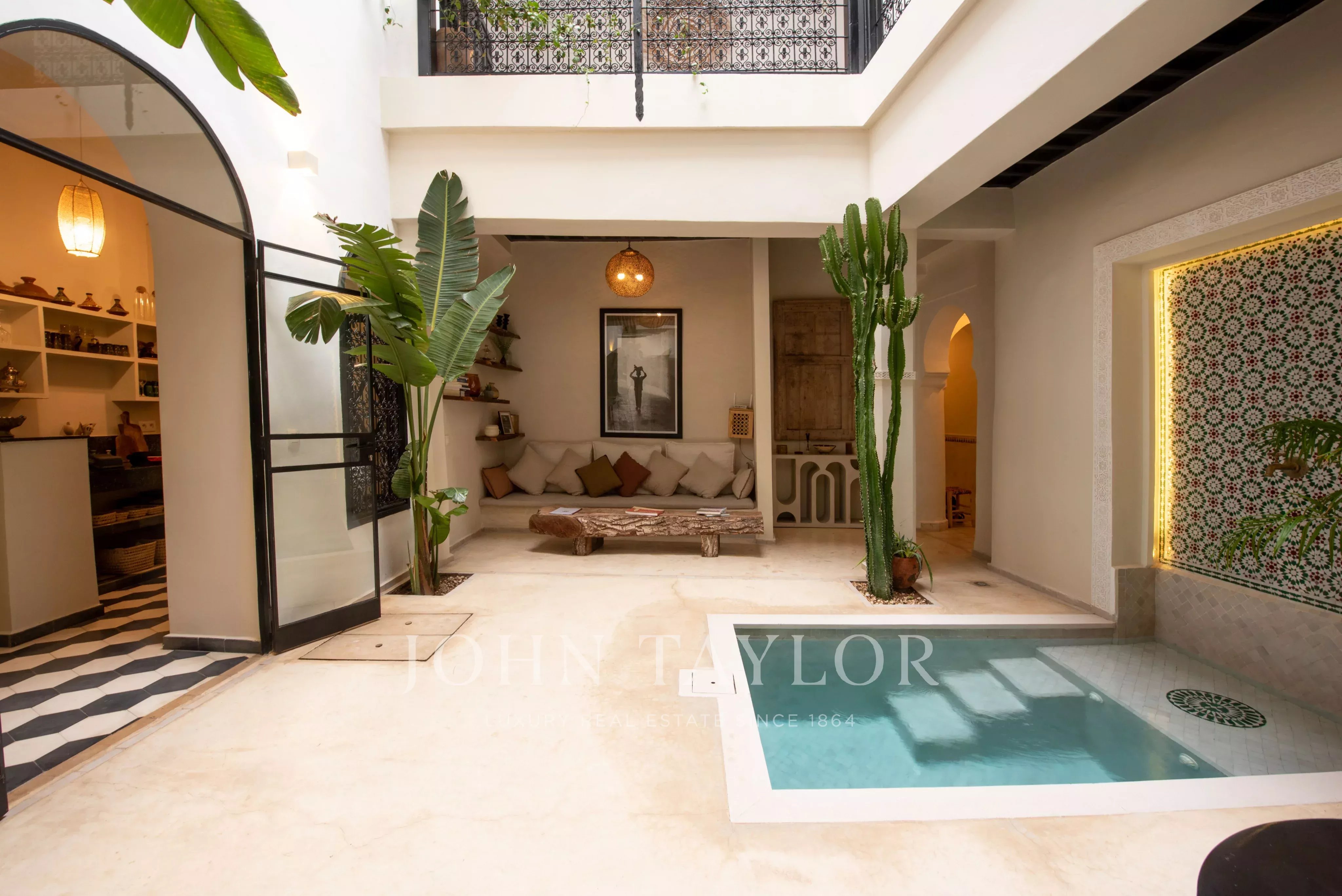 D'une surface au sol de 105m2, le Riad comprend autour d'un charmant patio avec bassin de rafraîchissement, salon d'été et toit électrique: une petite entrée, une belle pièce associant cuisine équipée et salle à manger, des toilettes invités ainsi qu'une vaste suite avec cheminée et salle de bain adjacente. Le premier étage accueille 2 vastes chambres avec salles de bain connectées par une jolie galerie ainsi qu'une buanderie.
