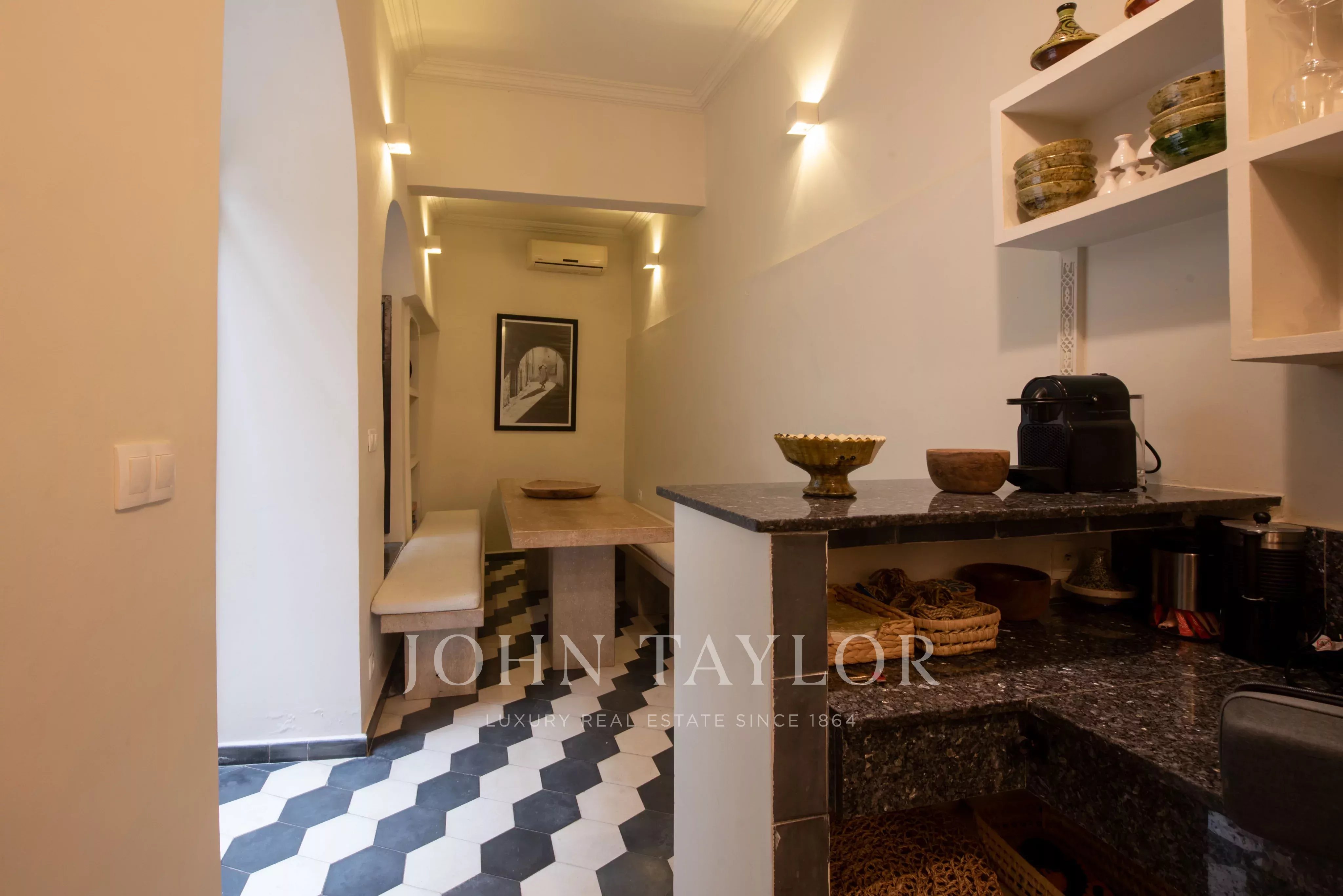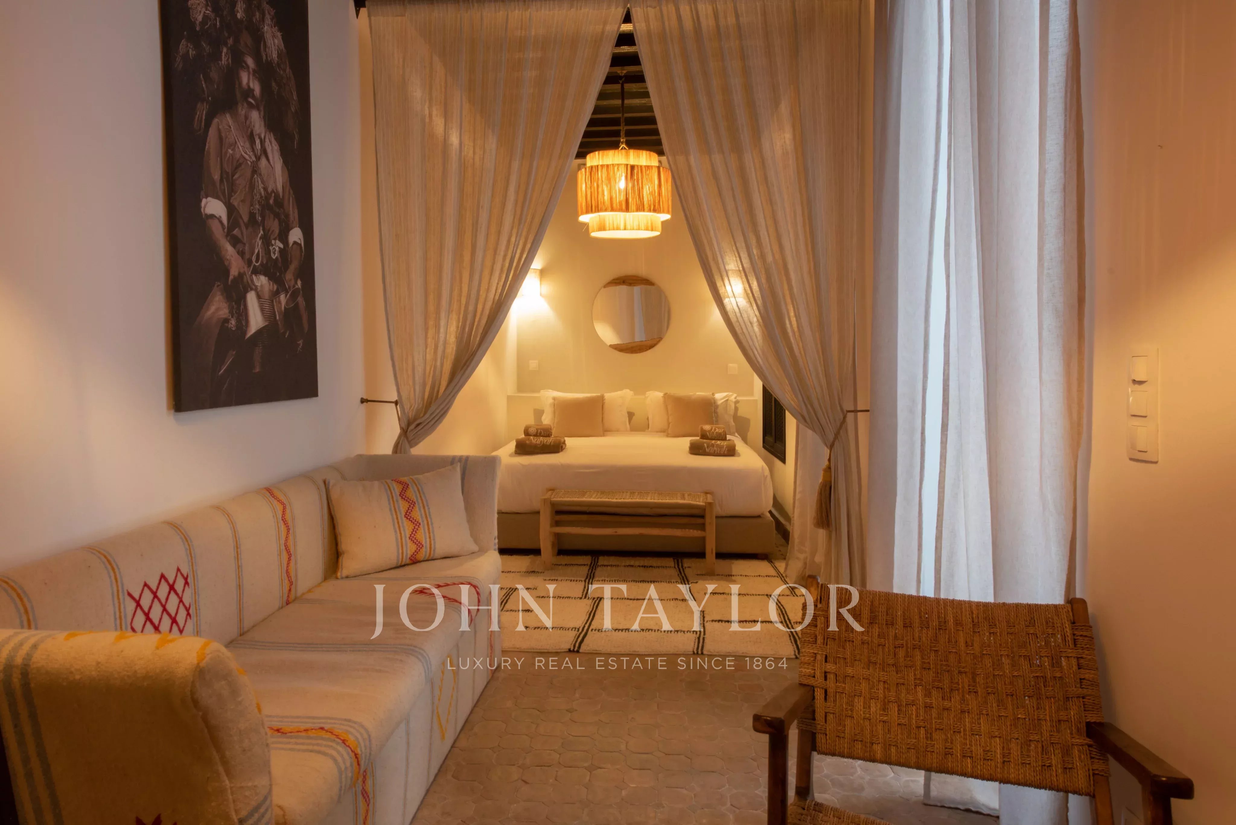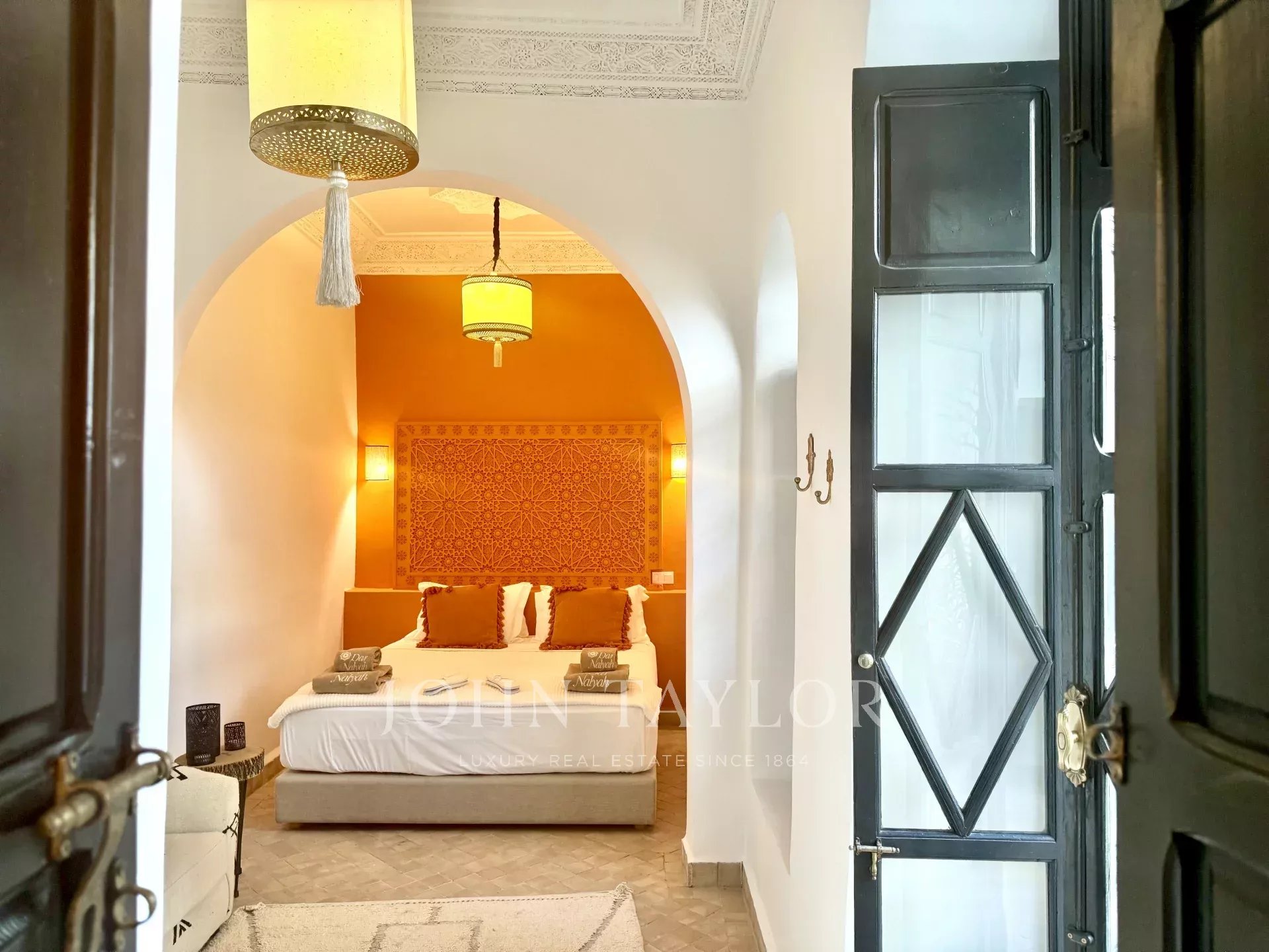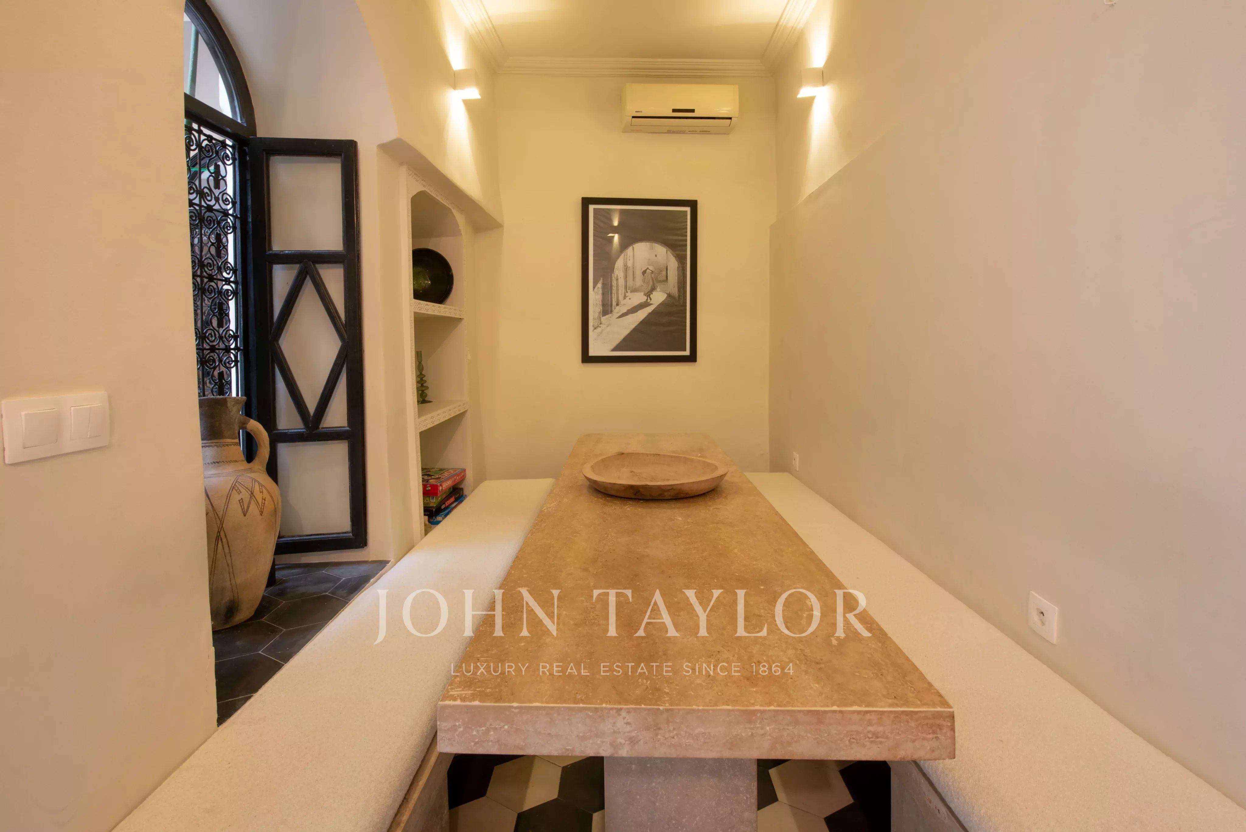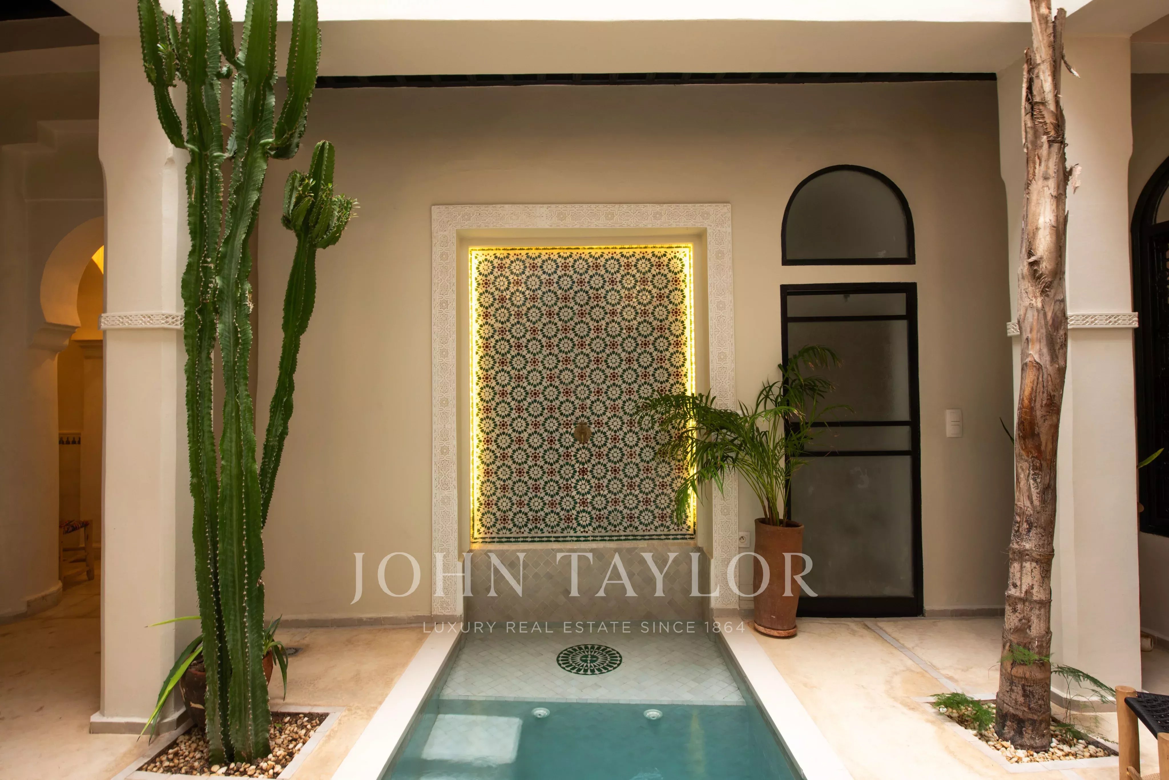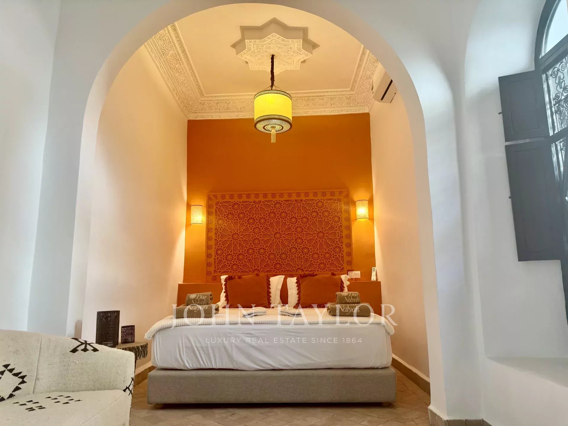 D'une surface au sol de 105m2, le Riad comprend autour d'un charmant patio avec bassin de rafraîchissement, salon d'été et toit électrique: une petite entrée, une belle pièce associant cuisine équipée et salle à manger, des toilettes invités ainsi qu'une vaste suite avec cheminée et salle de bain adjacente. Le premier étage accueille 2 vastes chambres avec salles de bain connectées par une jolie galerie ainsi qu'une buanderie.