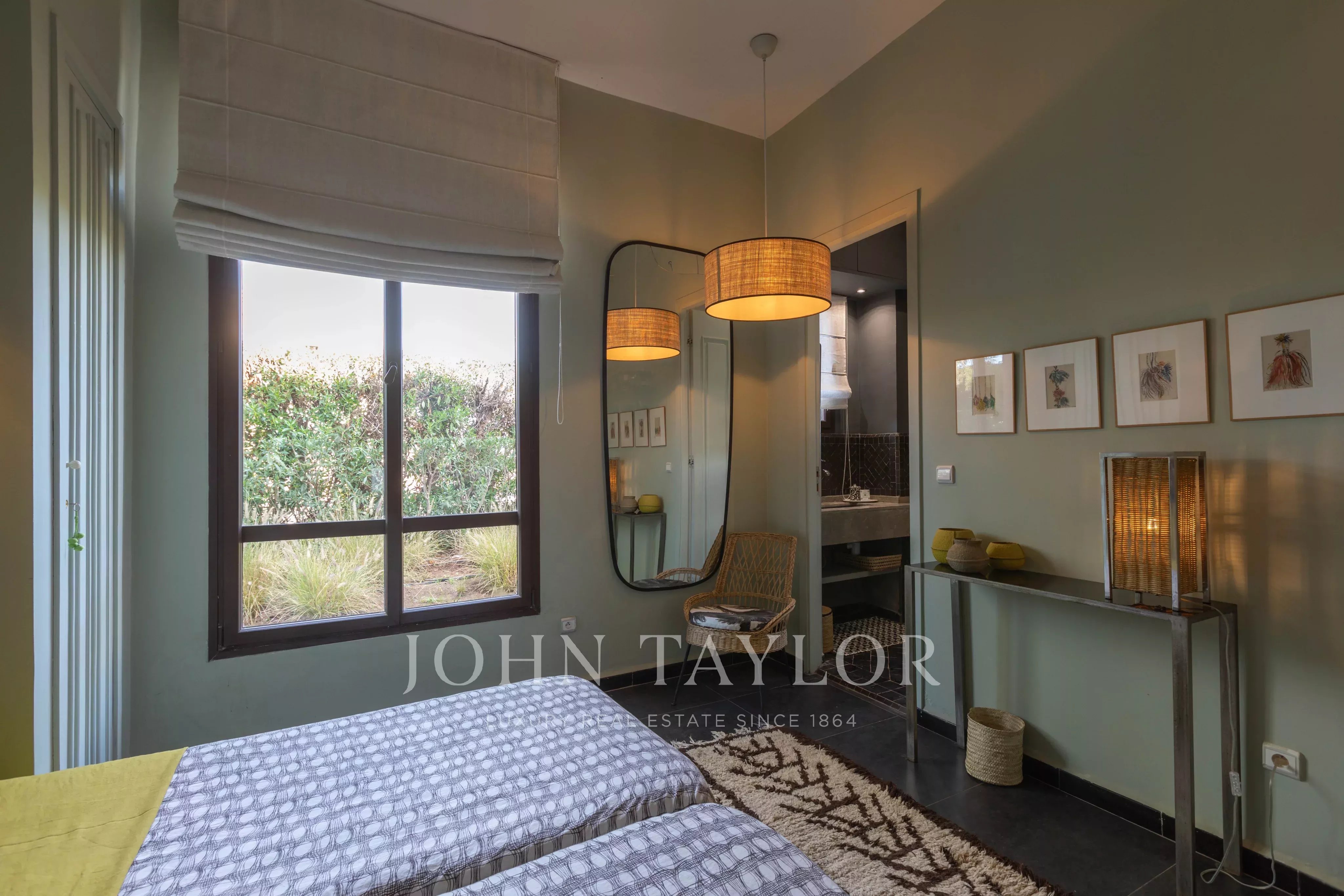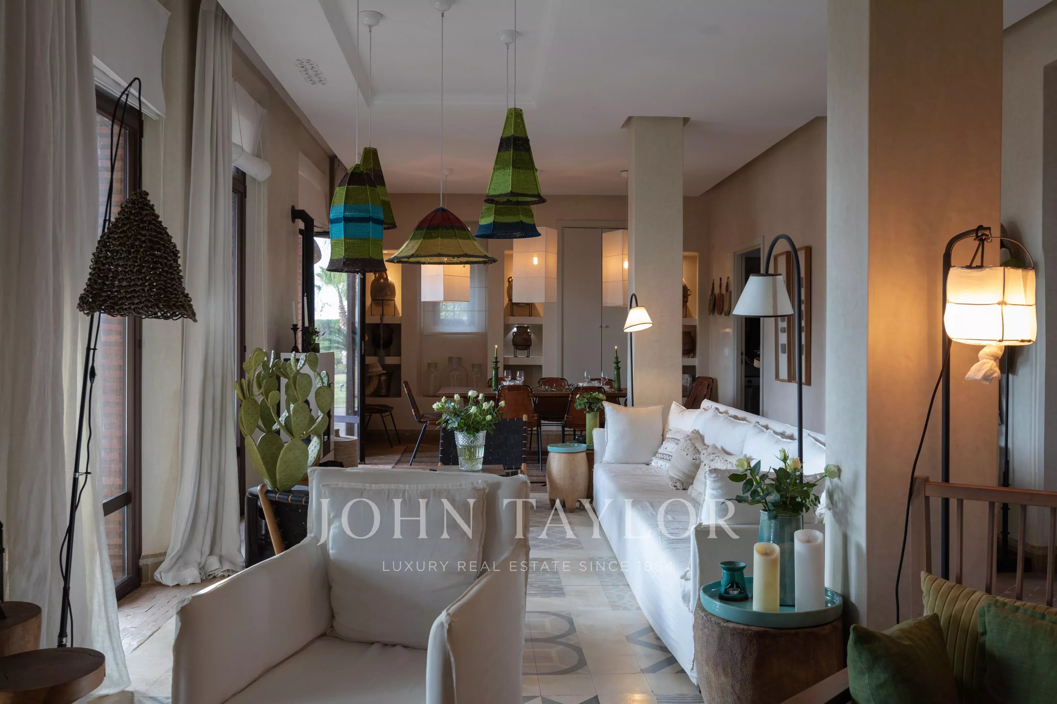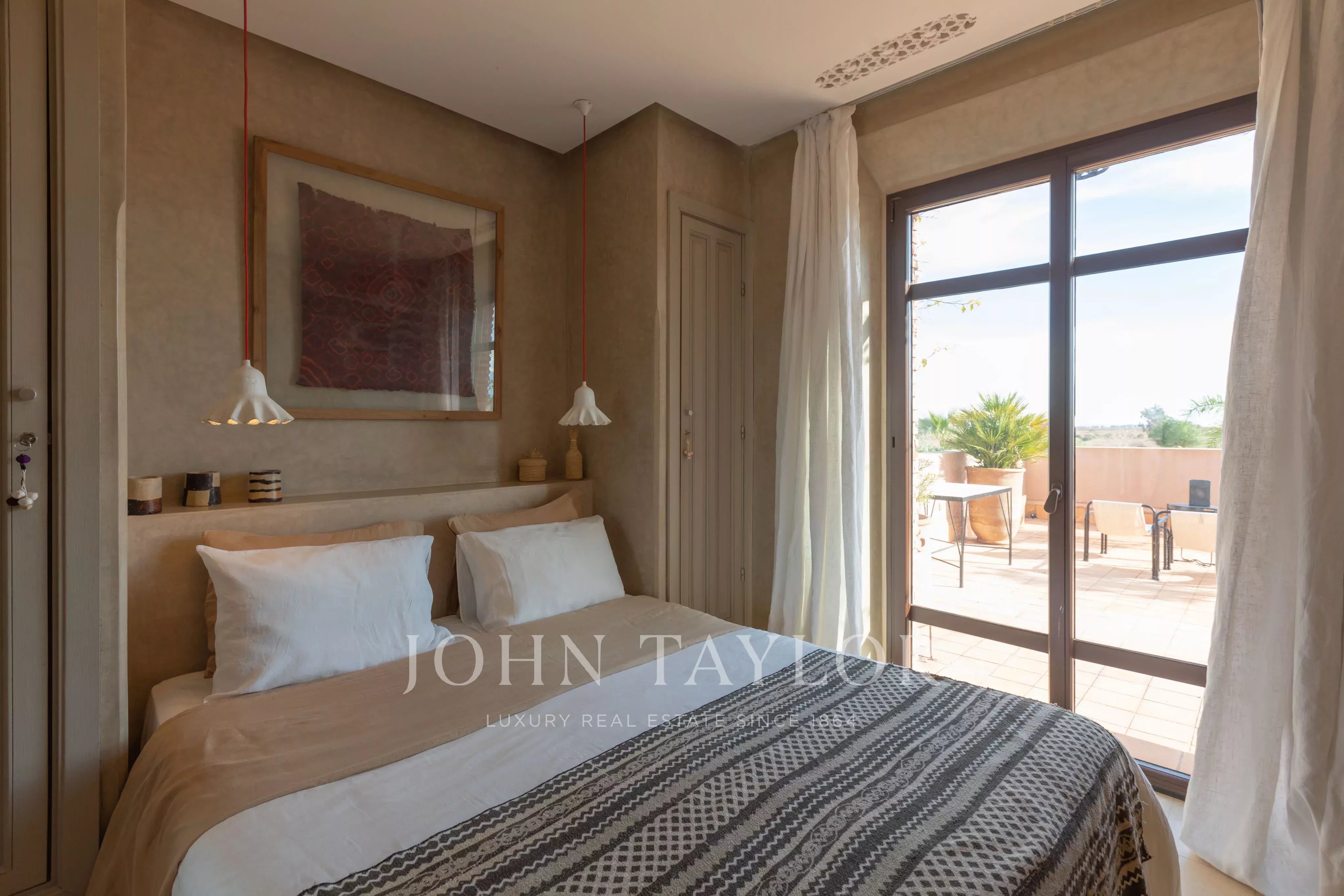 Nichée dans un jardin de 1 600m2 hébergeant une piscine privative, un espace repas convivial et un barbecue, la villa sur 2 niveaux offre une superbe vue le golf et la chaîne de l'Atlas.