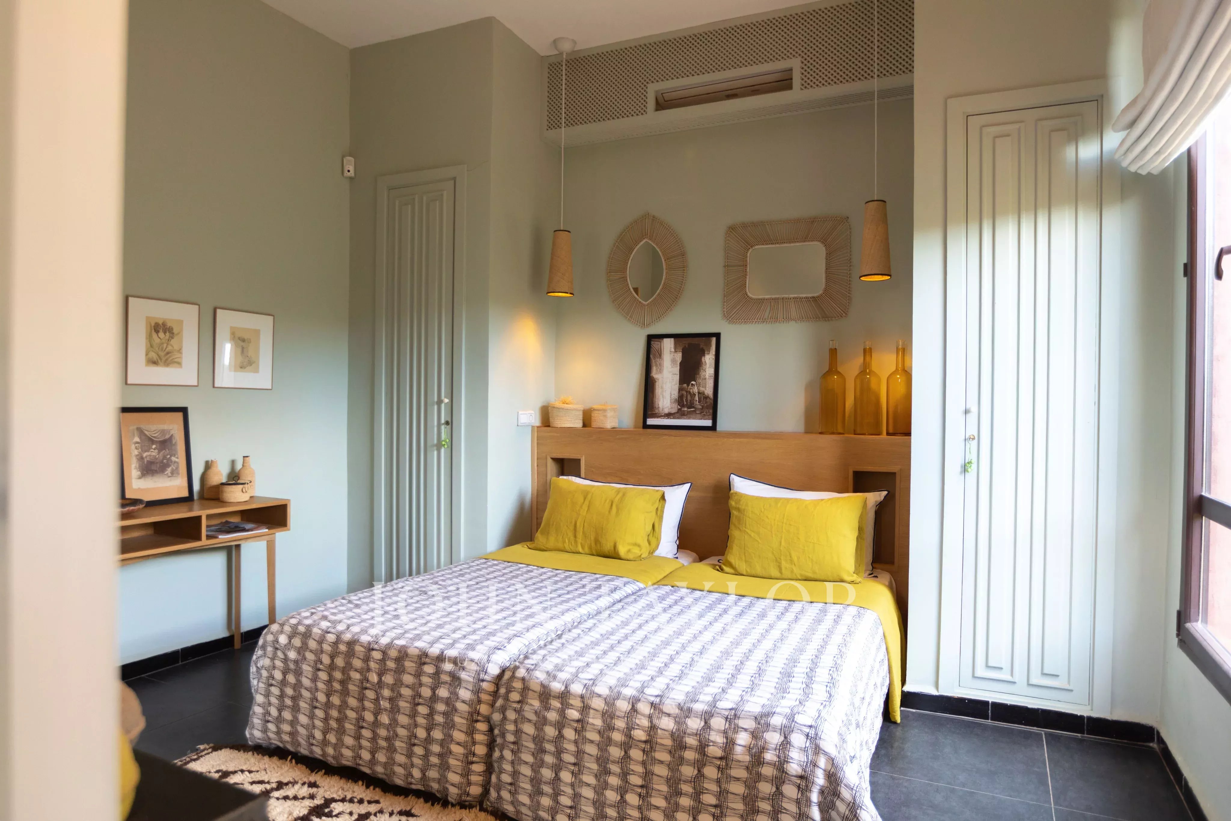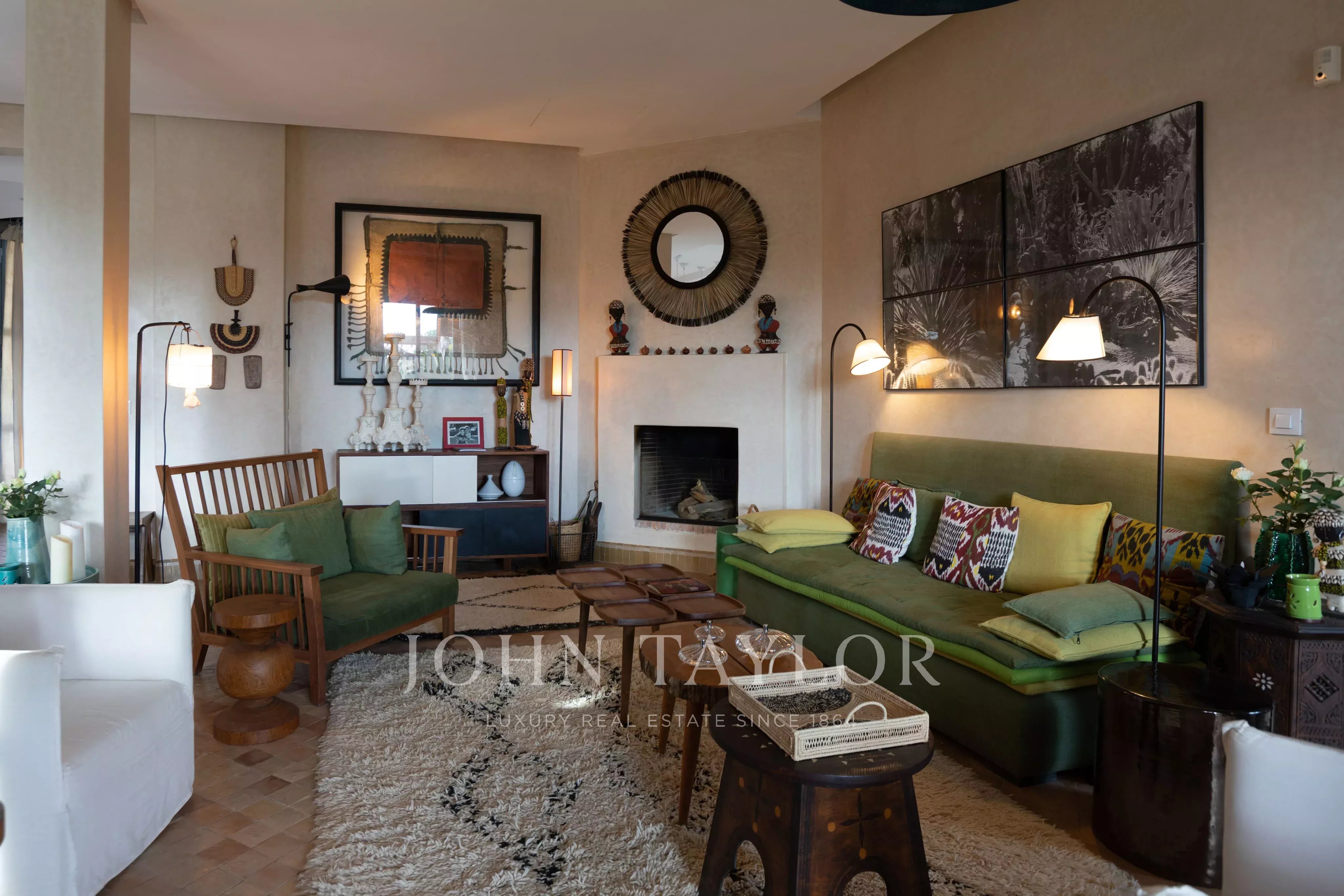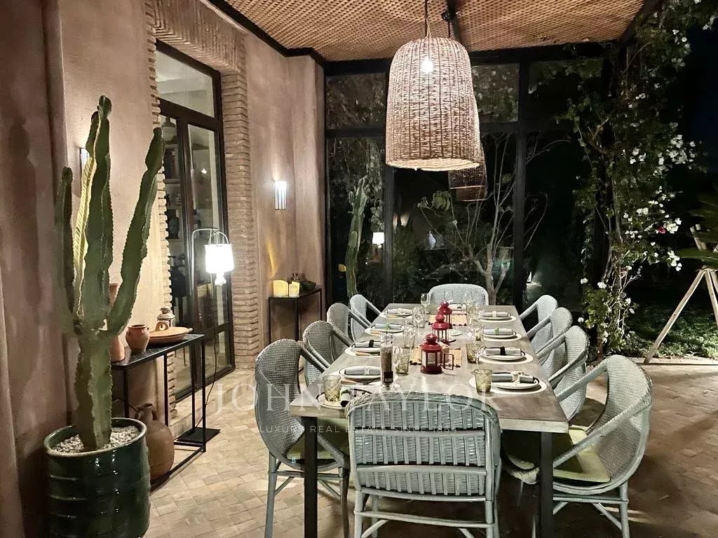 Nichée dans un jardin de 1 600m2 hébergeant une piscine privative, un espace repas convivial et un barbecue, la villa sur 2 niveaux offre une superbe vue le golf et la chaîne de l'Atlas.