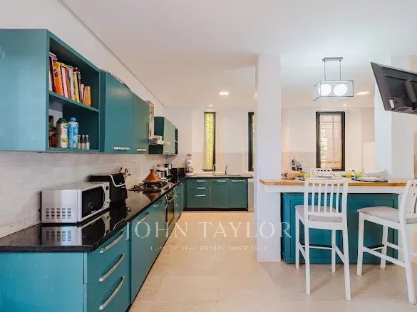 Nichée dans un jardin mature de 1 300m2, la villa sur 2 niveaux propose de beaux espaces de vie ouvrant sur la terrasse abritée et la piscine, une cuisine équipée ainsi que 4 chambres spacieuses avec salles de bain.