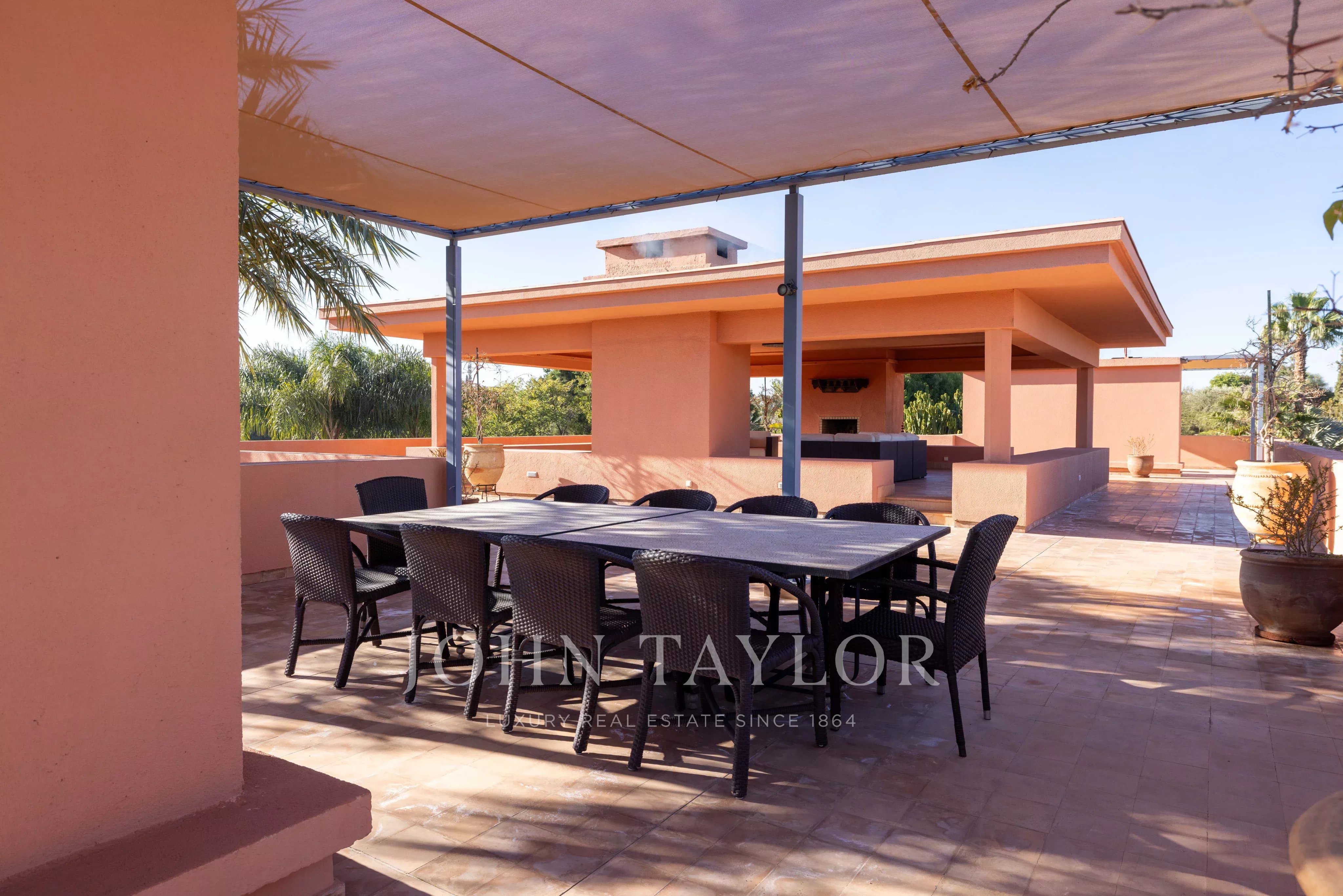 A noter: un superbe toit-terrasse avec cuisine d'été, salon abrité avec cheminée et espace repas: la vue sur la chaîne de l'Atlas est somptueuse.