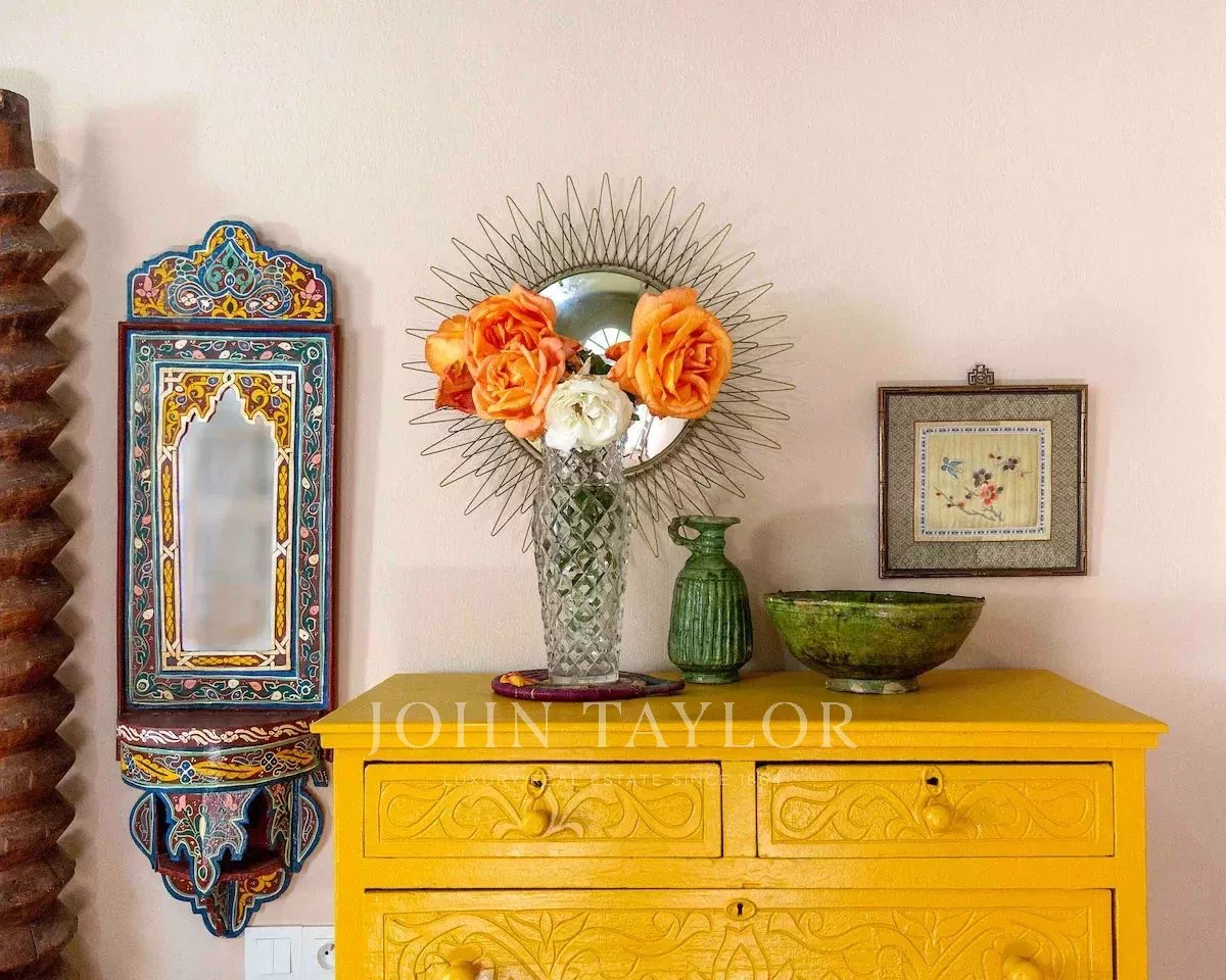 D'une surface au sol de 190m2, il comprend autour d'un charmant patio avec fontaine centrale: une entrée, des toilettes invités, une cuisine équipée, une salle à manger avec cheminée ainsi que 6 chambres avec salles de bain.