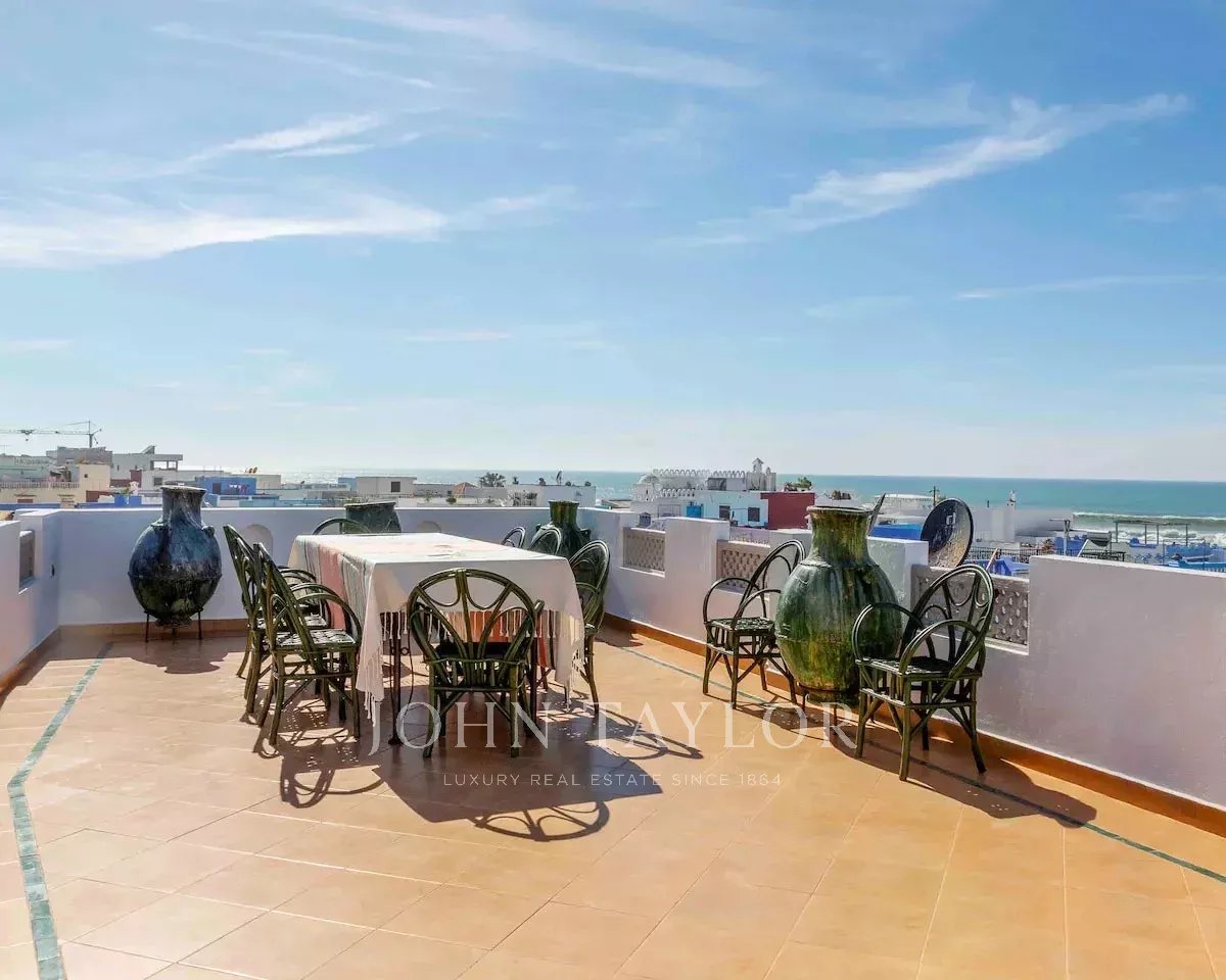 La vaste terrasse héberge un espace repas abrité et offre une superbe vue sur la Medina et l'océan.