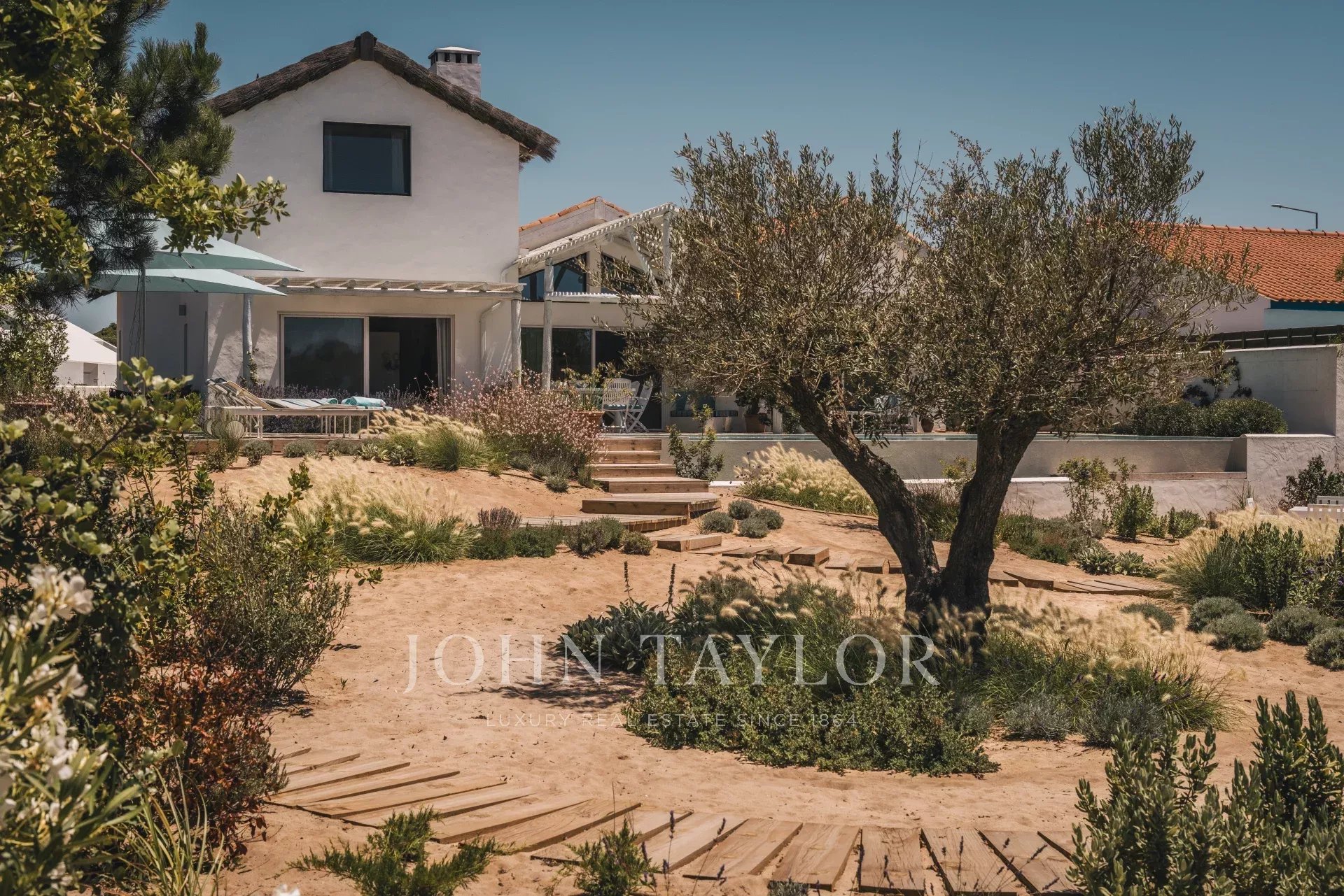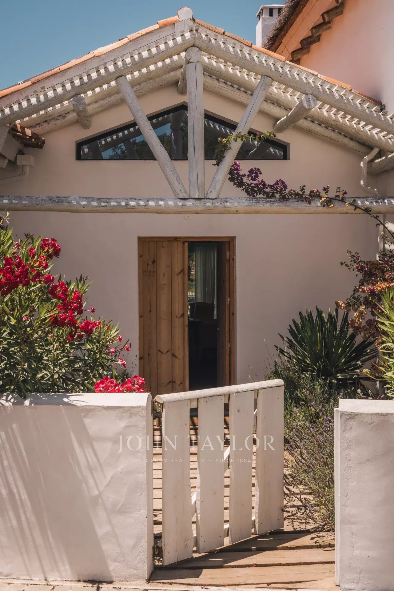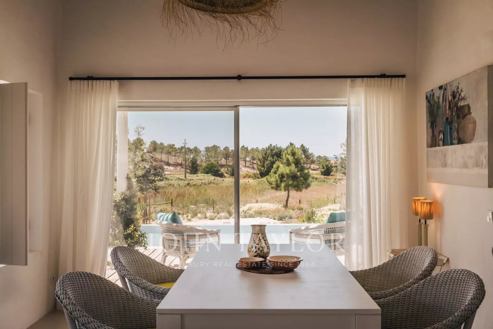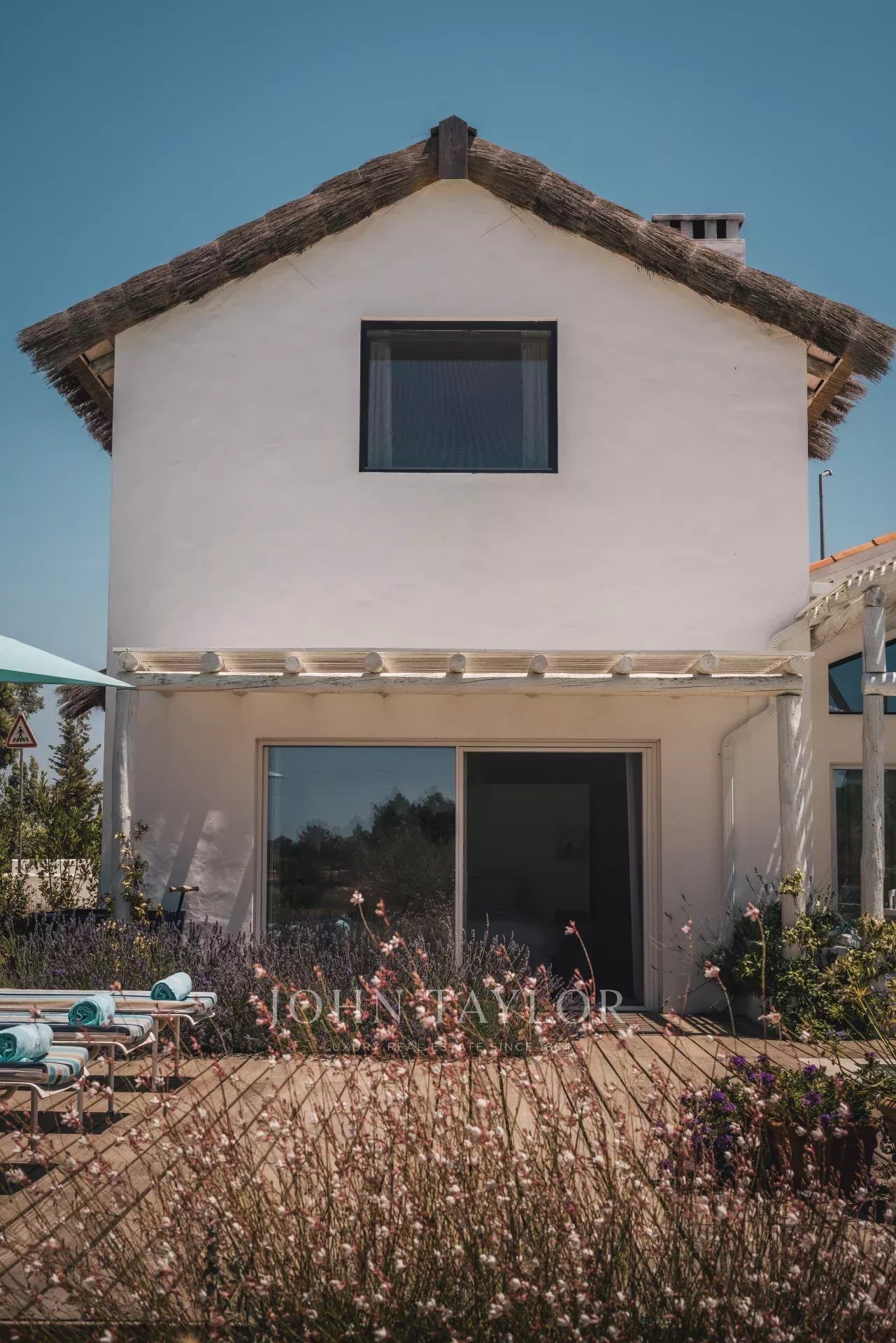 Charmante villa au style d'architecture traditionnelle de la région de Comporta, avec une vue imprenable sur la pinède, composée de 4 chambres en suite, salon, salle à manger et cuisine ouverte. À l'extérieur, il y a plusieurs porches avec des espaces pour se détendre et profiter de la nature environnante, une salle à manger à côté de la piscine avec intimité et une vue imprenable sur la pinède.