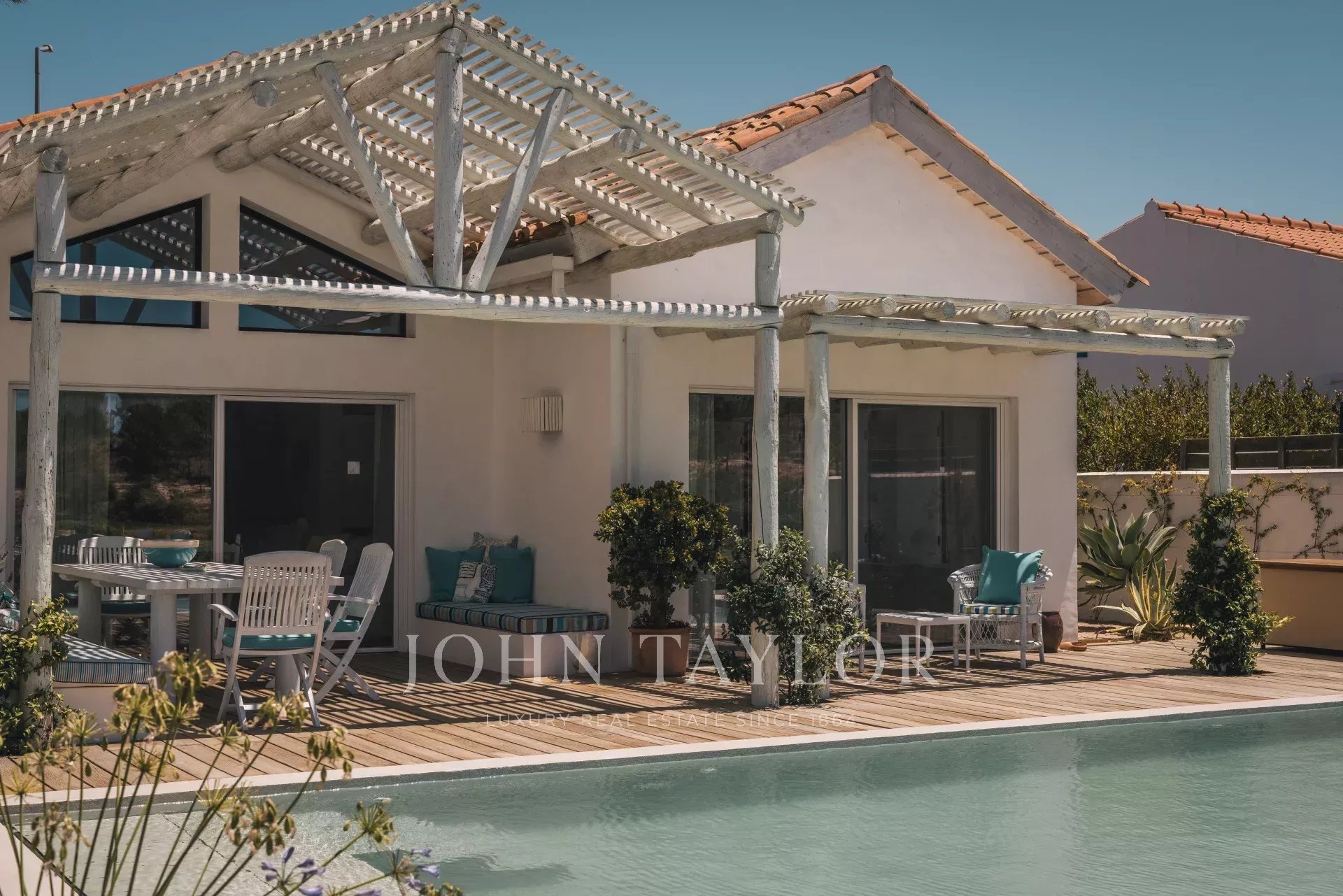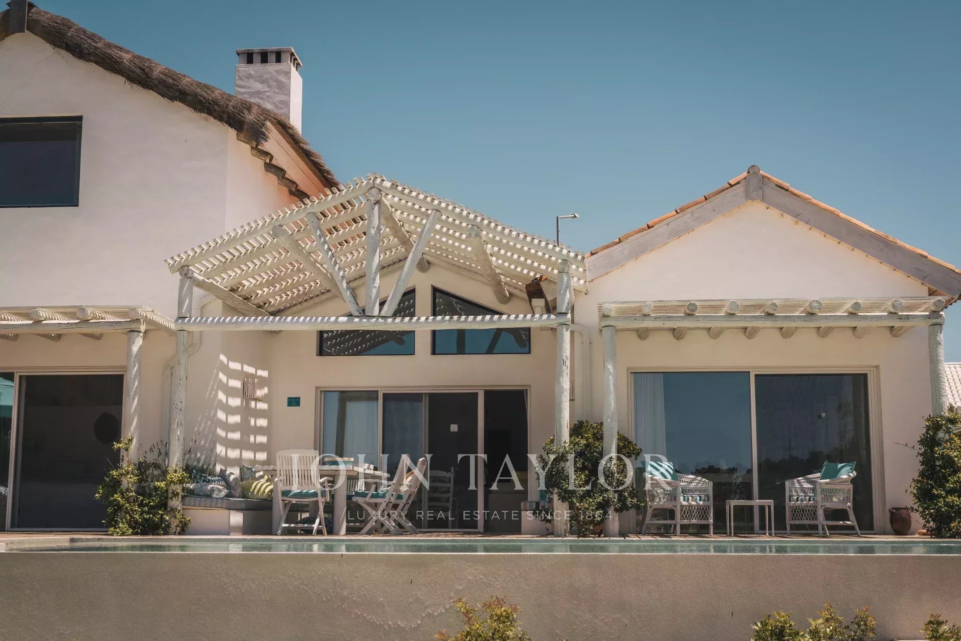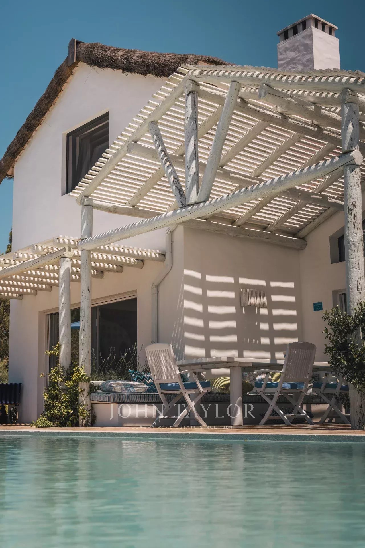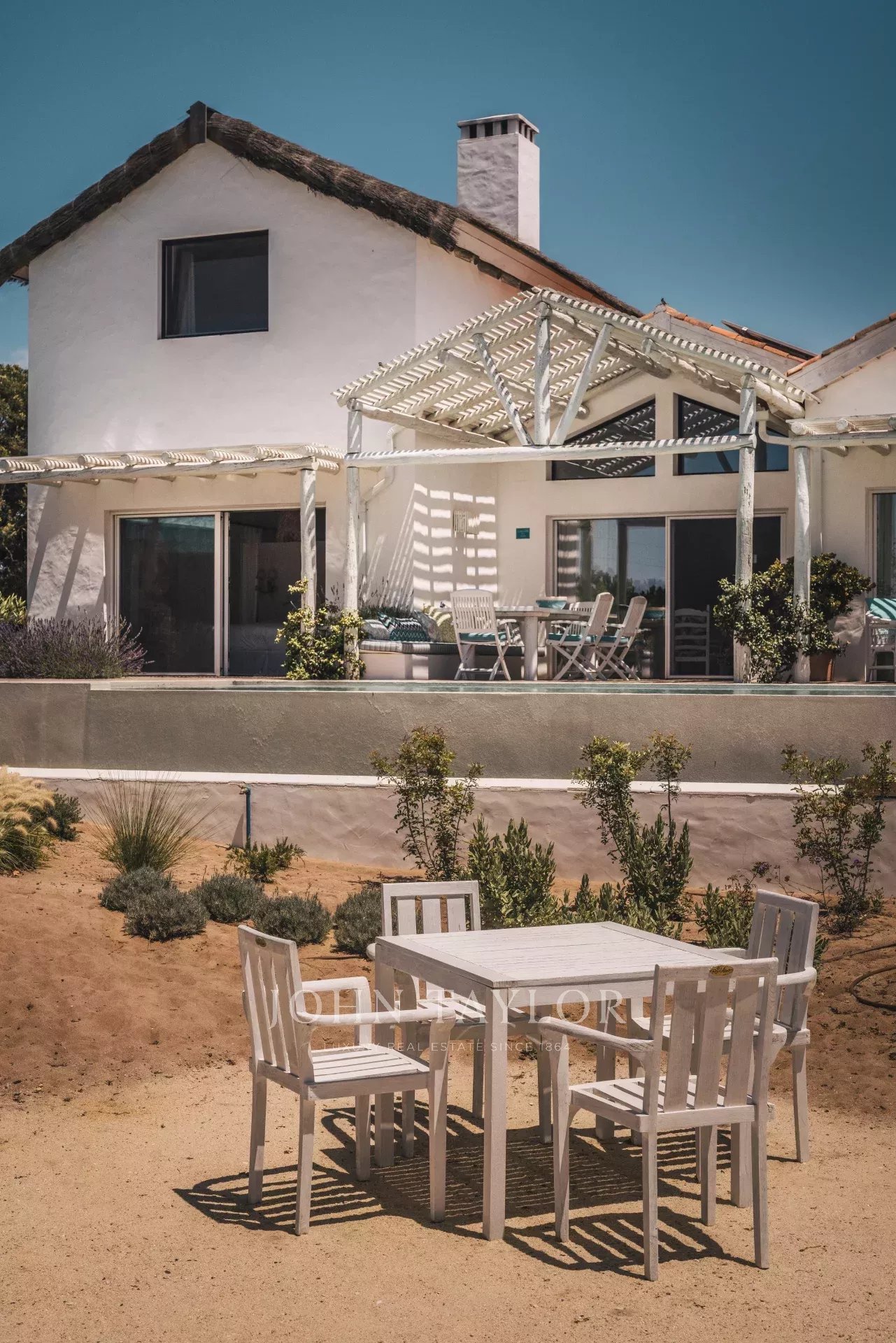 Charmante villa au style d'architecture traditionnelle de la région de Comporta, avec une vue imprenable sur la pinède, composée de 4 chambres en suite, salon, salle à manger et cuisine ouverte. À l'extérieur, il y a plusieurs porches avec des espaces pour se détendre et profiter de la nature environnante, une salle à manger à côté de la piscine avec intimité et une vue imprenable sur la pinède.