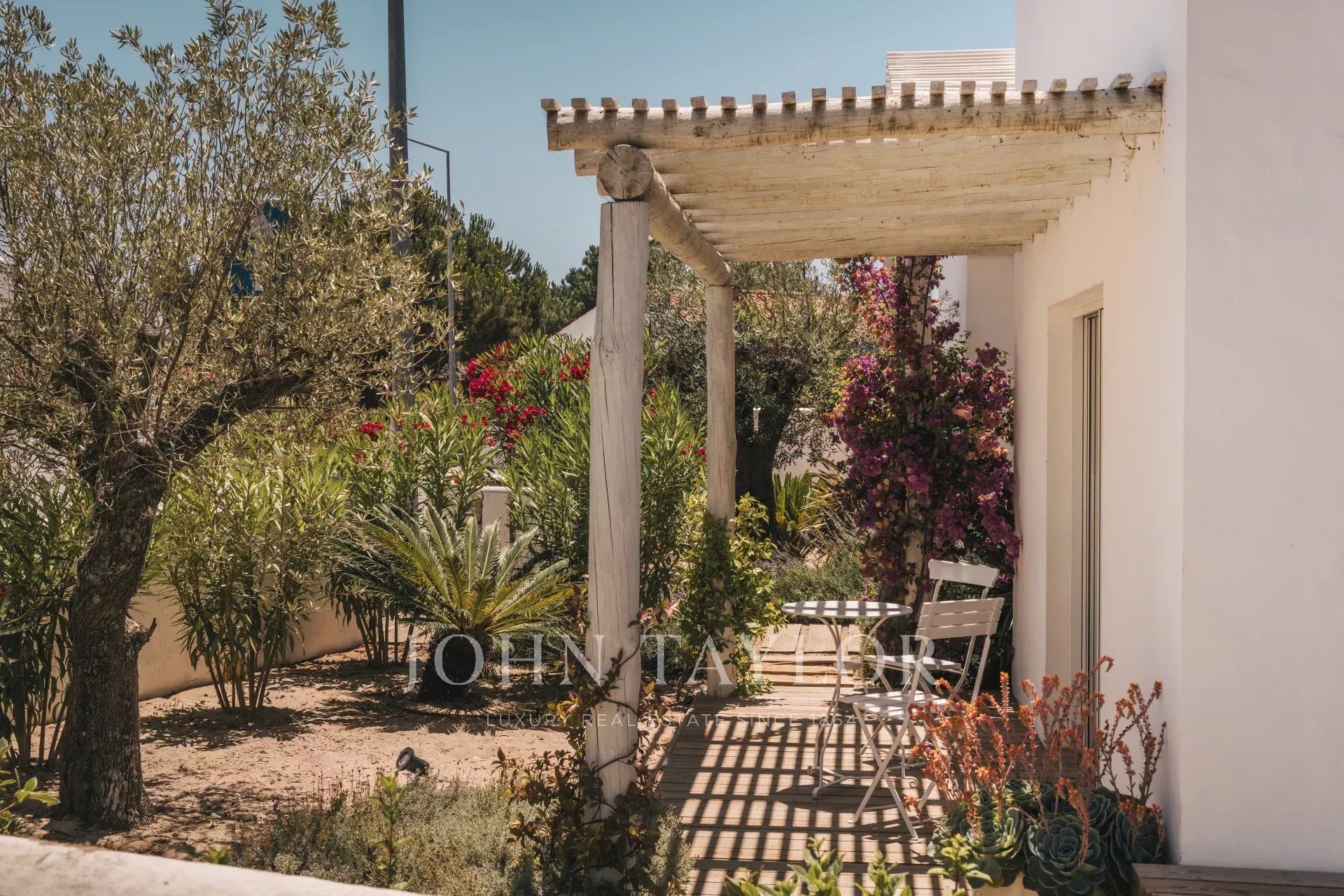 Charmante villa au style d'architecture traditionnelle de la région de Comporta, avec une vue imprenable sur la pinède, composée de 4 chambres en suite, salon, salle à manger et cuisine ouverte. À l'extérieur, il y a plusieurs porches avec des espaces pour se détendre et profiter de la nature environnante, une salle à manger à côté de la piscine avec intimité et une vue imprenable sur la pinède.