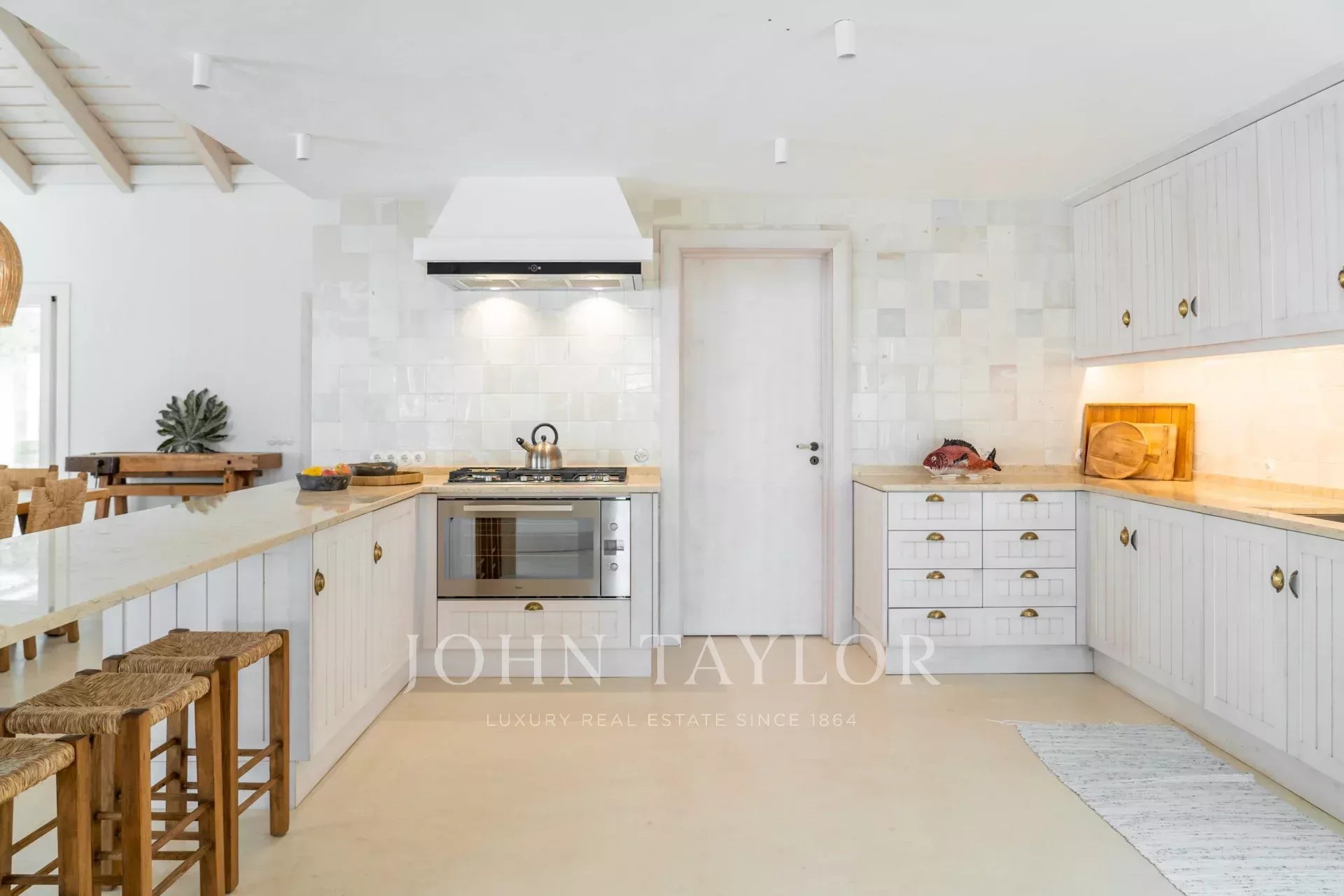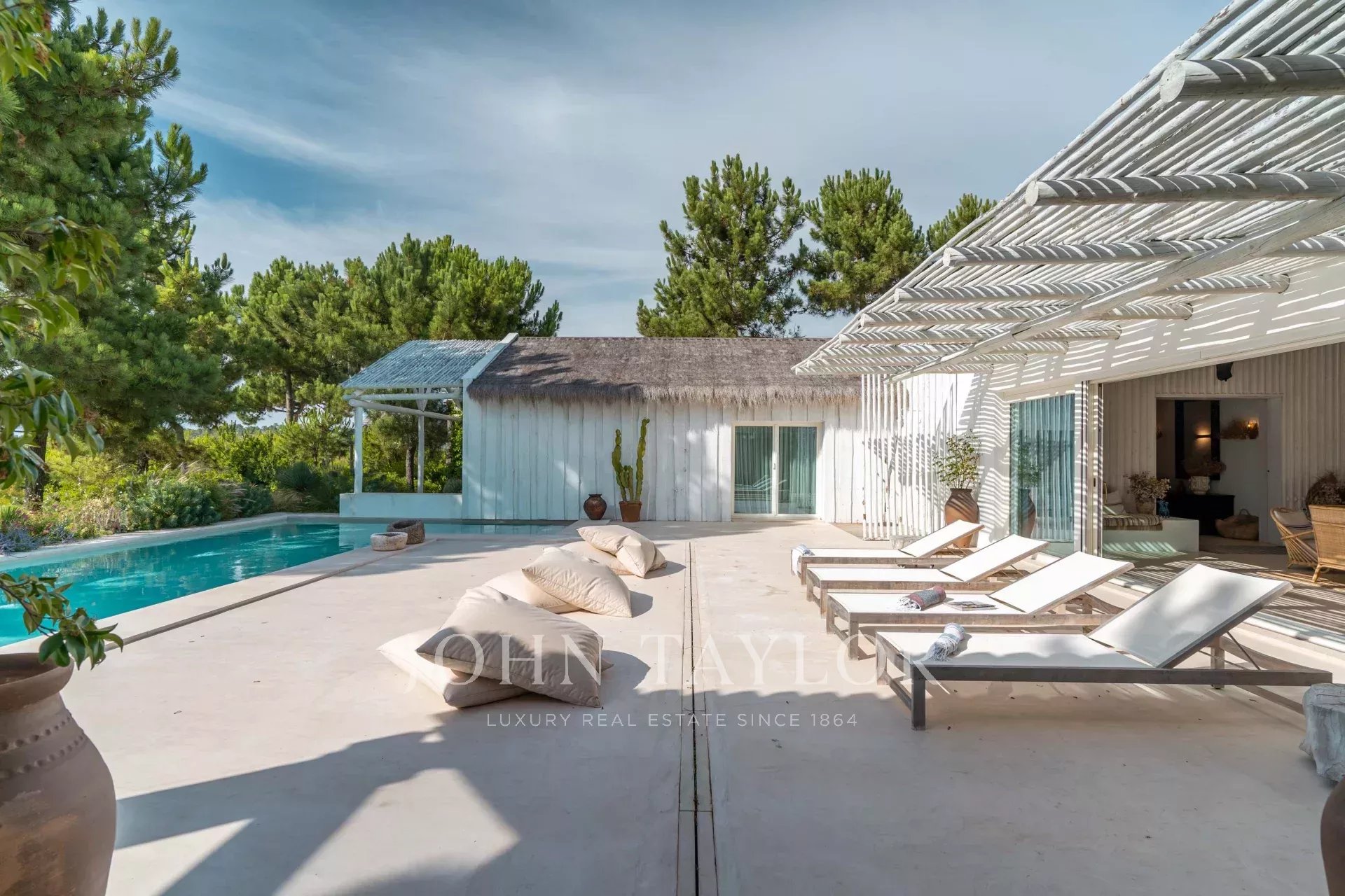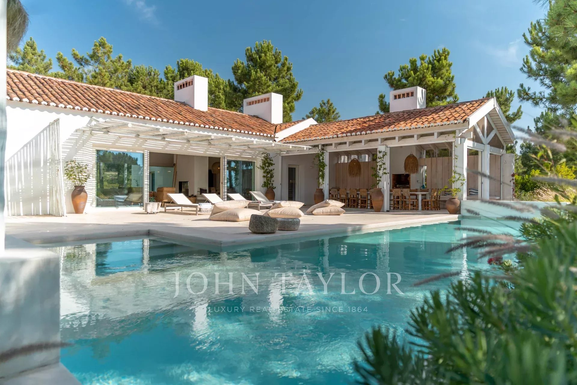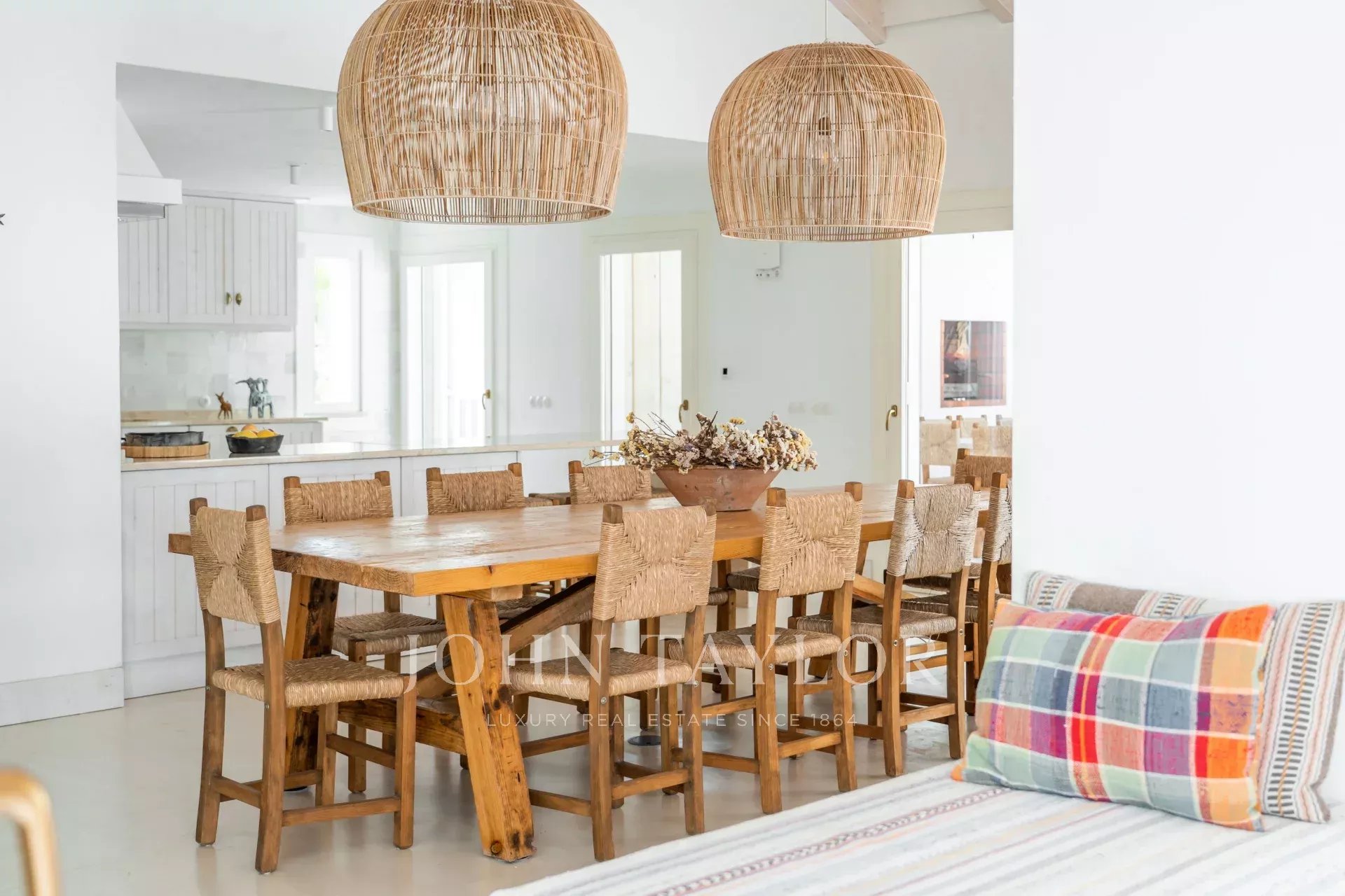 Les espaces intérieurs s'étendent naturellement vers l'extérieur, dans une ambiance chaleureuse et détendue. La cuisine entièrement équipée s'ouvre sur la véranda et la salle à manger en plein air, idéale pour les longs dîners d'été.