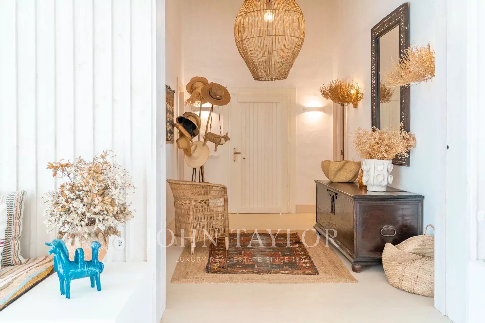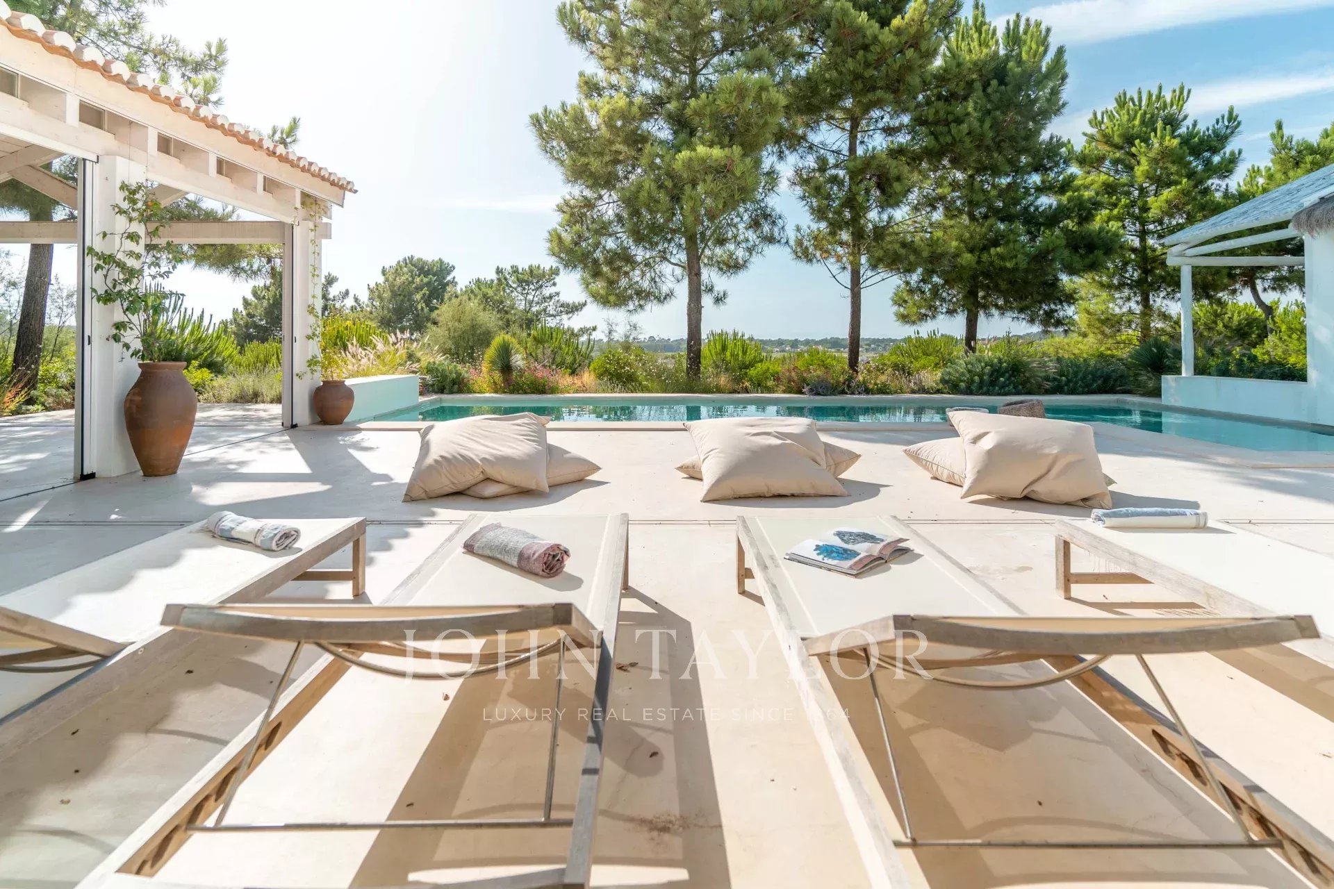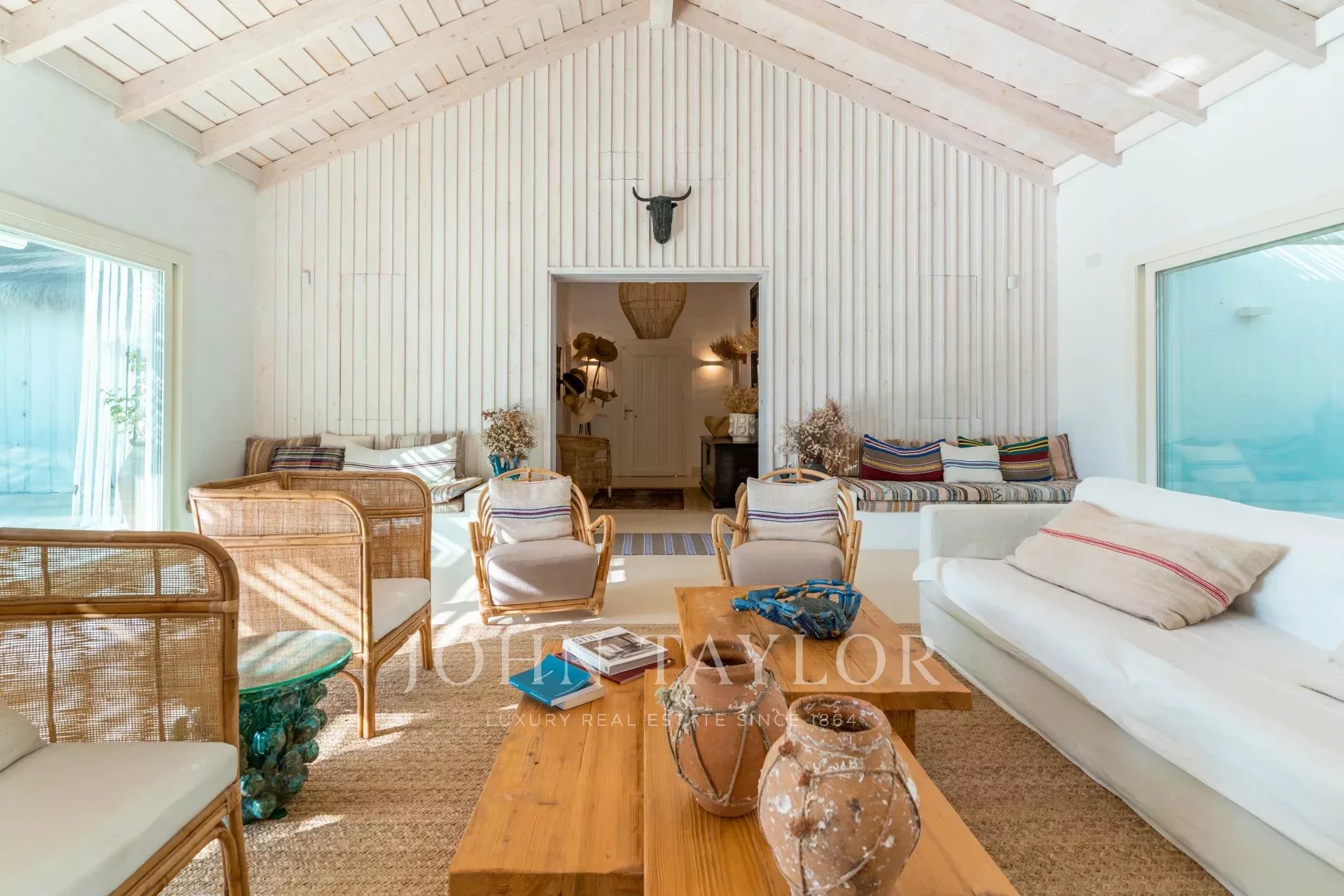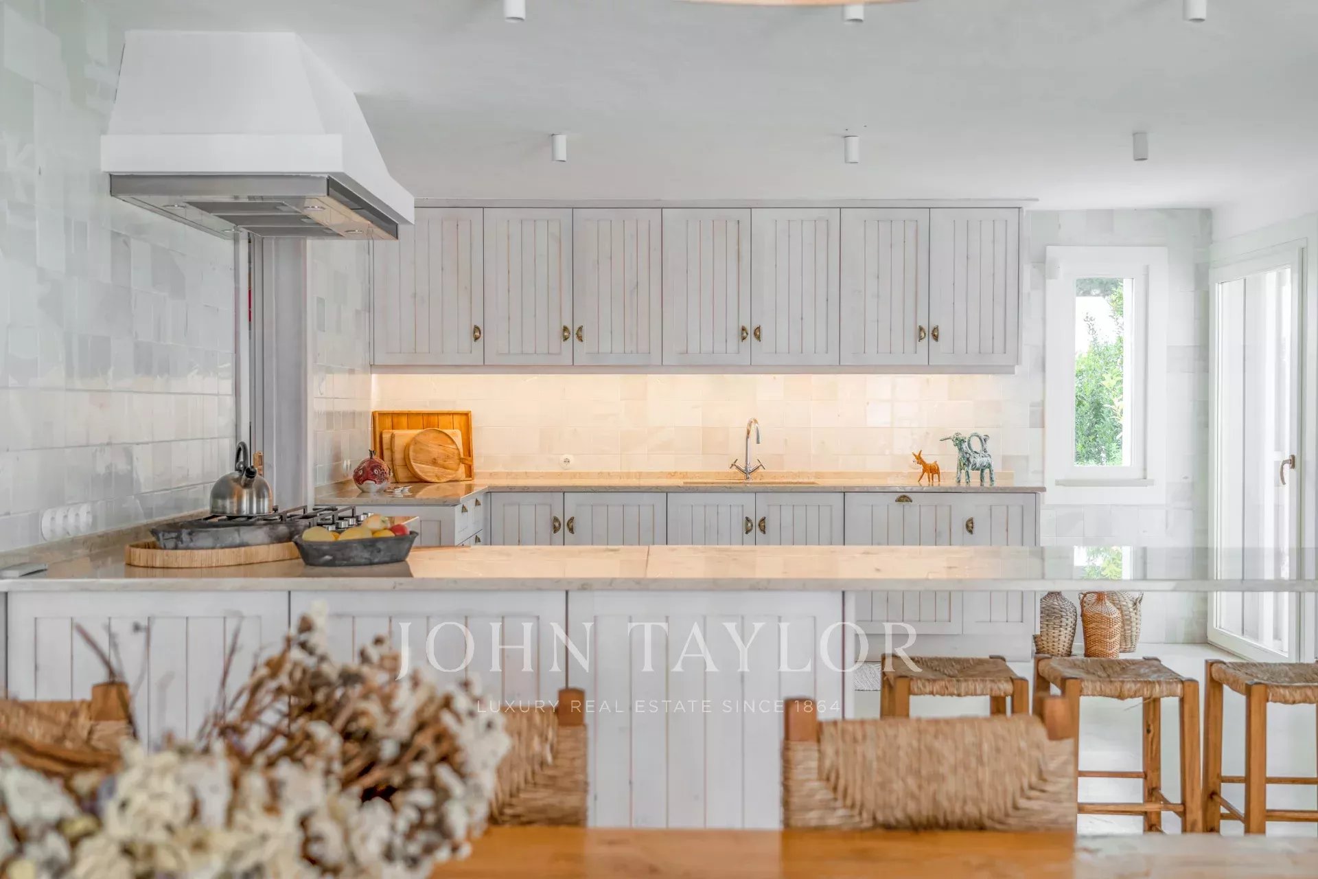 Les espaces intérieurs s'étendent naturellement vers l'extérieur, dans une ambiance chaleureuse et détendue. La cuisine entièrement équipée s'ouvre sur la véranda et la salle à manger en plein air, idéale pour les longs dîners d'été.