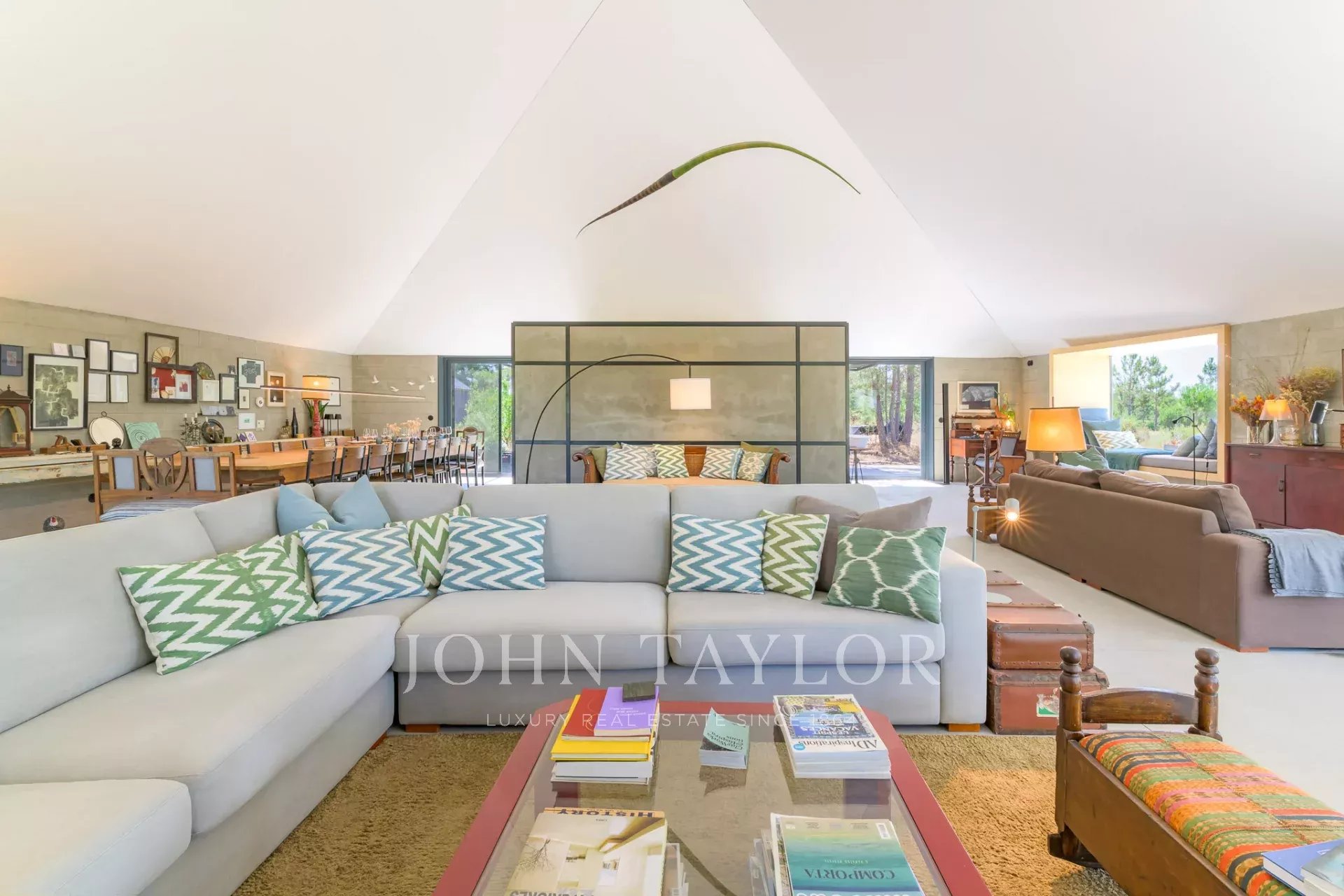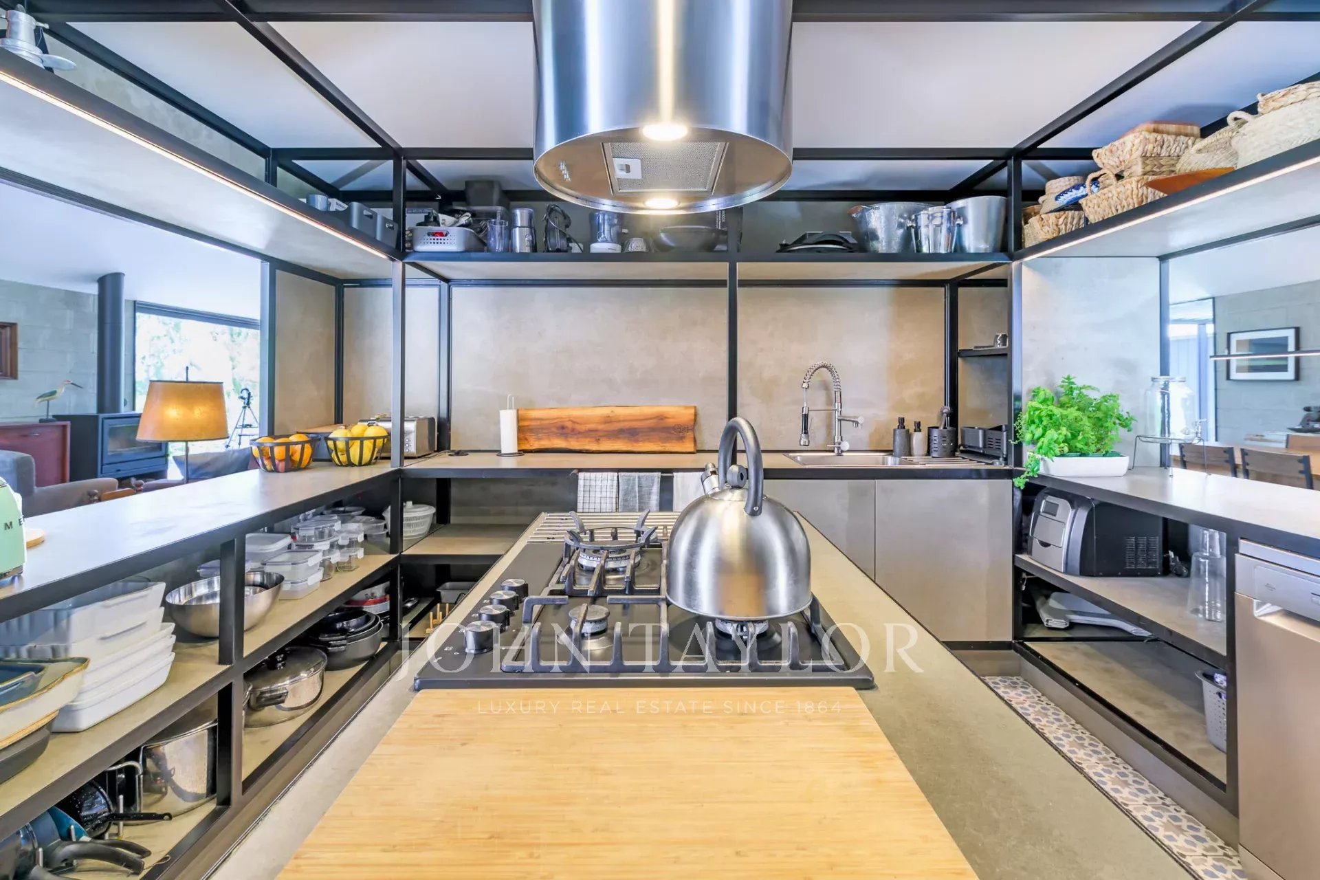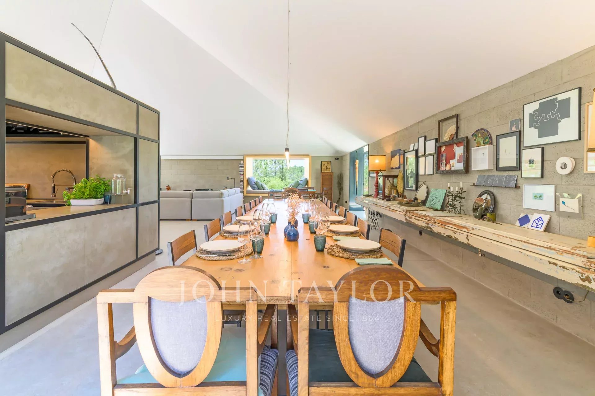 La partie commune comprend un grand espace de vie ouvert, en parfaite harmonie avec la nature. Une table à manger de 22 places invite à de longs repas conviviaux, tandis que la cuisine, située au centre, s’intègre sans imposer, créant une atmosphère détendue et fluide, même lors de la préparation des repas.