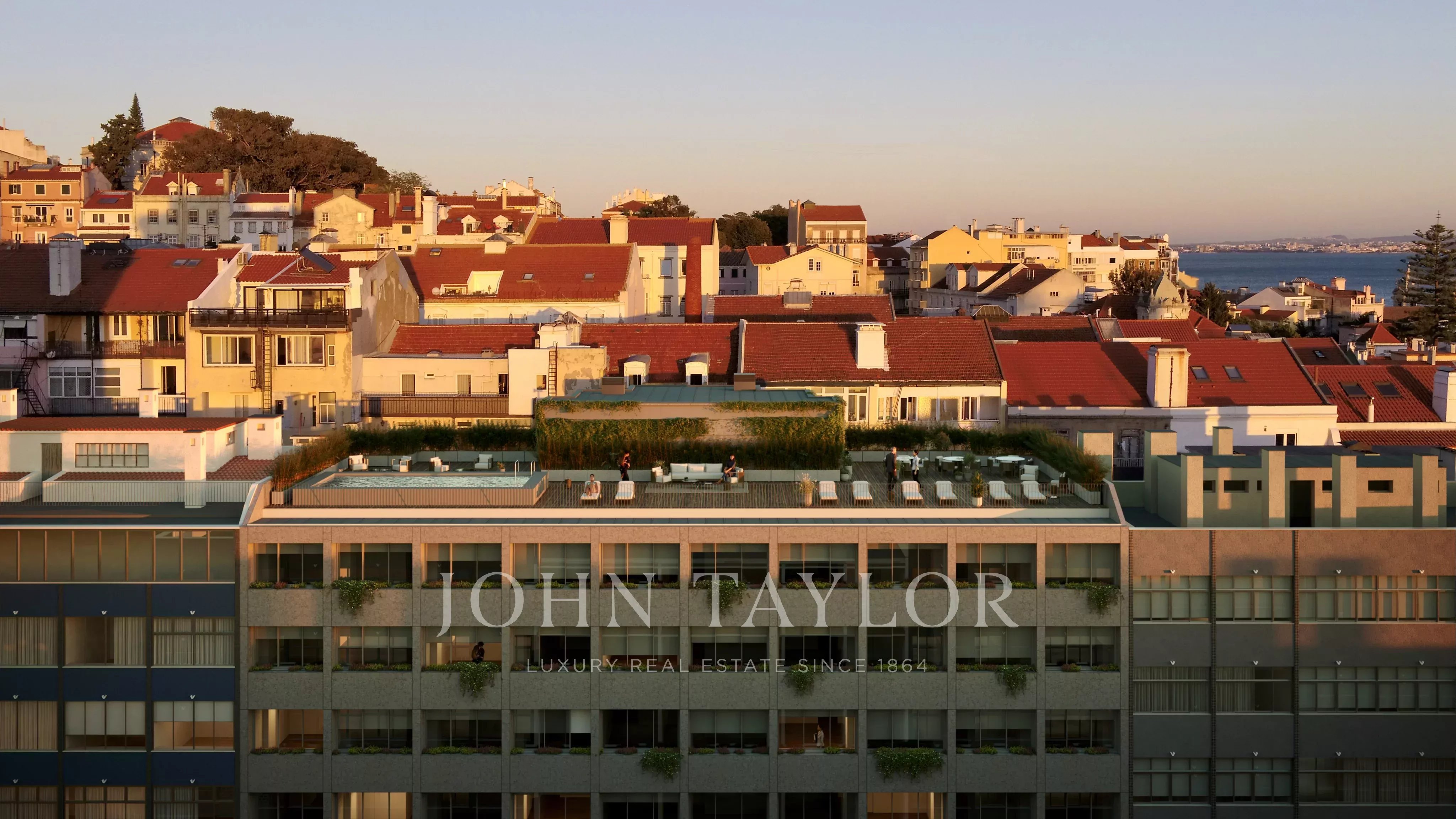 La copropriété Infante Residences dispose d'un accès exclusif à un élégant rooftop avec piscine et espace de loisirs, idéal pour profiter des vues panoramiques sur la capitale et le Tage.