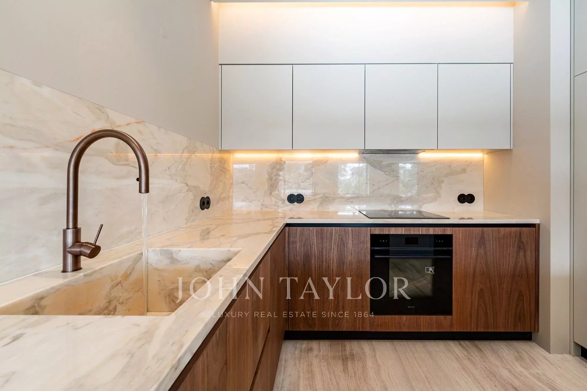 Conçue avec des lignes épurées et contemporaines, la cuisine est équipée d'appareils SMEG intégrés, garantissant une qualité et une performance excellentes. L'éclairage LED intégré sous les armoires supérieures et dans le plafond met en valeur les matériaux et crée une atmosphère moderne et raffinée, rendant l'espace à la fois élégant et très fonctionnel pour la vie de tous les jours.