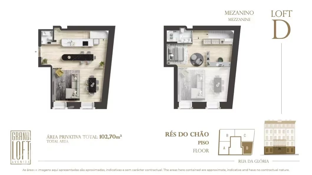 Ce Loft d'une chambre a une surface brute couverte de 102,70 m2 et une vue sur la typique Rua da Glória.