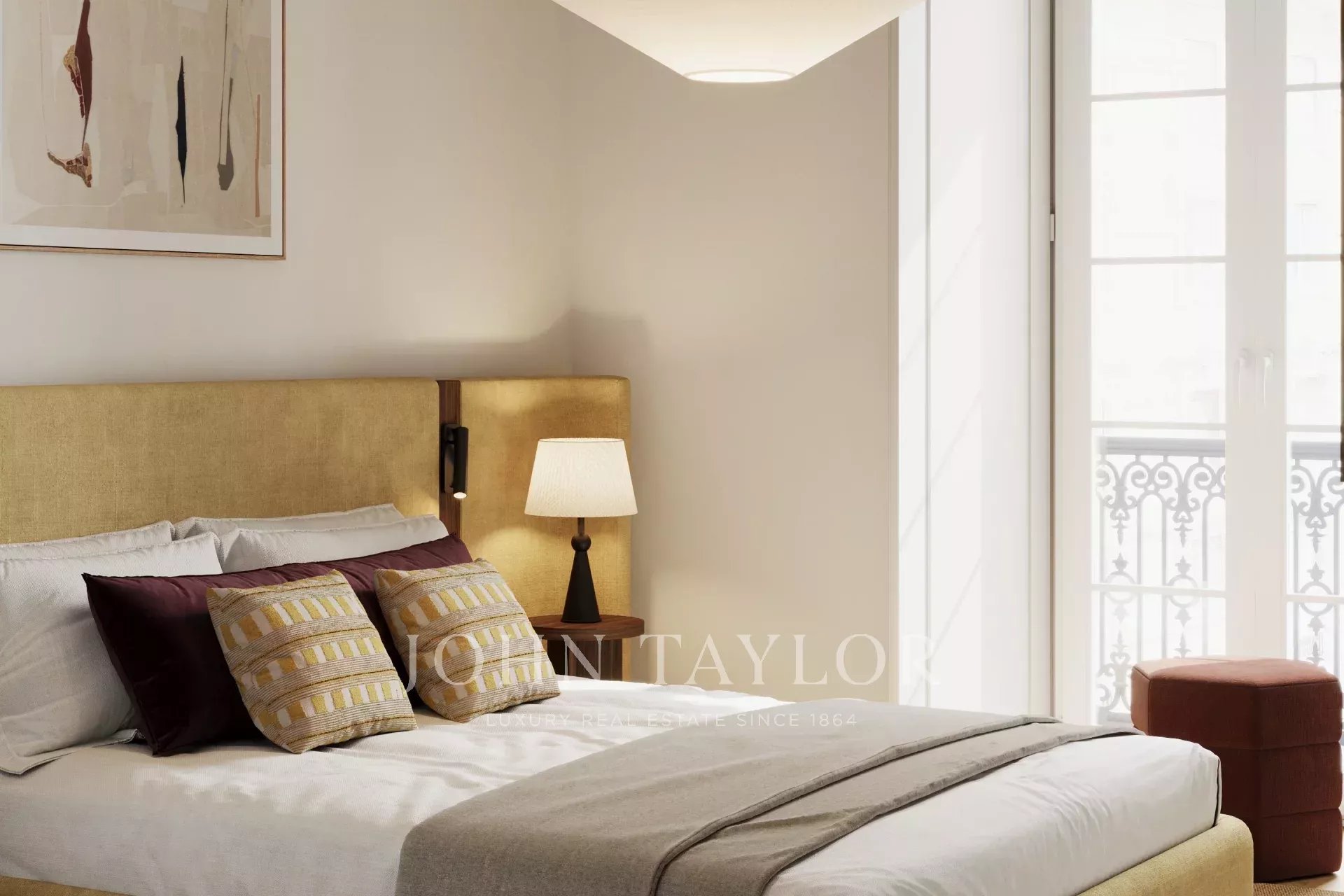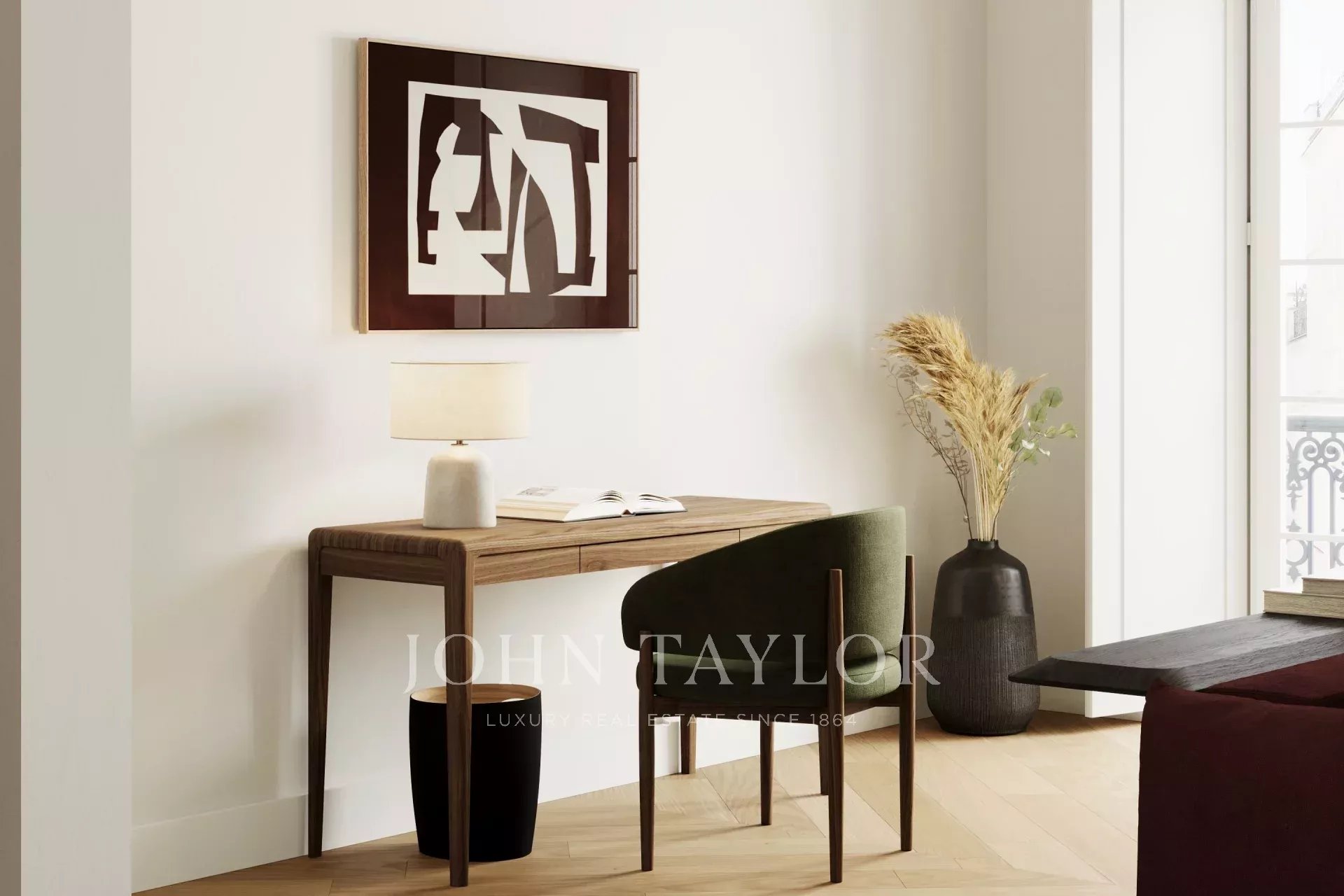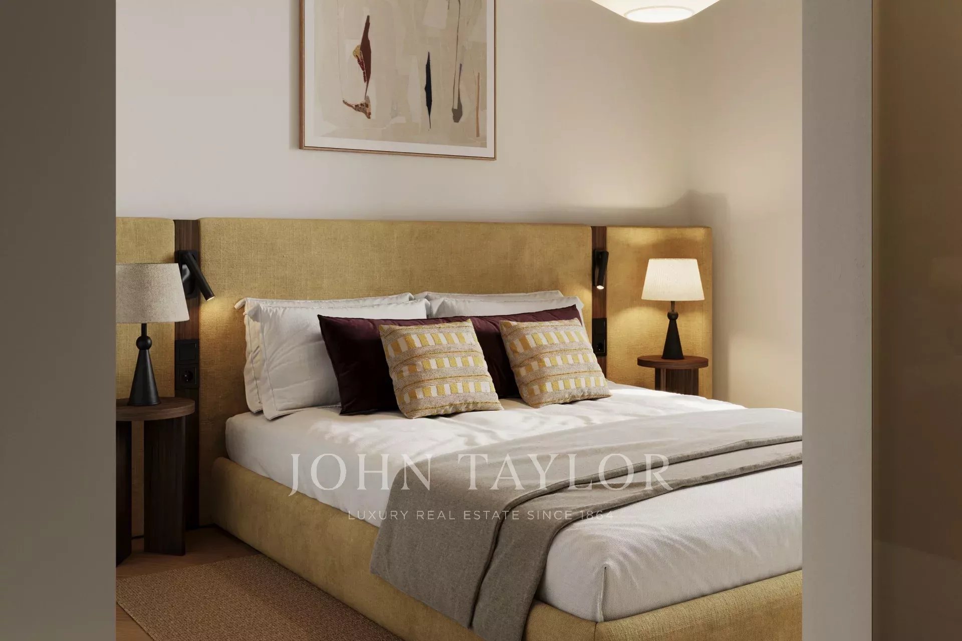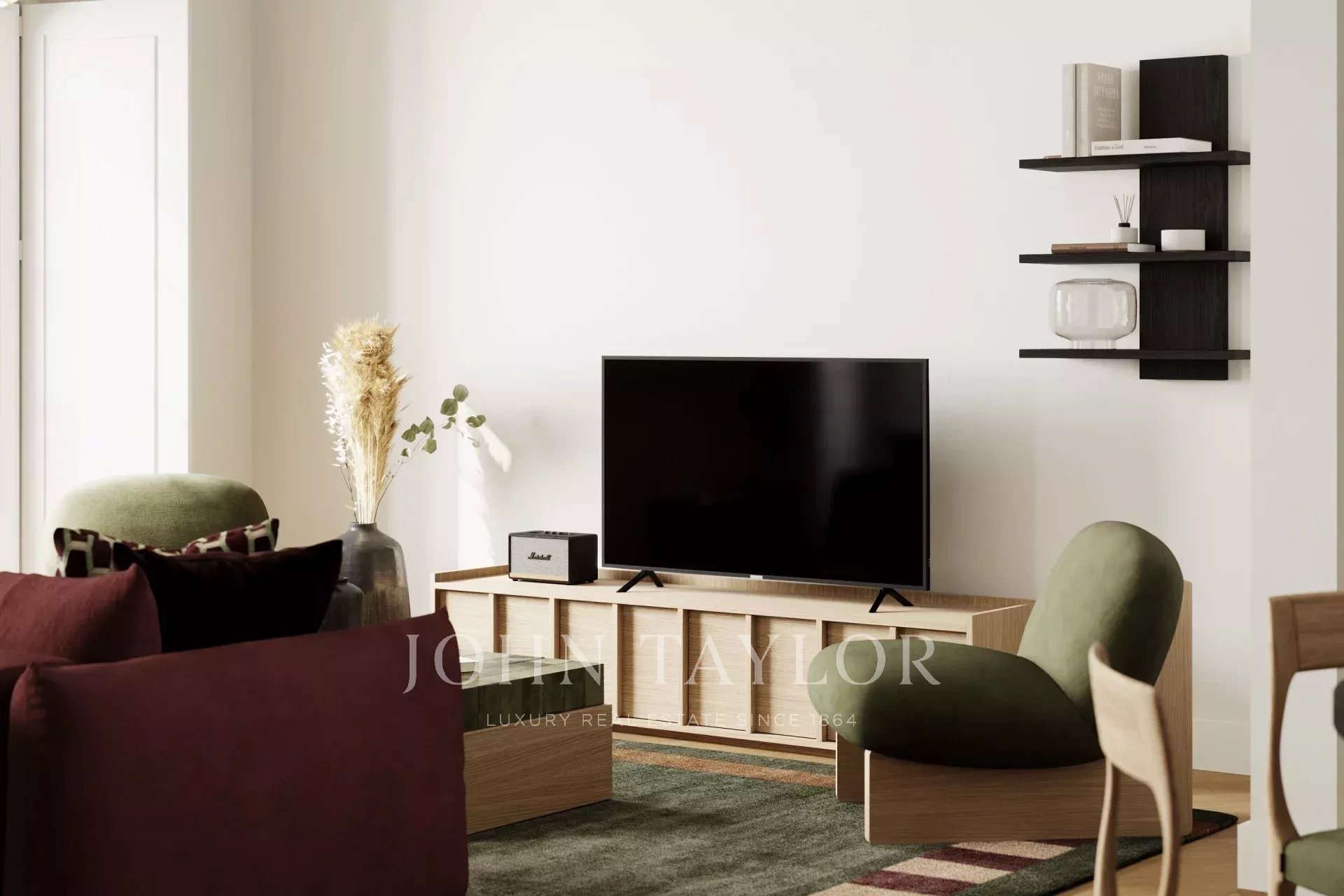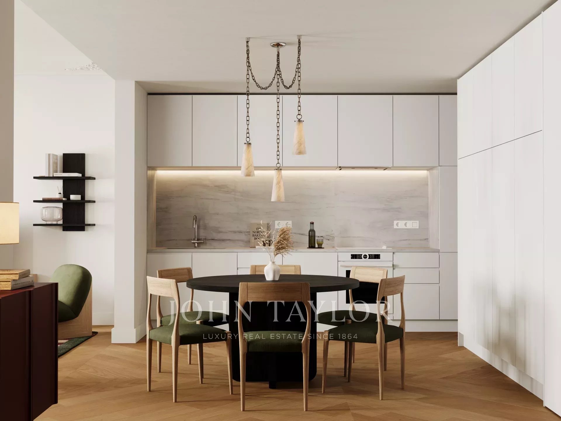 L'appartement s'ouvre sur un hall d'entrée généreux qui dessert une cuisine ouverte, une salle à manger et un espace de vie, avec un salon sur le côté. En face de l'espace social se trouvent la buanderie, une salle de bains pour les invités et deux chambres avec salle de bains et placards intégrés, dont l'une s'ouvre directement sur une terrasse.