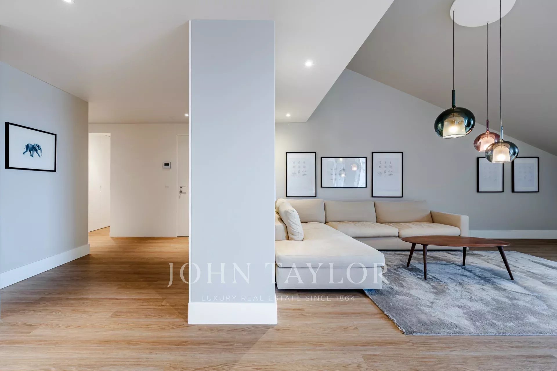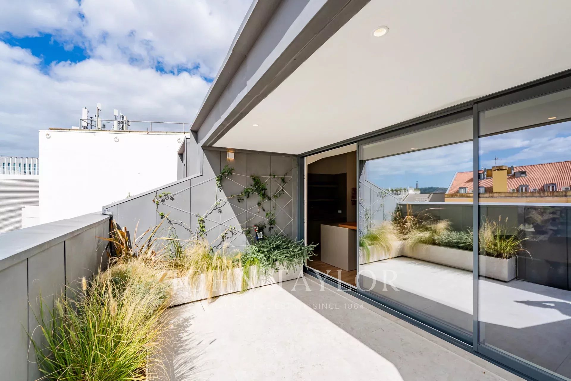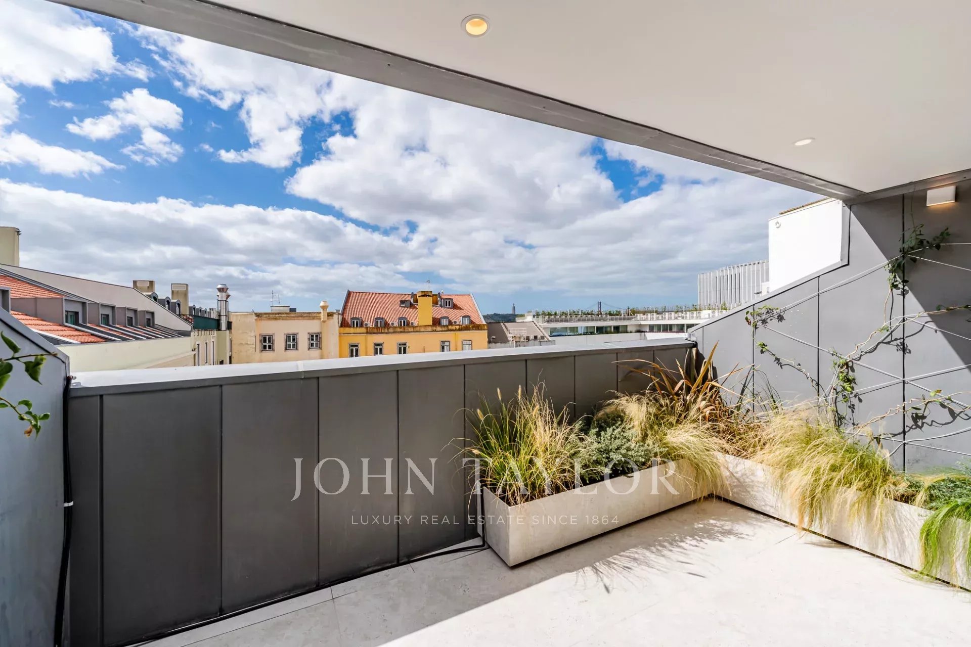 L'agencement ouvert, mis en valeur par de grandes fenêtres coulissantes, apporte une lumière naturelle abondante et crée une atmosphère lumineuse et accueillante. Une terrasse privée avec éclairage extérieur offre une vue panoramique sur la ville et le pont du 25 avril.