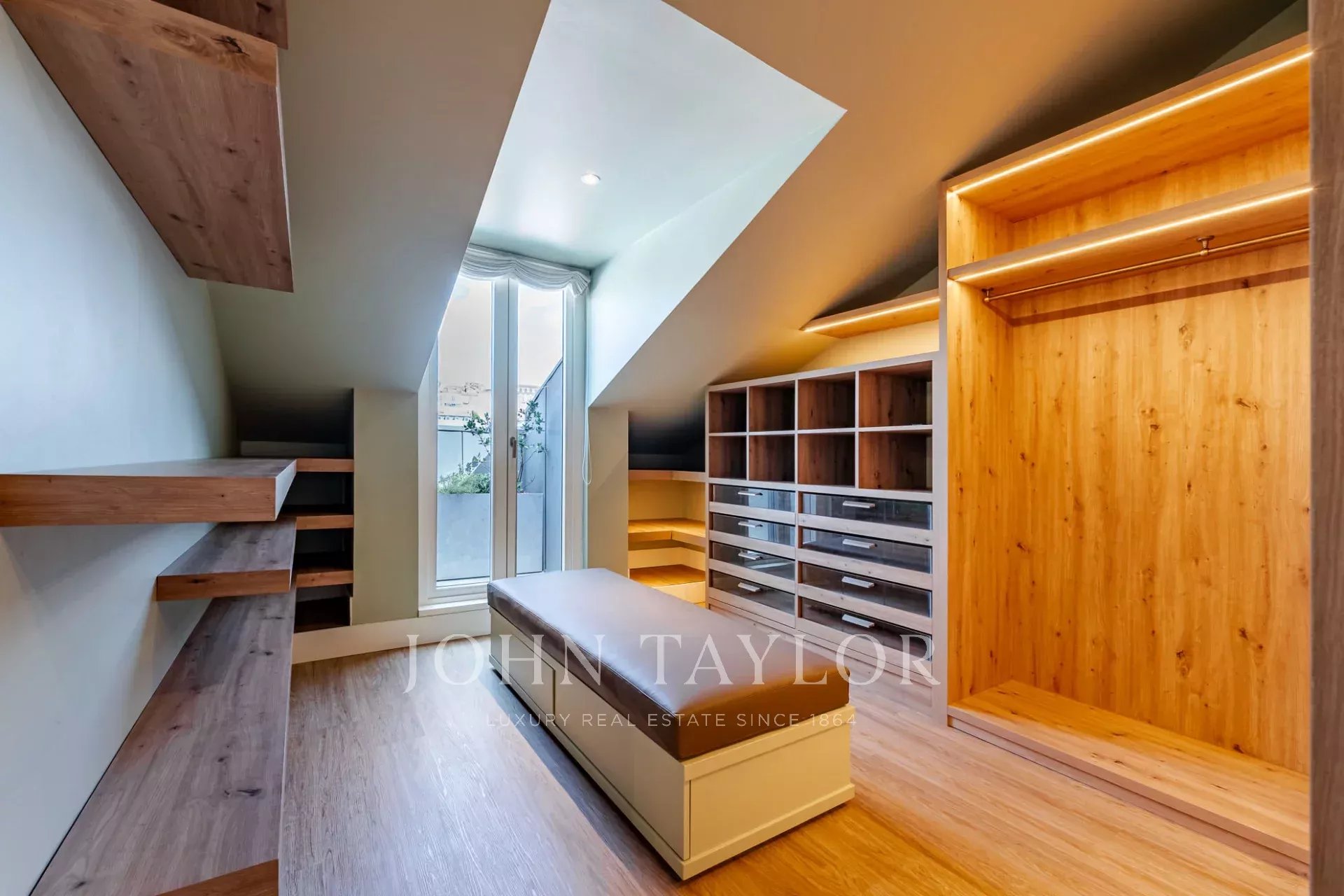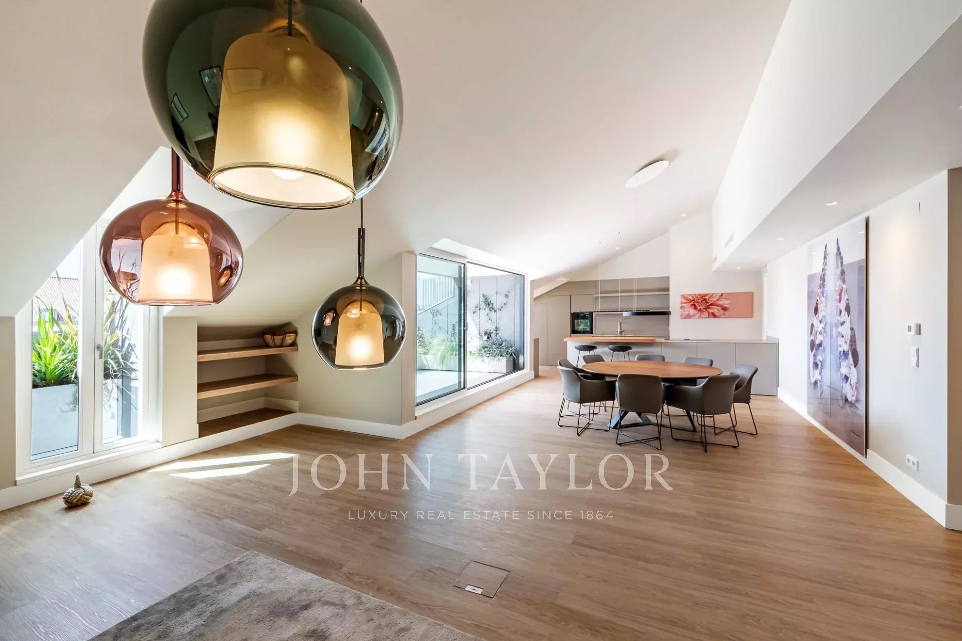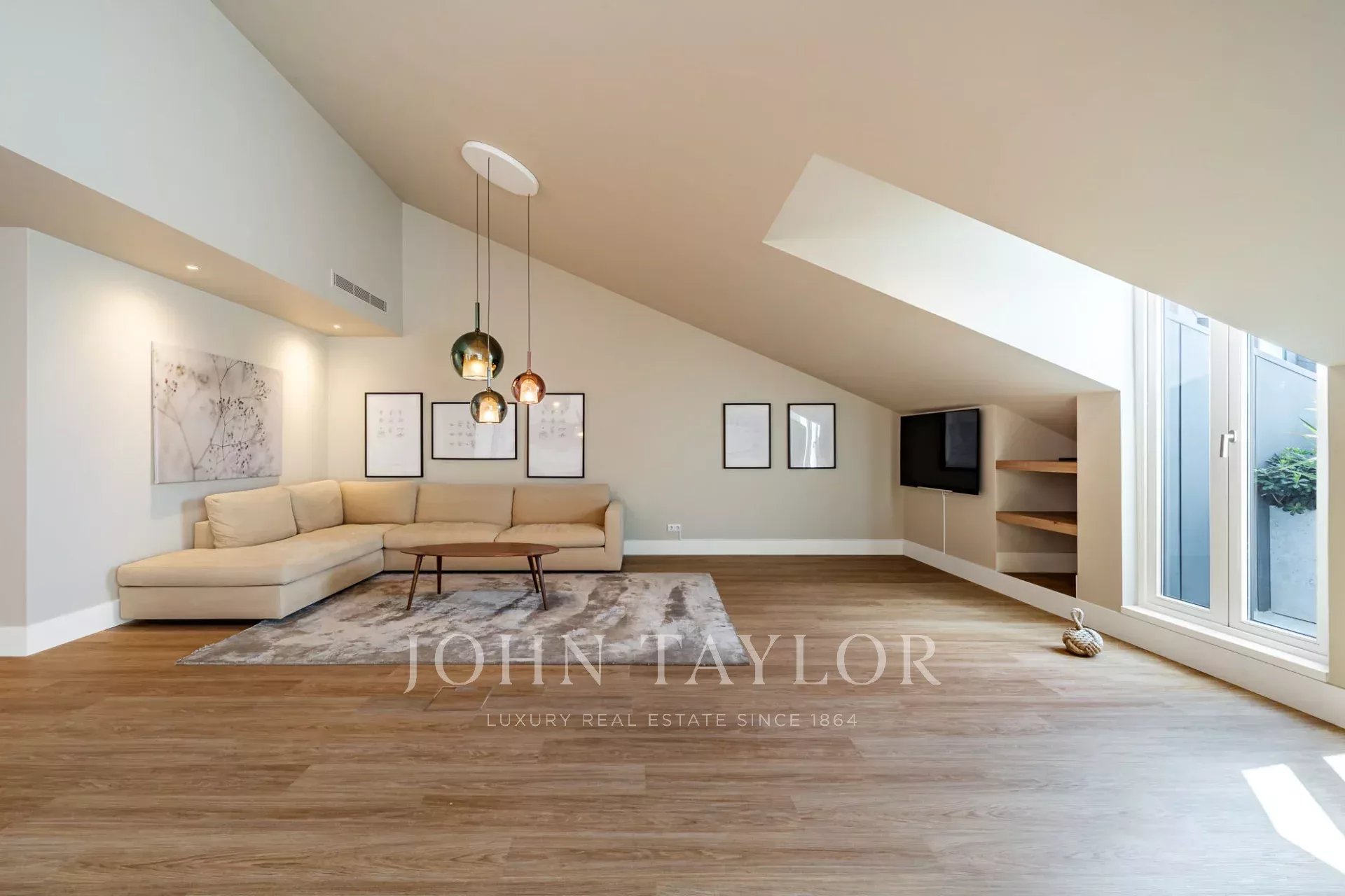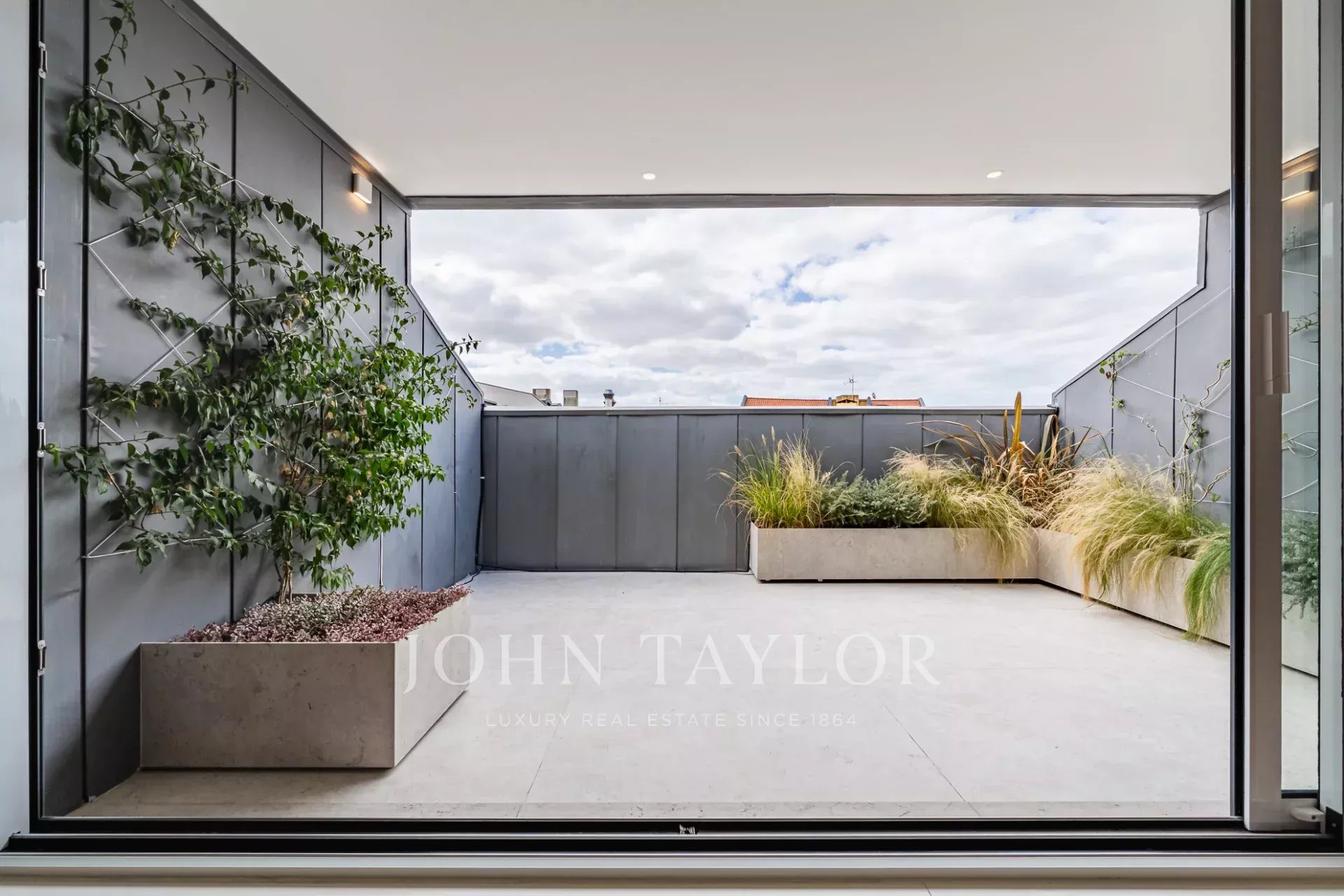 L'agencement ouvert, mis en valeur par de grandes fenêtres coulissantes, apporte une lumière naturelle abondante et crée une atmosphère lumineuse et accueillante. Une terrasse privée avec éclairage extérieur offre une vue panoramique sur la ville et le pont du 25 avril.