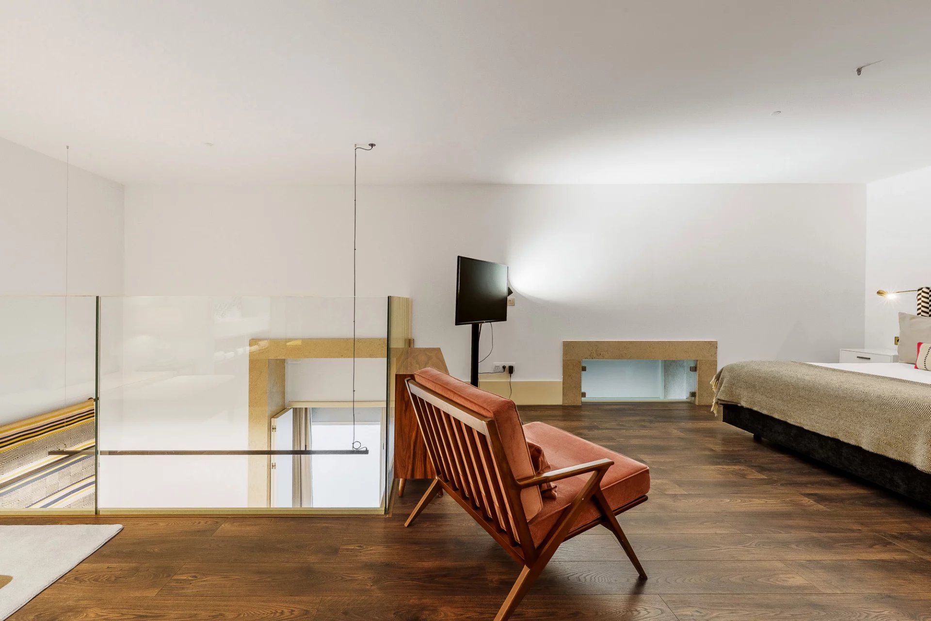 Entièrement meublé et équipé, l’appartement présente un espace ouvert avec mezzanine, une suite avec lit double, une cuisine entièrement équipée, deux salles de bains complètes, ainsi qu’un espace de rangement et un parking privé.
