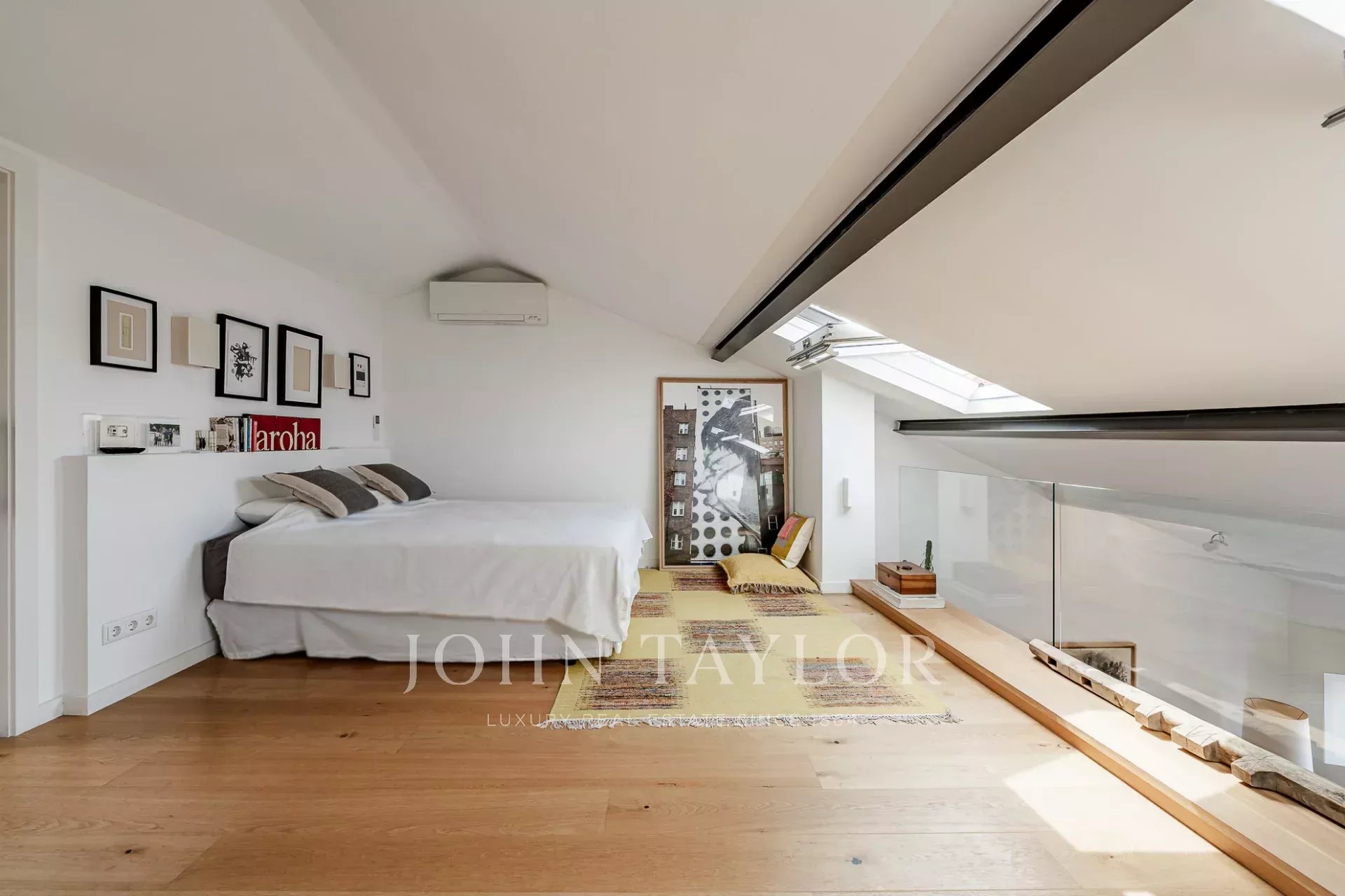 À l'étage, la généreuse suite parentale bénéficie d'une orientation sud, inondant l'espace de lumière naturelle et offrant des vues spectaculaires sur le fleuve Tejo. Les hauts plafonds et les grandes fenêtres de l'appartement créent une atmosphère lumineuse et aérée.