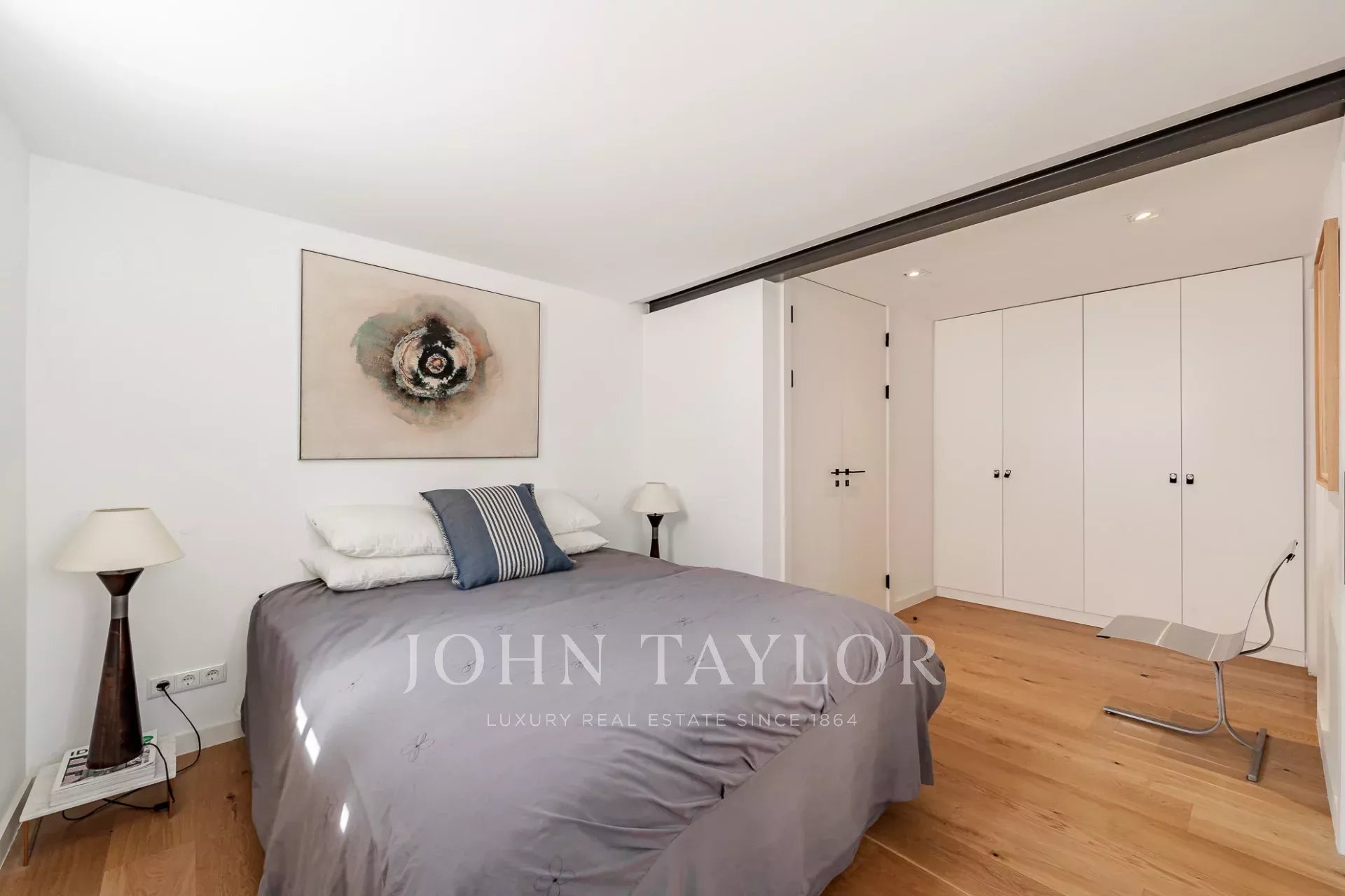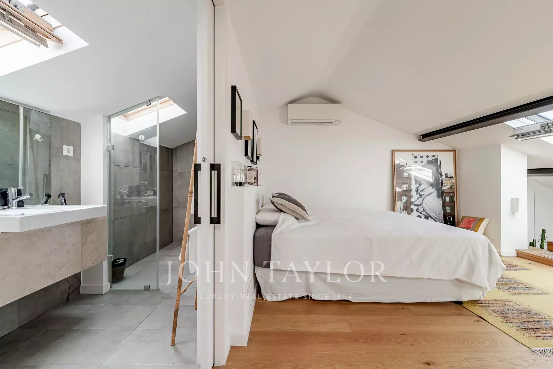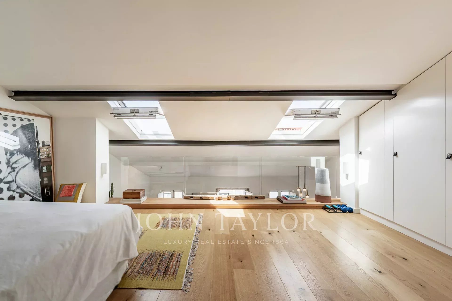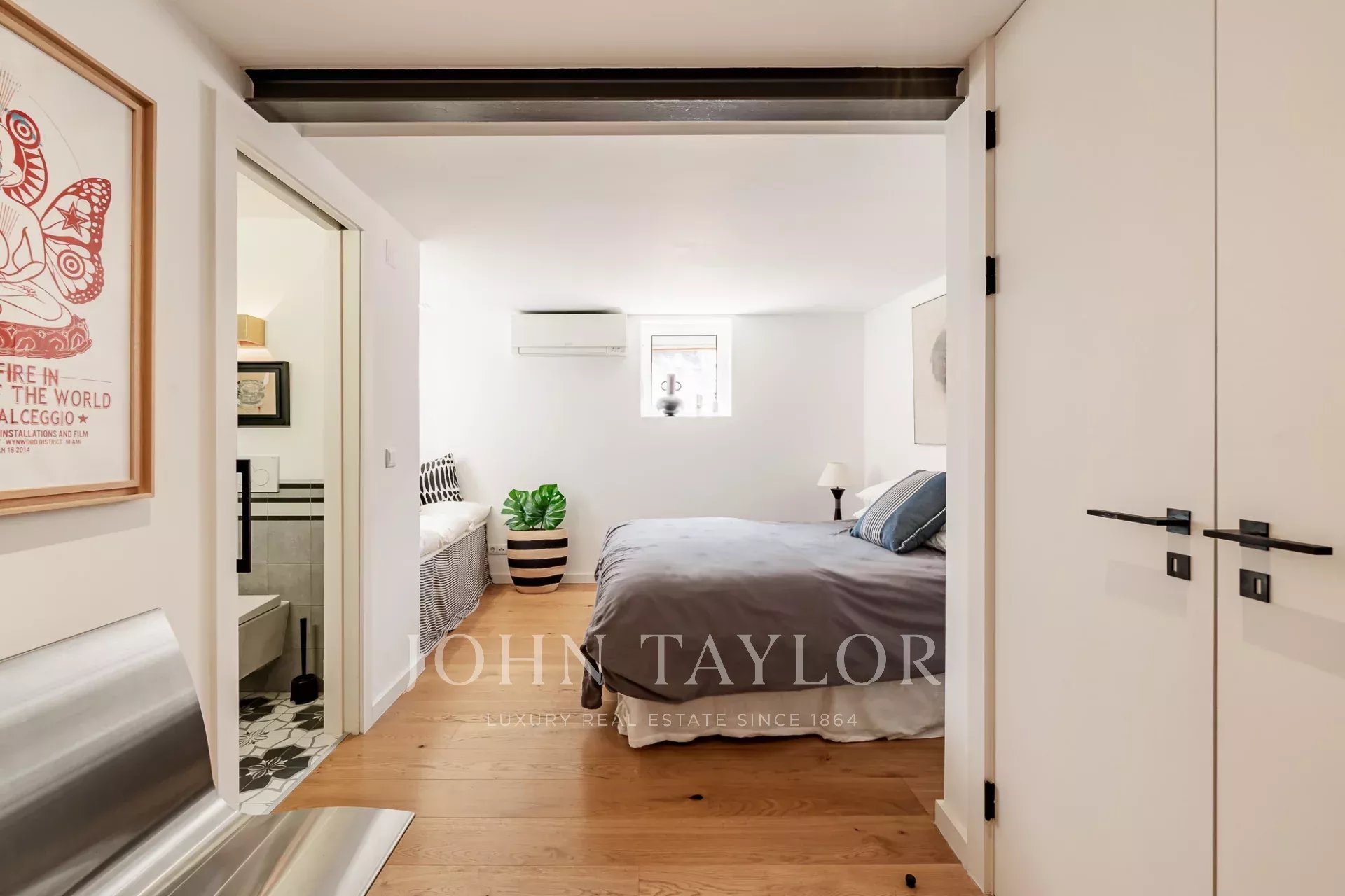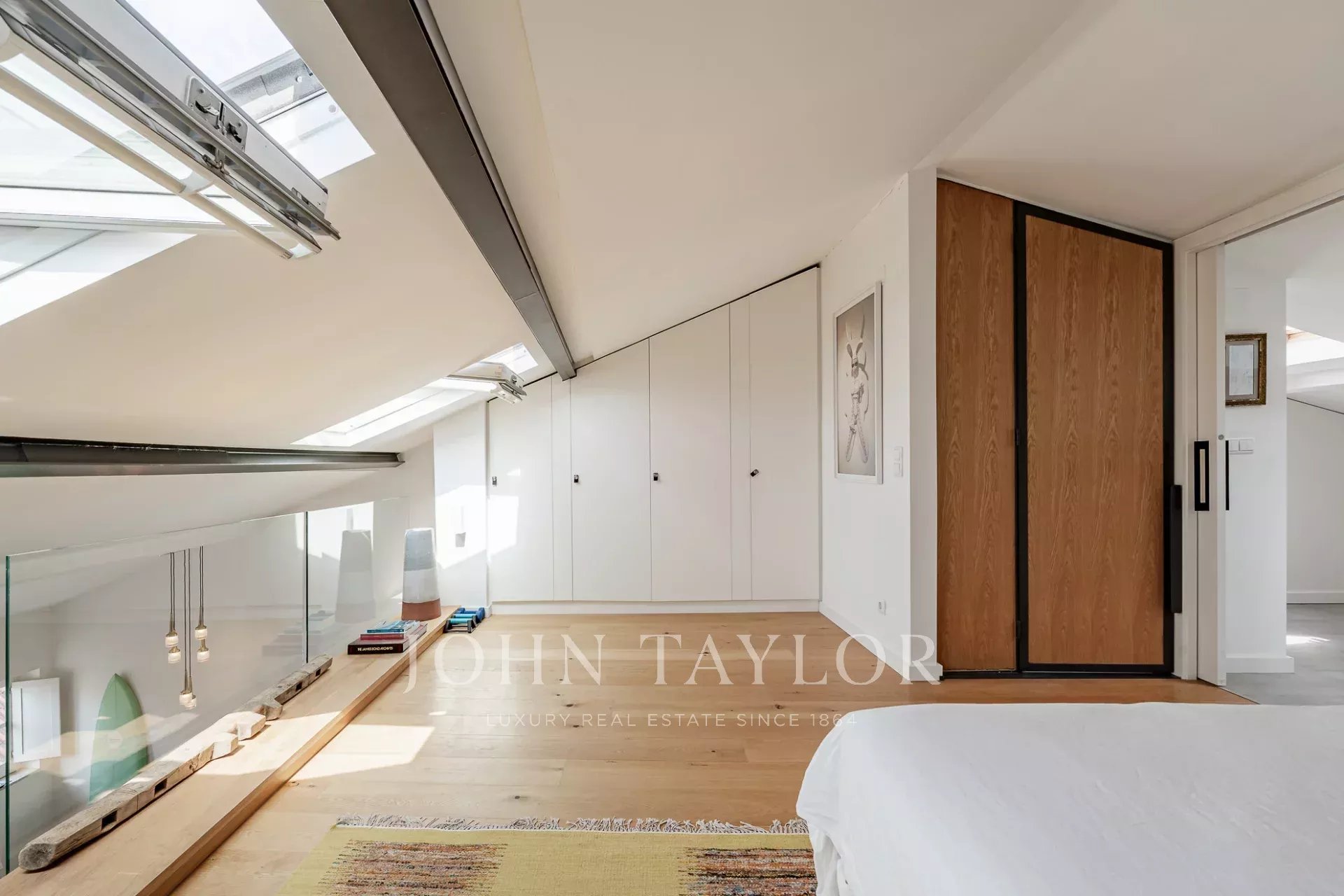 À l'étage, la généreuse suite parentale bénéficie d'une orientation sud, inondant l'espace de lumière naturelle et offrant des vues spectaculaires sur le fleuve Tejo. Les hauts plafonds et les grandes fenêtres de l'appartement créent une atmosphère lumineuse et aérée.