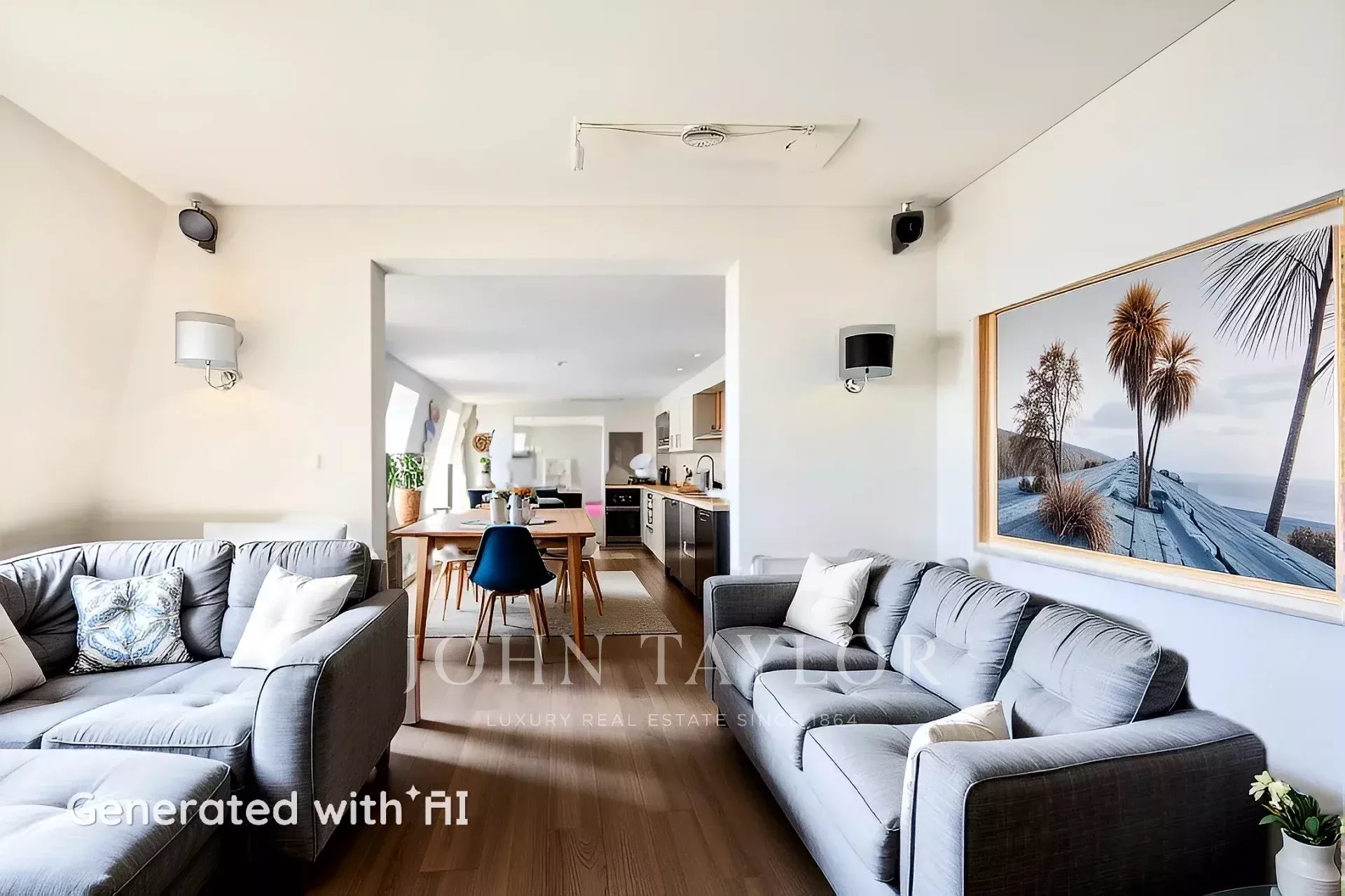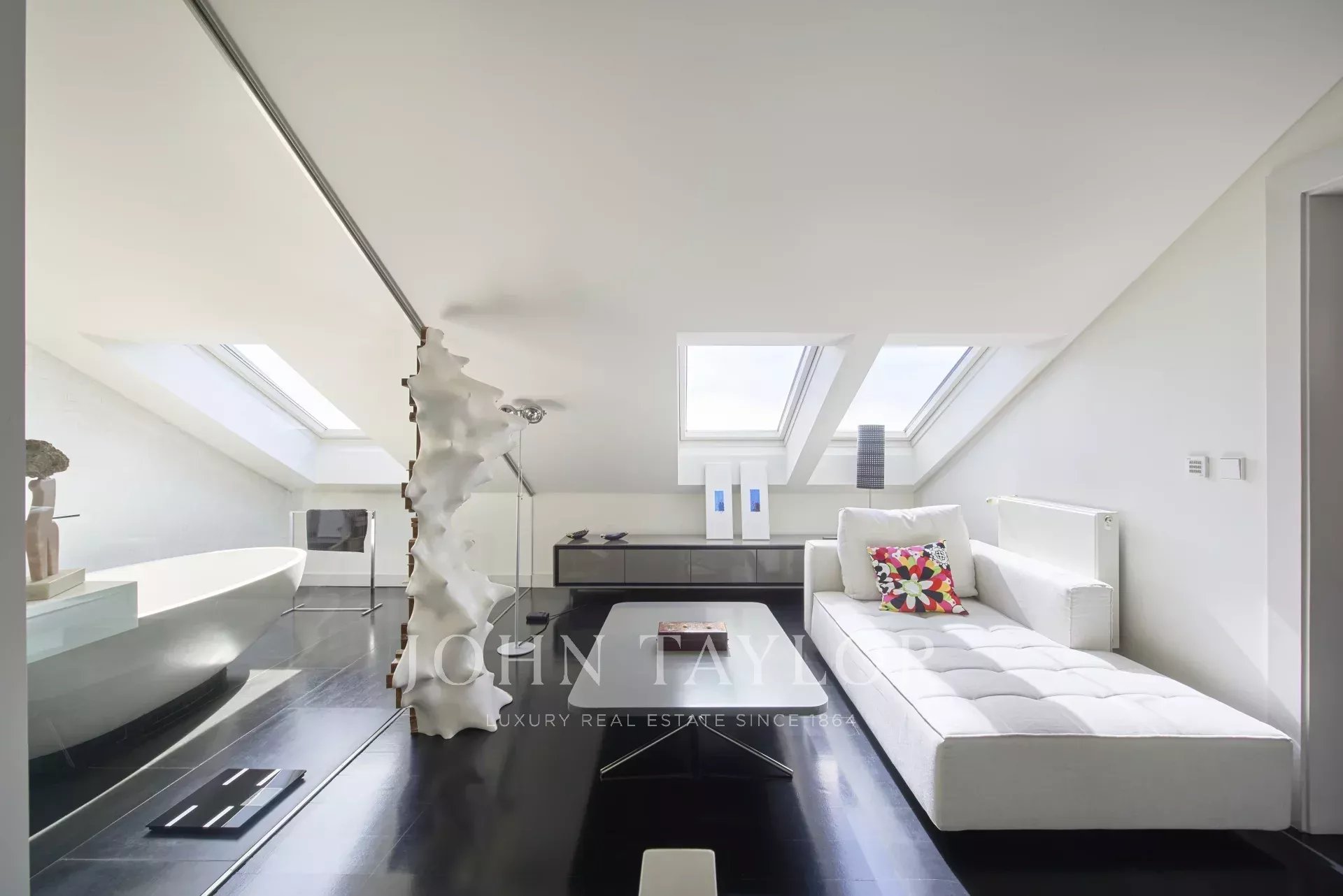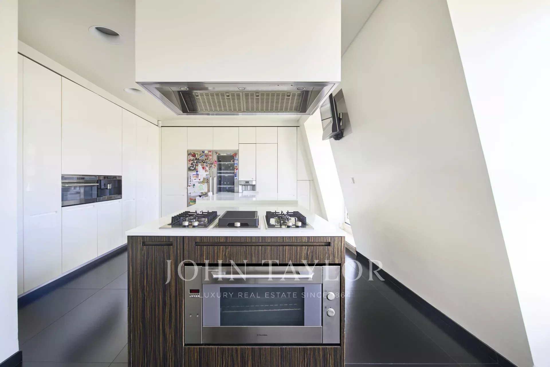 La partie nuit comprend deux chambres en suite, dont une somptueuse suite parentale avec salle de bains vitrée, baignoire sculpturale sous une lucarne et grand dressing. Deux chambres supplémentaires offrent une grande flexibilité, l’une d’elles ayant été aménagée en salle de sport privée. La cuisine est actuellement en cours de réalisation, permettant au futur propriétaire de la personnaliser selon ses goûts.