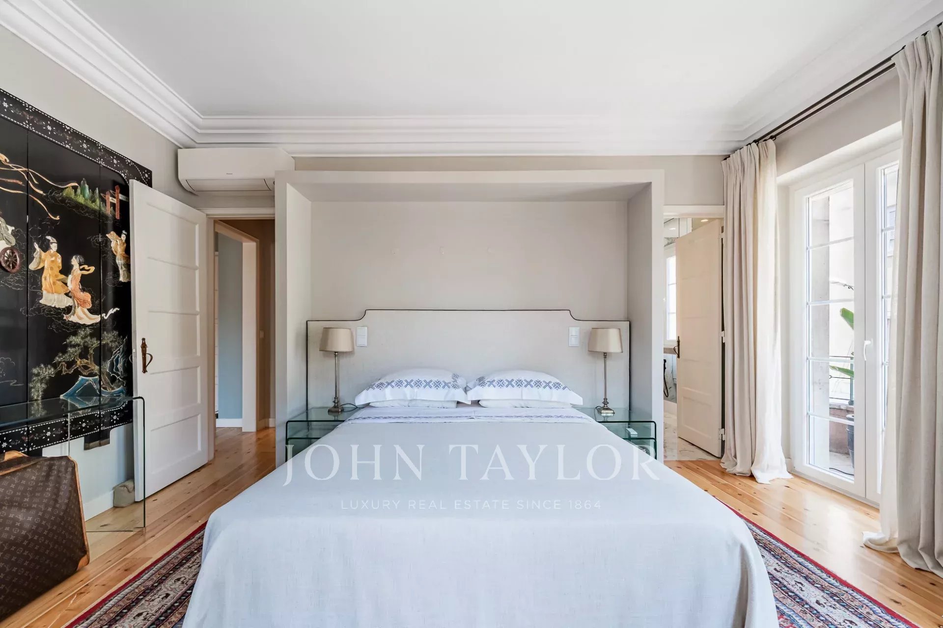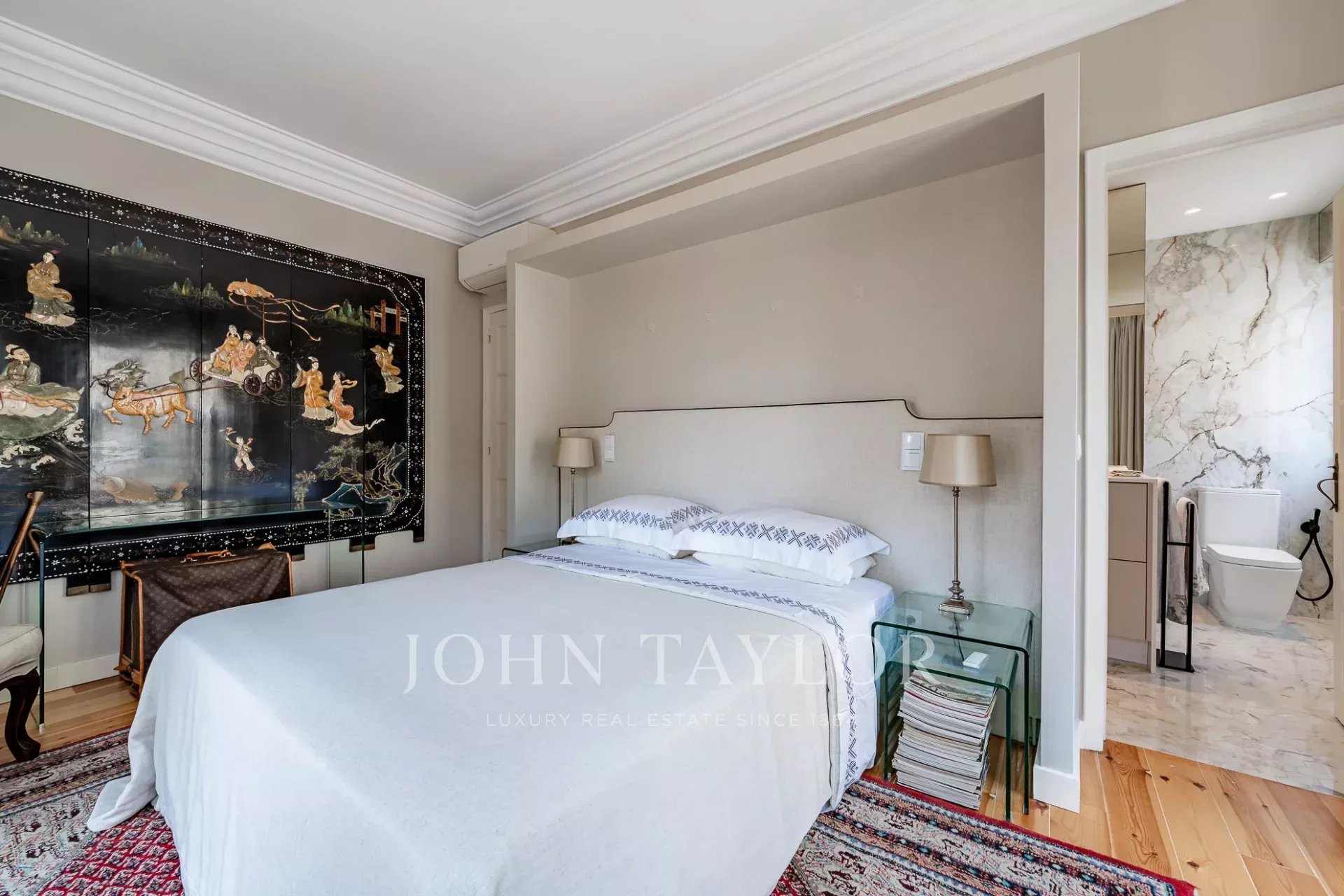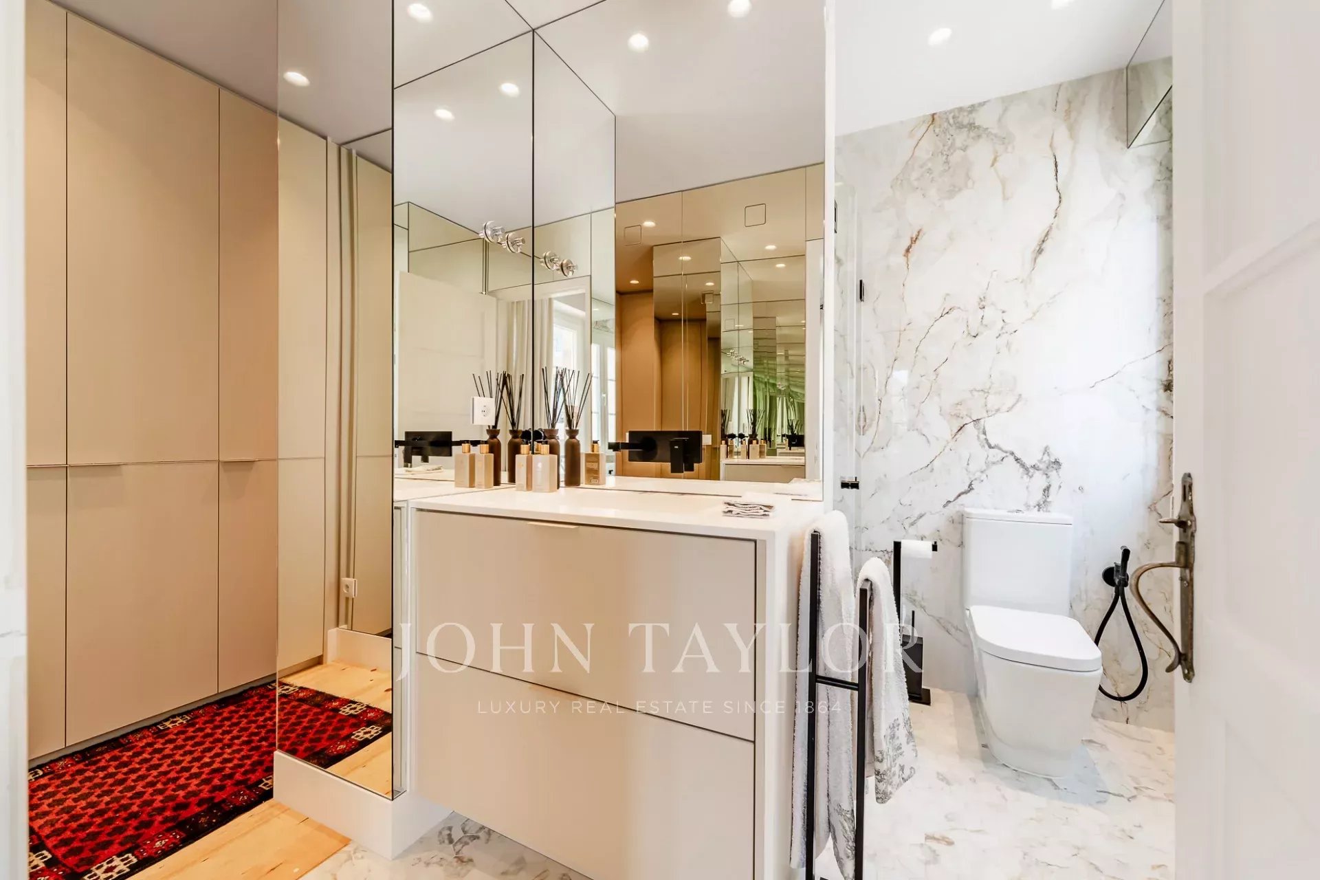Dans la partie privée, la suite principale se distingue par sa luminosité généreuse, renforcée par trois fenêtres, et dispose d'un dressing et d'une salle de bains en marbre, offrant à la fois confort et intimité. La deuxième suite comprend des armoires encastrées et une salle de bains également en marbre, conservant le même niveau élevé de matériaux et de finitions.
