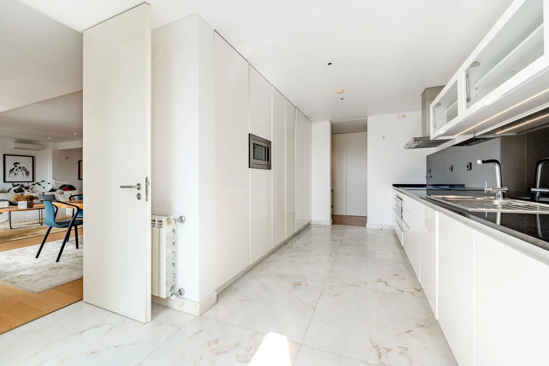 La zone sociale comprend un salon et une salle à manger spacieux qui s'ouvrent parfaitement sur les terrasses, tandis que la cuisine moderne et entièrement équipée complète l'espace.